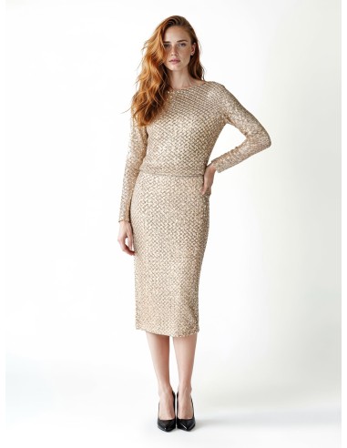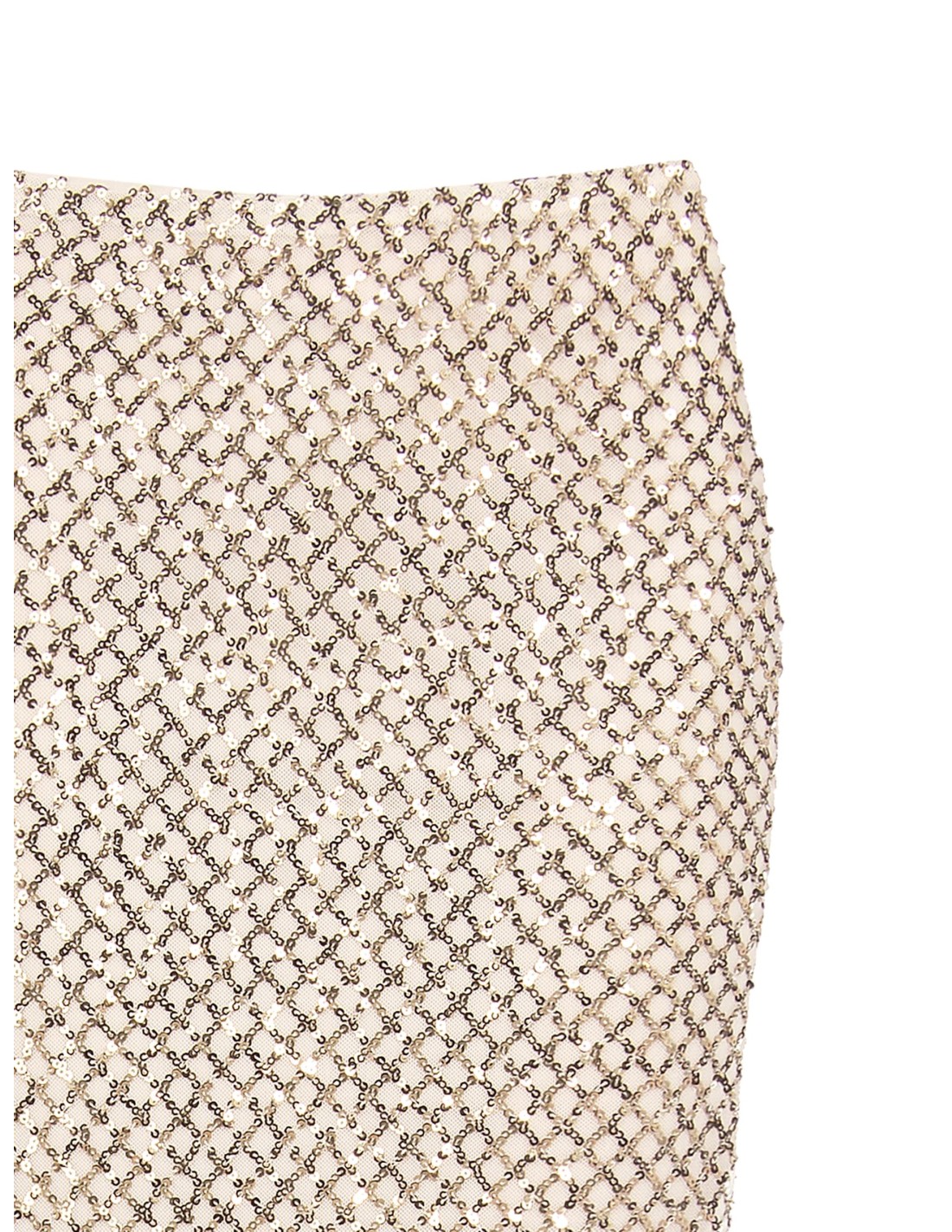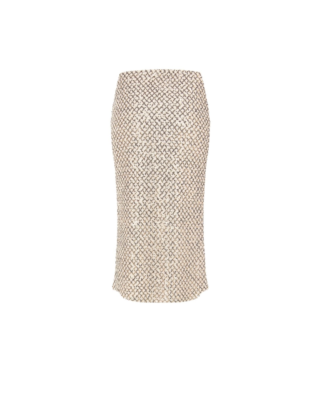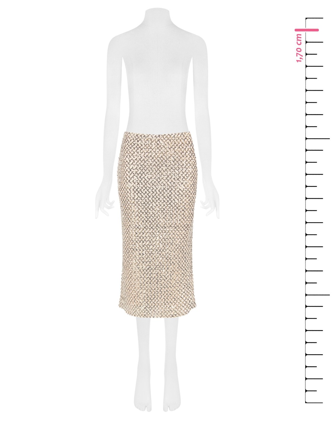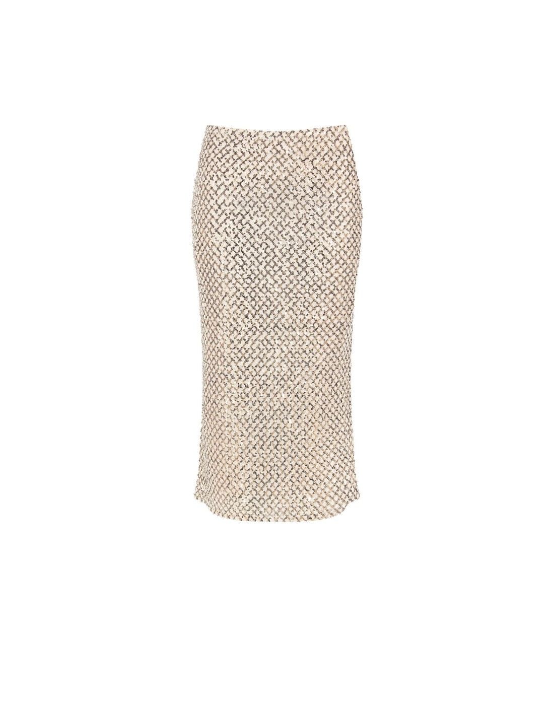 Rinascimento. Silhueta midi justa que alonga, confortável graças à base stretch. Tecido bordado com lantejoulas por todo o lado com padrão geométrico. Fenda posterior para liberdade de movimento e cintura limpa sem costuras à vista. Perfeita para festas, jantares elegantes e cerimónias.