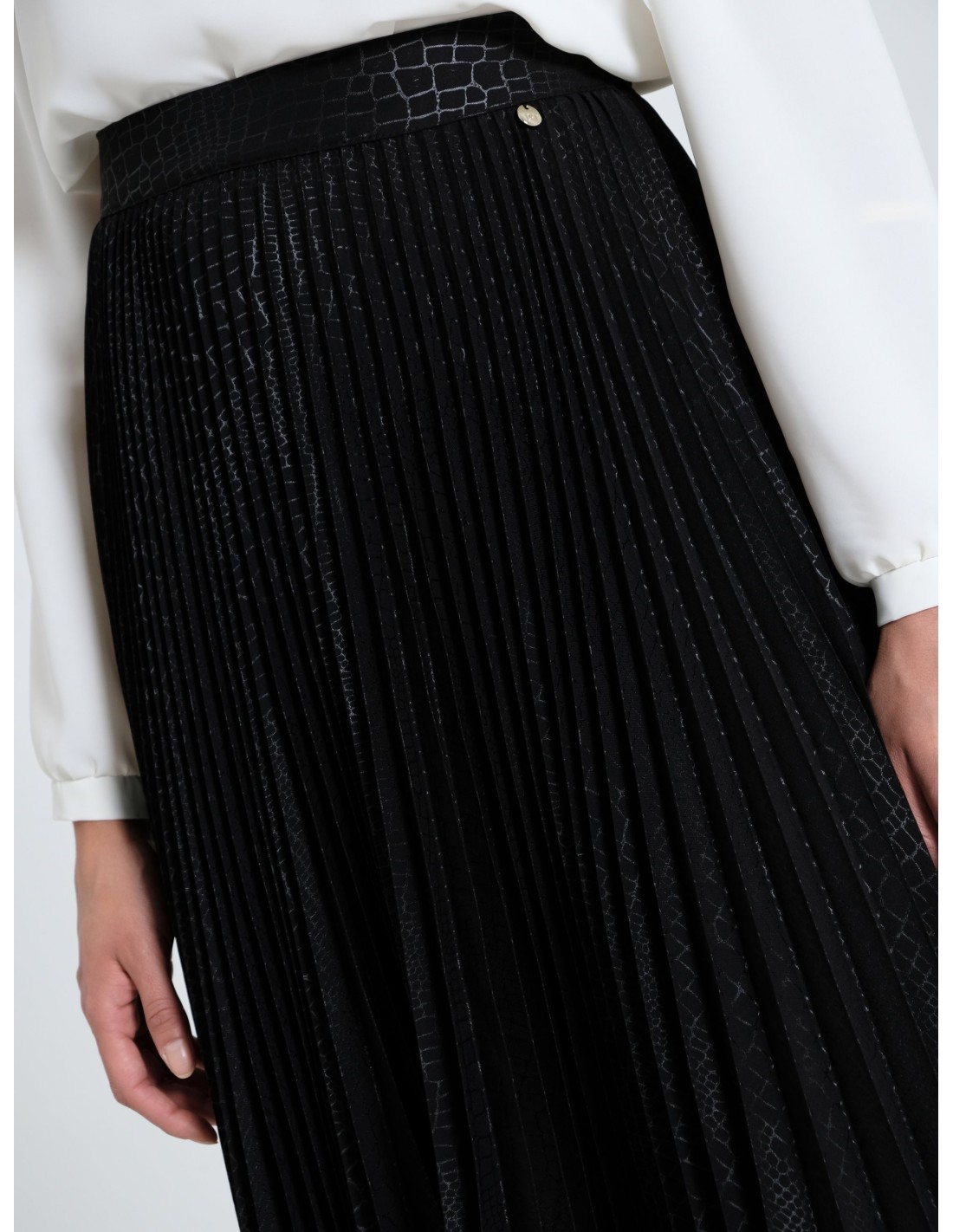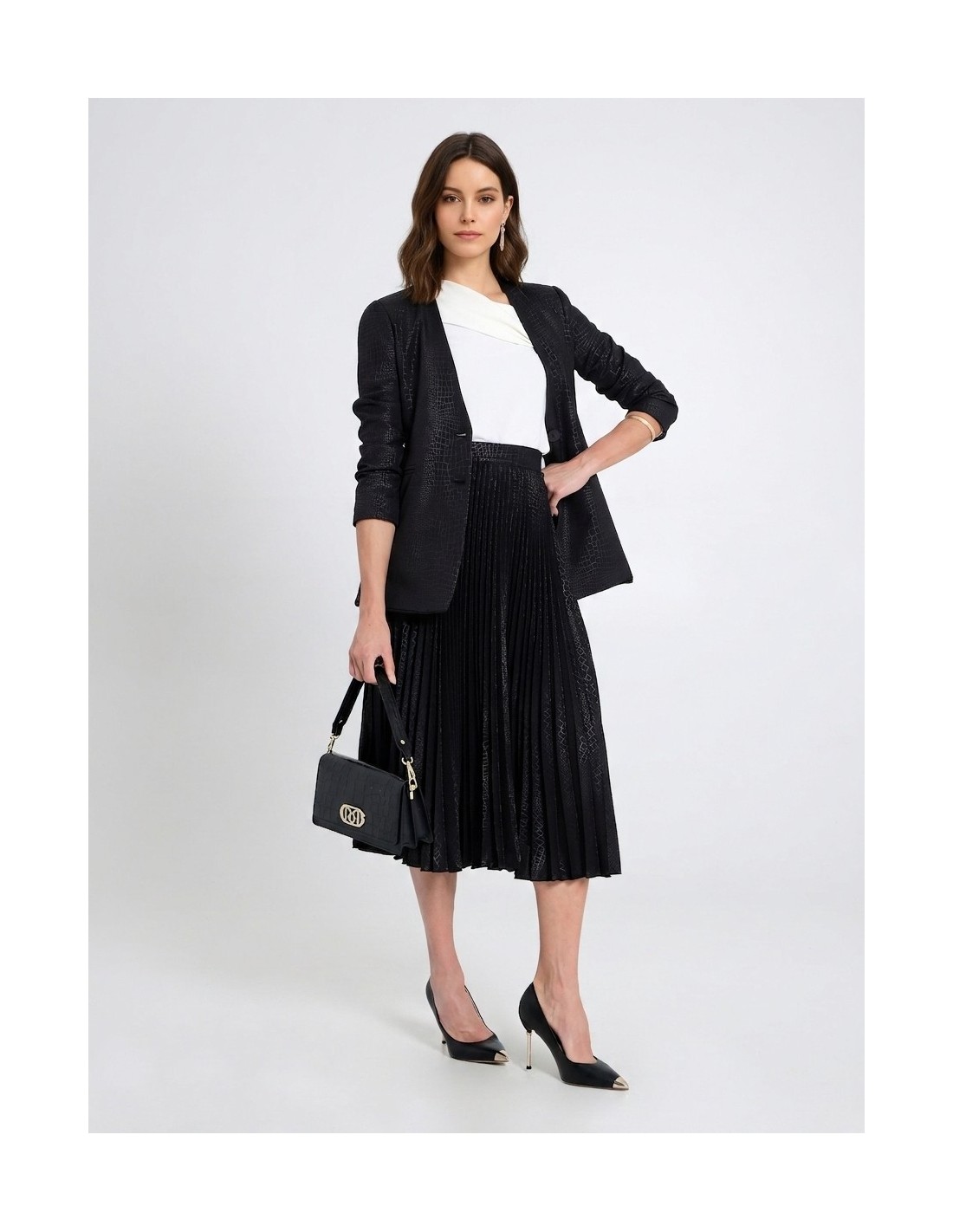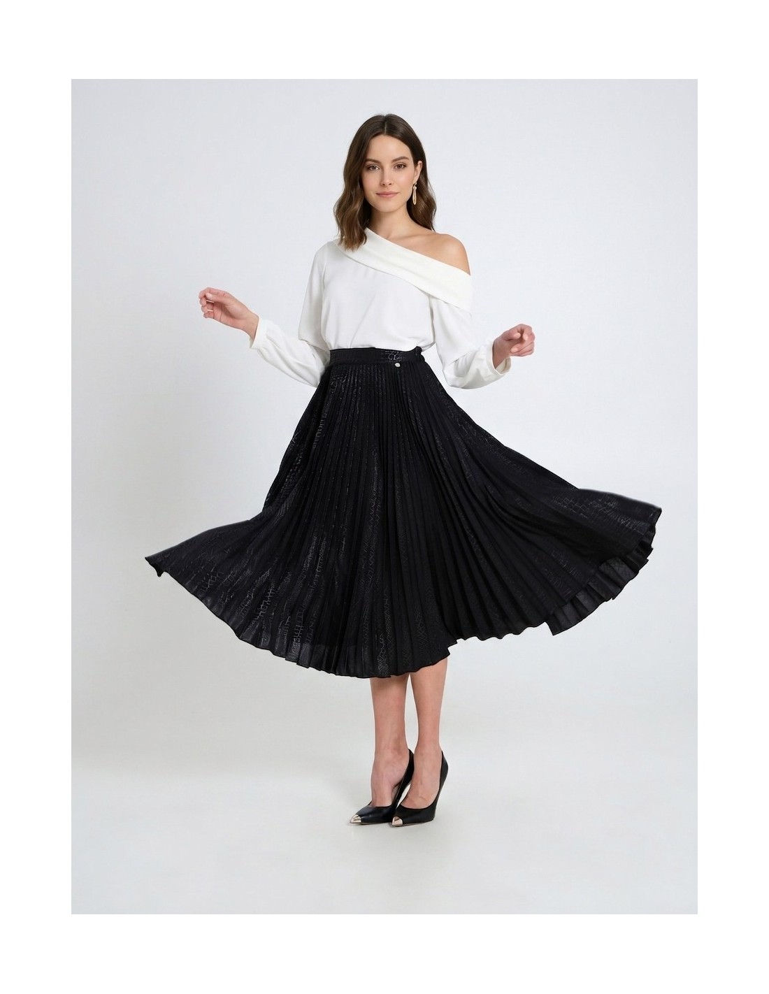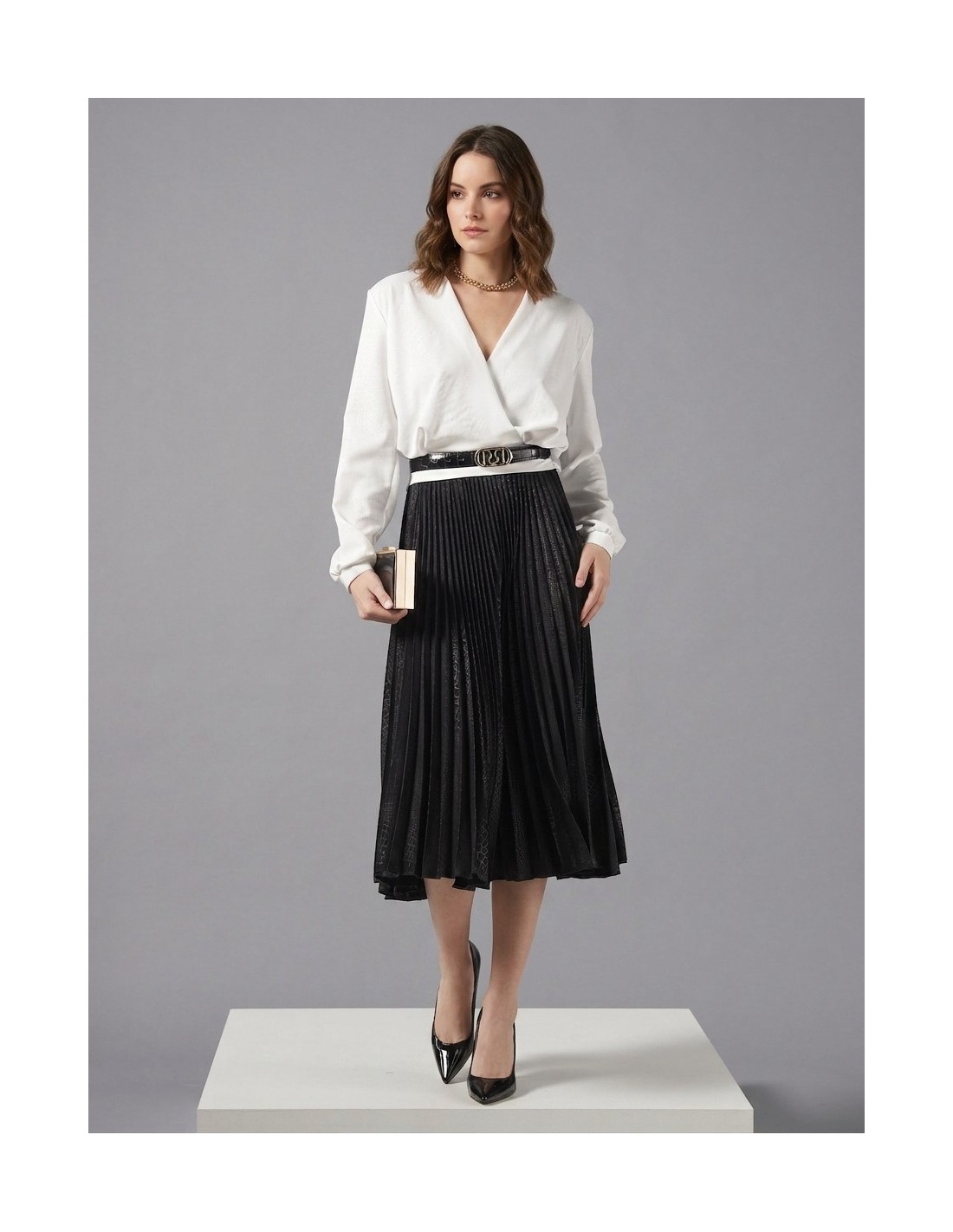 Midi plissado com uma linha fluida e corte feminino, com faixa alta na cintura que valoriza a silhueta. O tecido leve, com textura efeito coco, acompanha os movimentos com conforto. Perfeita para o escritório, um aperitivo ou ocasiões especiais.