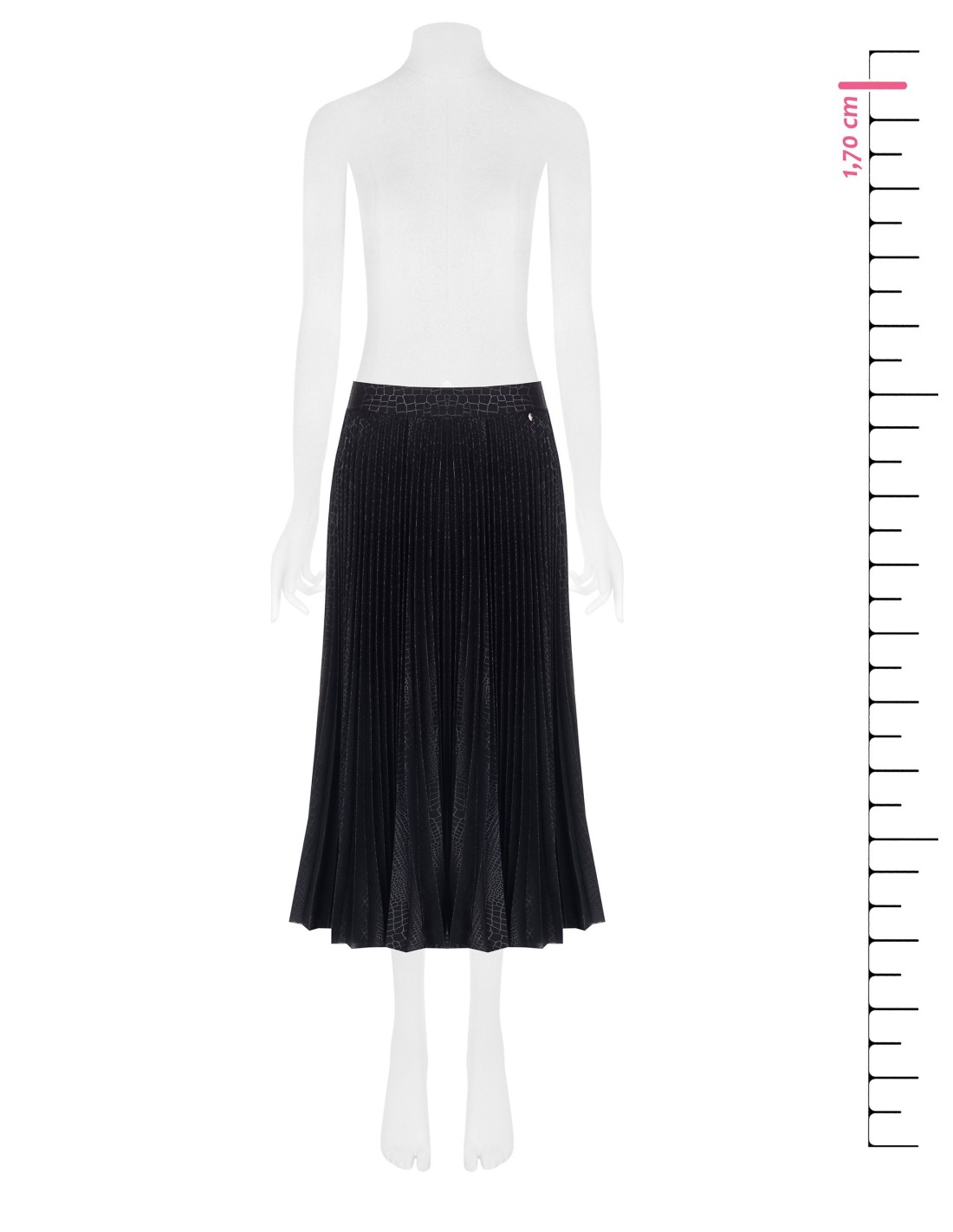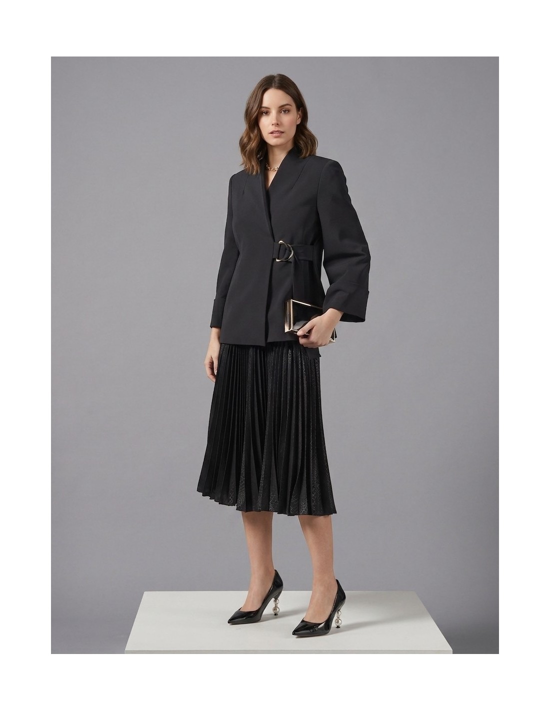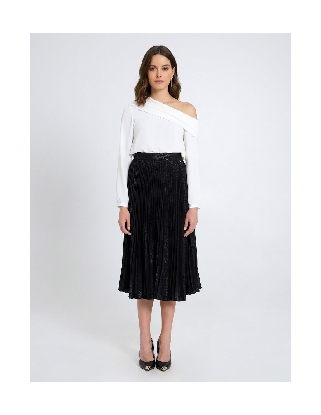 Midi plissado com uma linha fluida e corte feminino, com faixa alta na cintura que valoriza a silhueta. O tecido leve, com textura efeito coco, acompanha os movimentos com conforto. Perfeita para o escritório, um aperitivo ou ocasiões especiais.