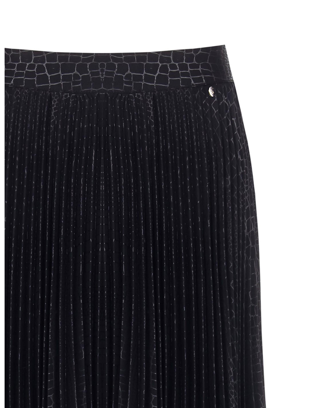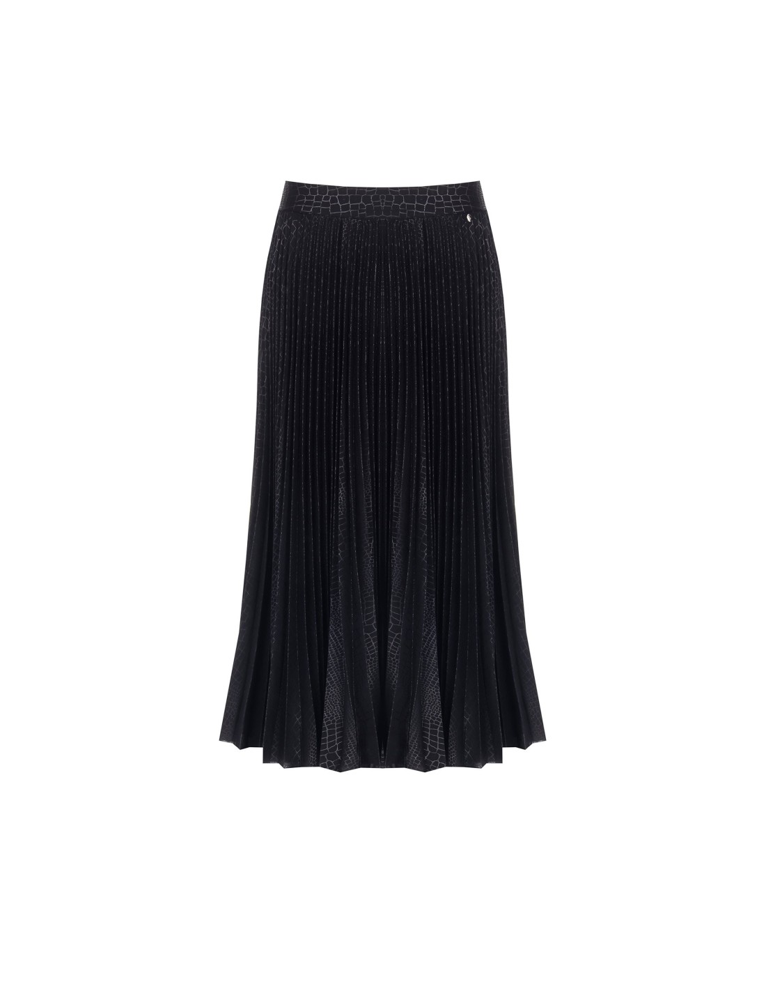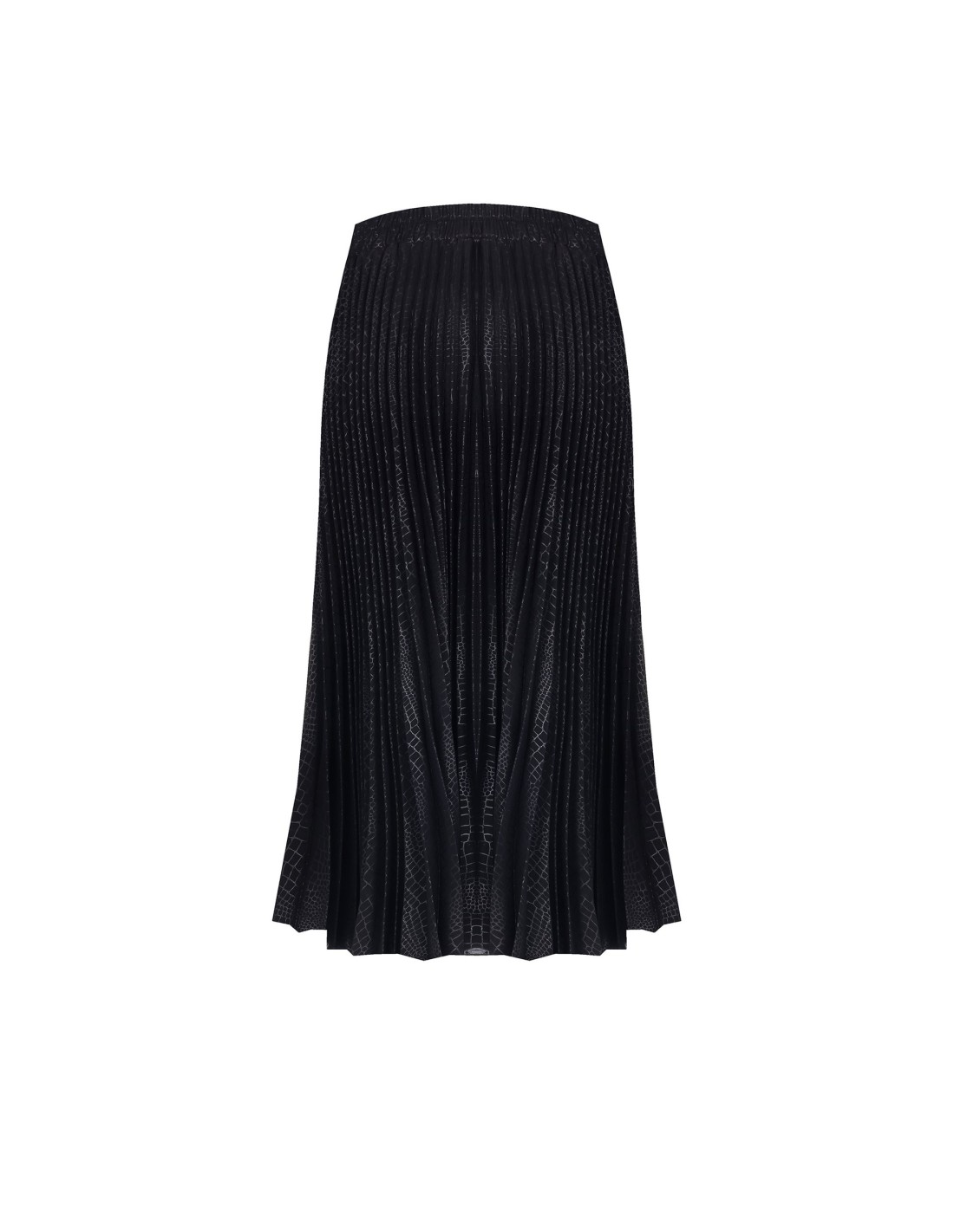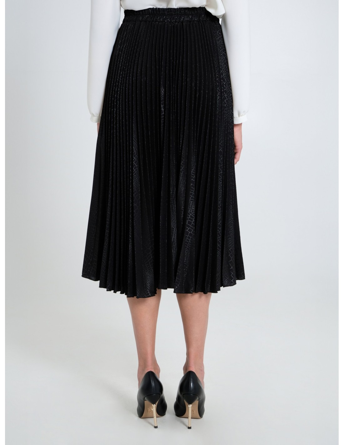 Midi plissado com uma linha fluida e corte feminino, com faixa alta na cintura que valoriza a silhueta. O tecido leve, com textura efeito coco, acompanha os movimentos com conforto. Perfeita para o escritório, um aperitivo ou ocasiões especiais.