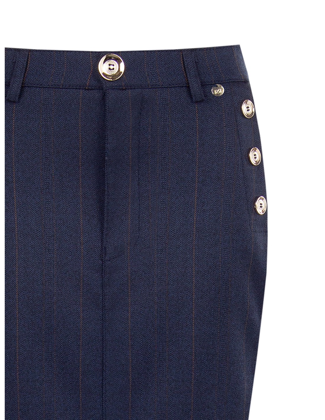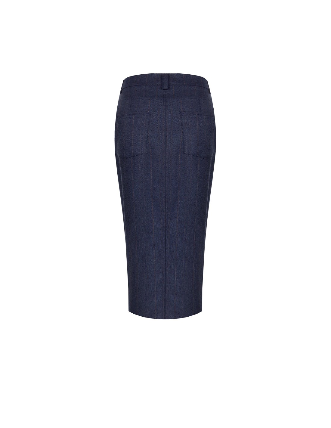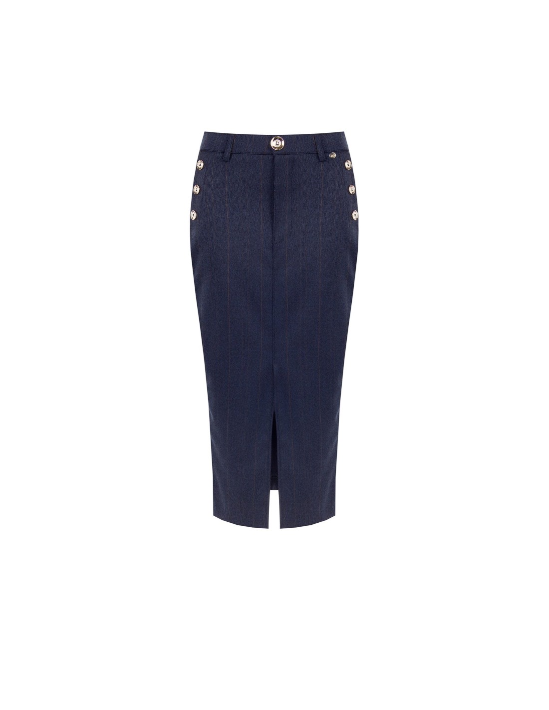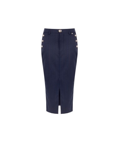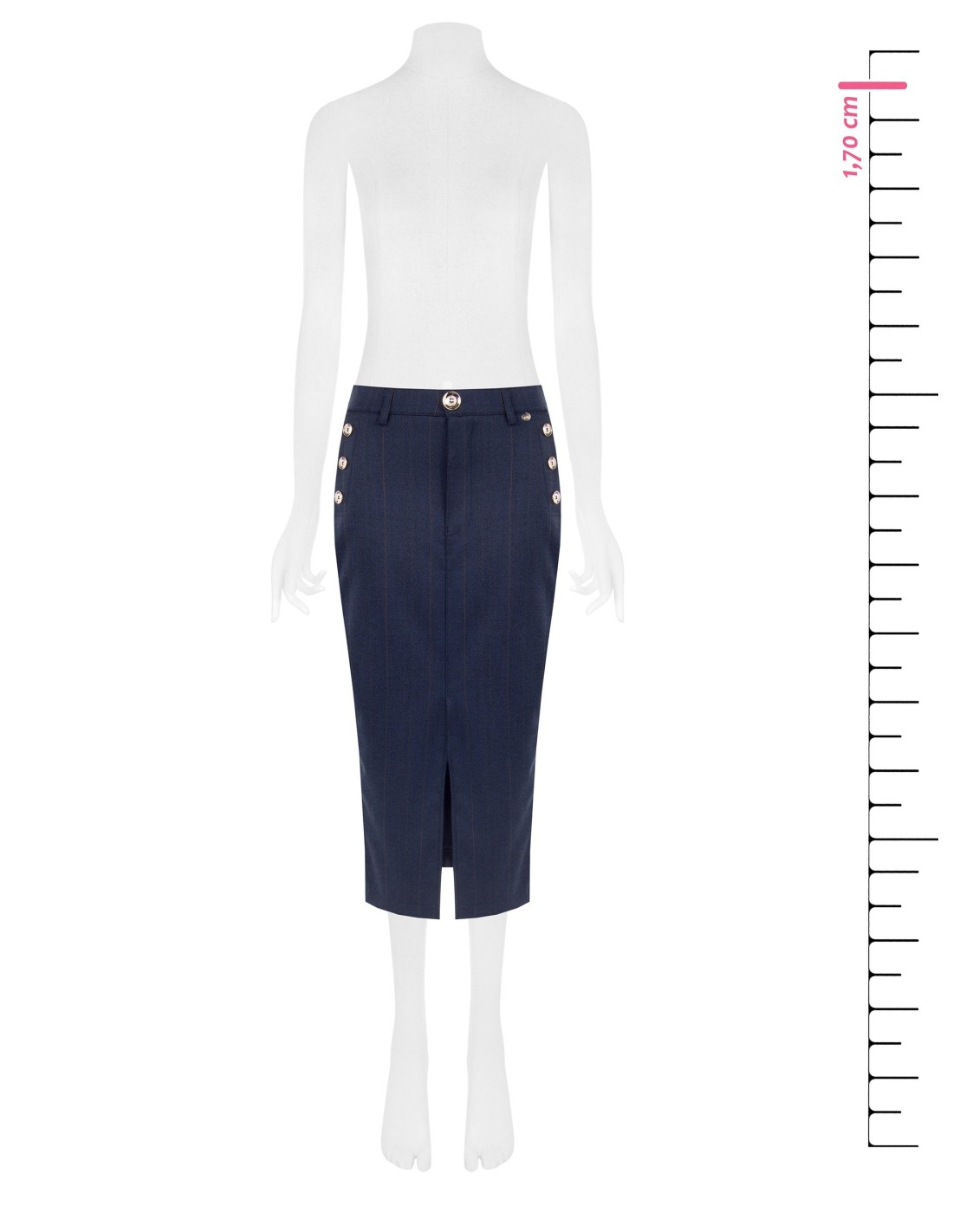 Feminina e esculpida, esta saia lápis de cintura média envolve a silhueta com um corte justo mas confortável. Tecido compacto com micro riscas, agradável ao toque. Botões joia nos flancos e abertura frontal para liberdade de movimento. Perfeita para o escritório e para os aperitivos, combina com camisas e blazers.