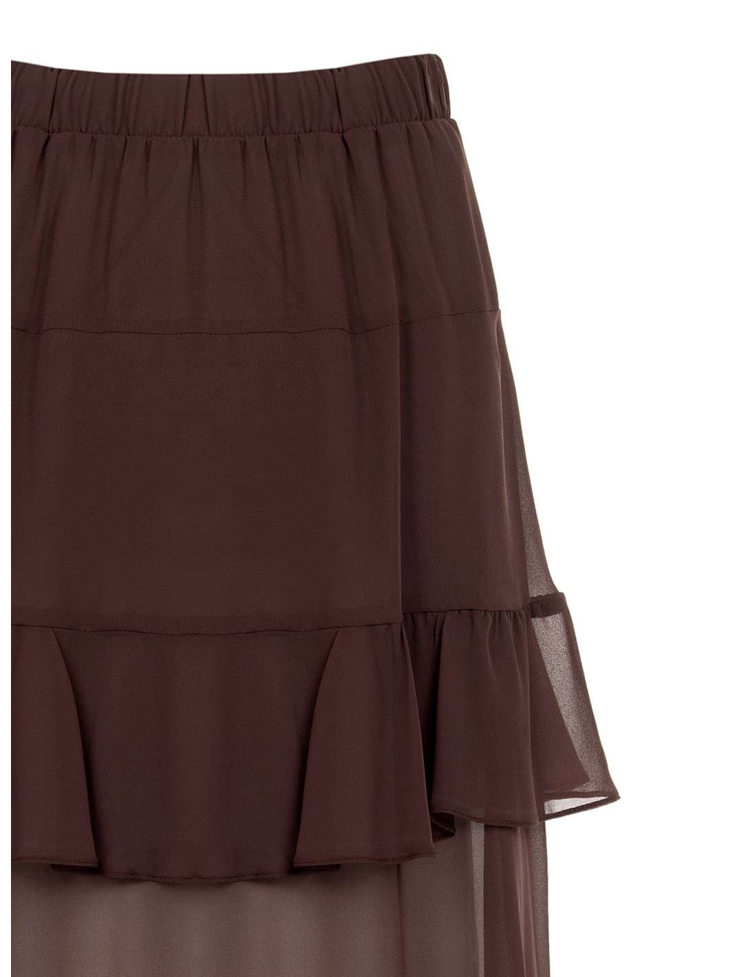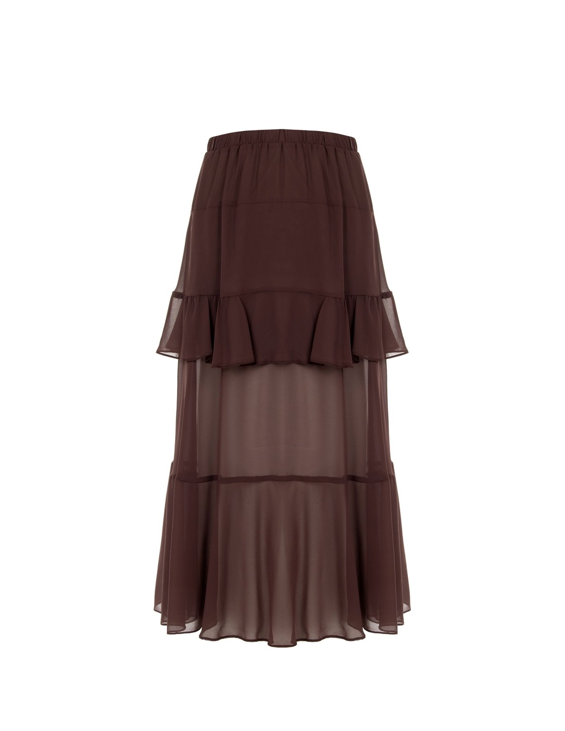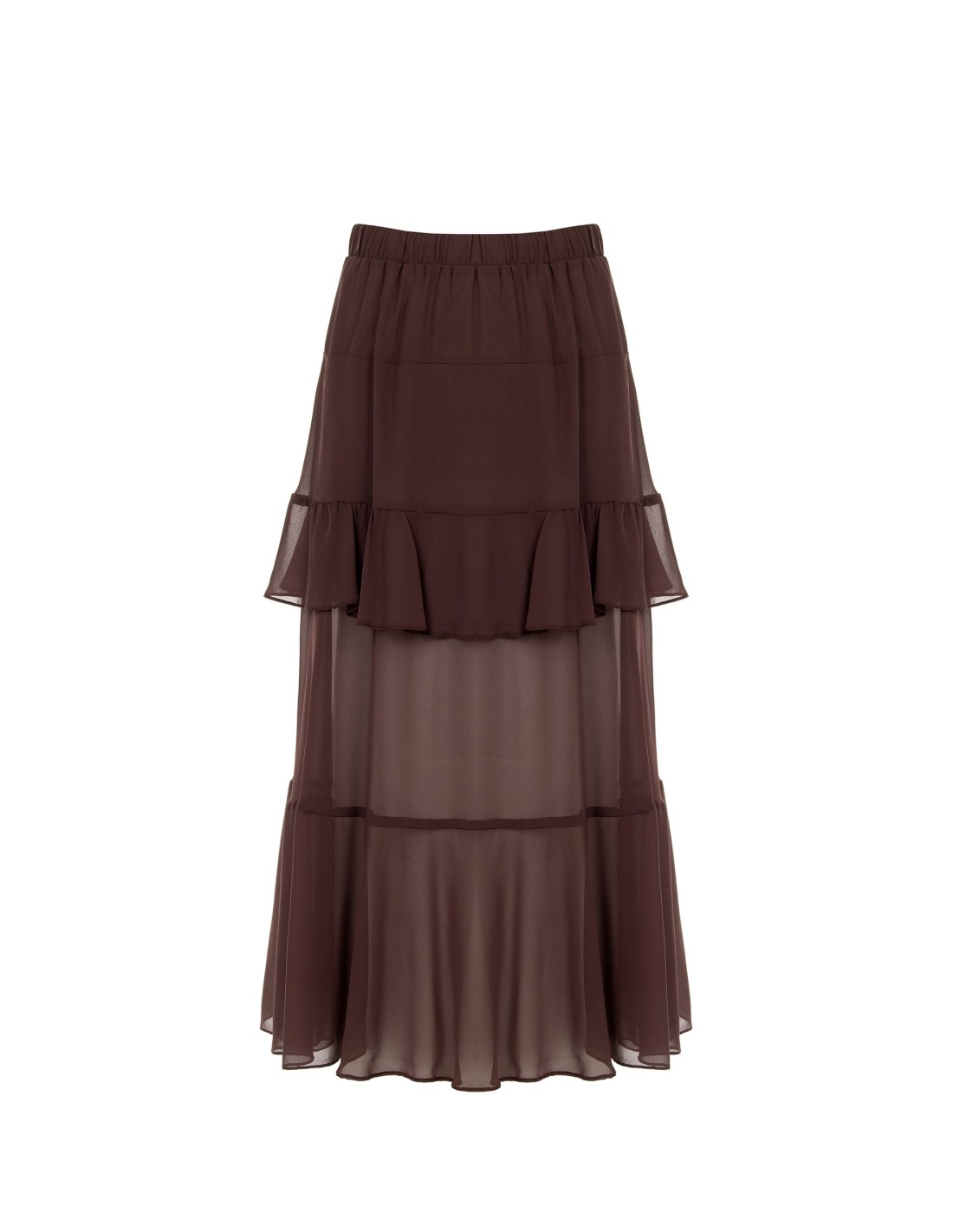 Modelo longo com corte fluido e leve, em chiffon impalpável com forro macio para um conforto que acompanha o movimento. A cintura elástica assenta de forma natural, enquanto folhos e painéis semi-transparentes alongam a silhueta. Perfeito para ocasiões especiais, jantares e festas.