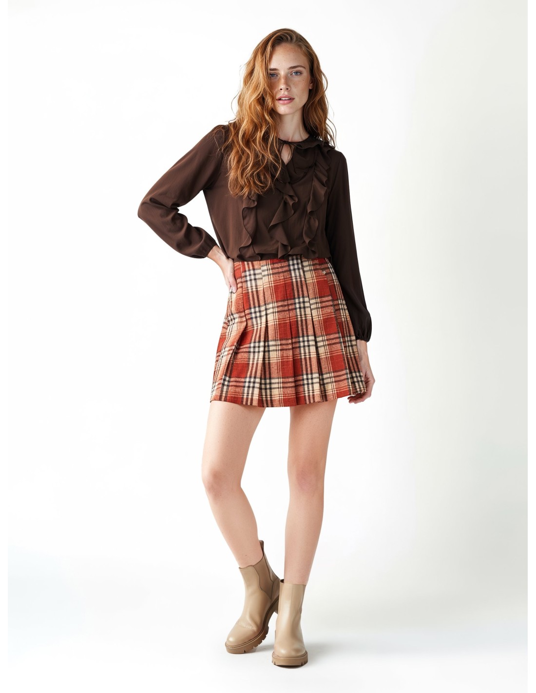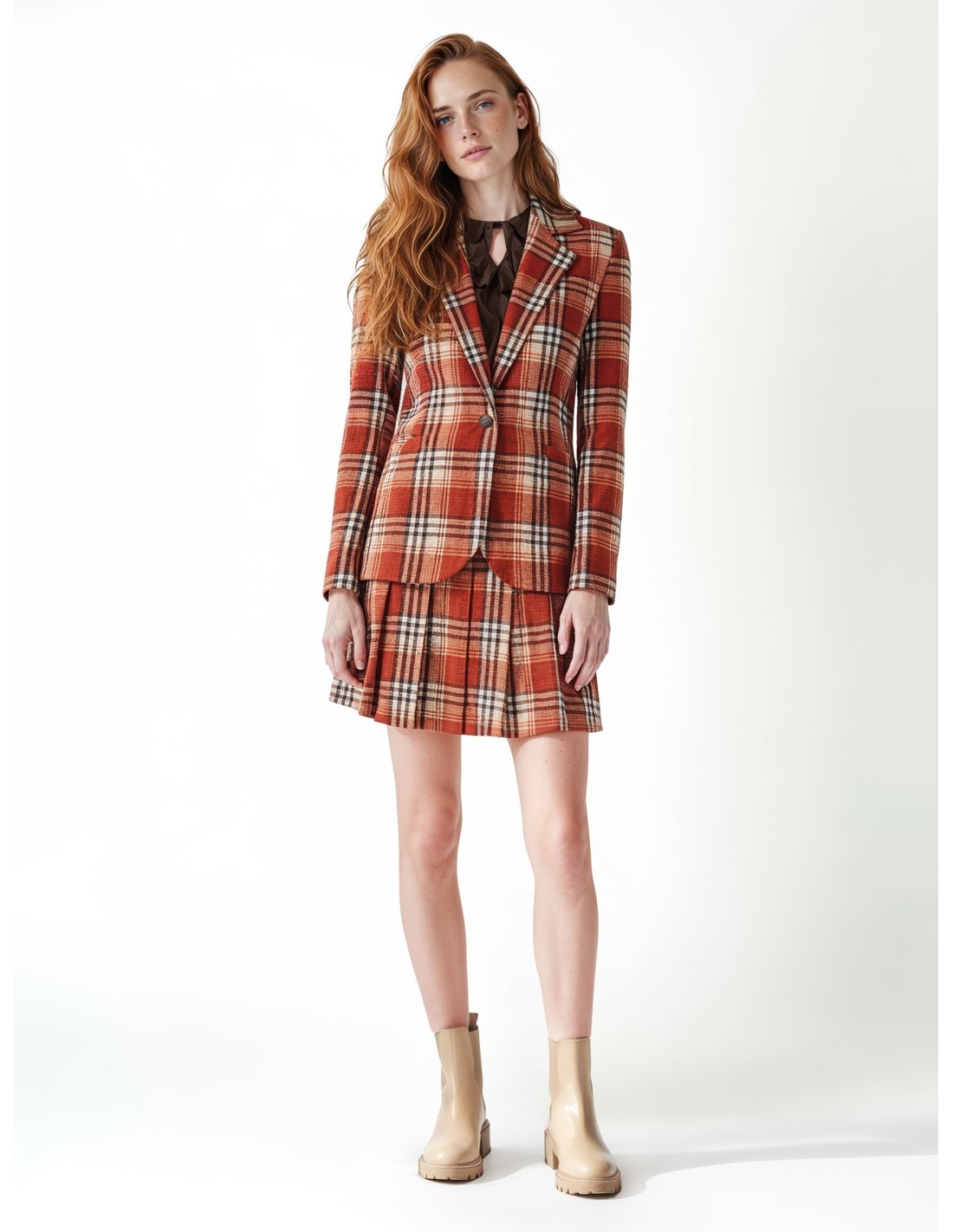 Minissaia trapezoidal, corte regular que valoriza a silhueta. Tecido misto de lã macio ao toque com textura xadrez. Pregas pespontadas e mini charm com logótipo para um toque distintivo. Fácil de combinar com blazers ou camisolas, ideal para o escritório como para o tempo livre.