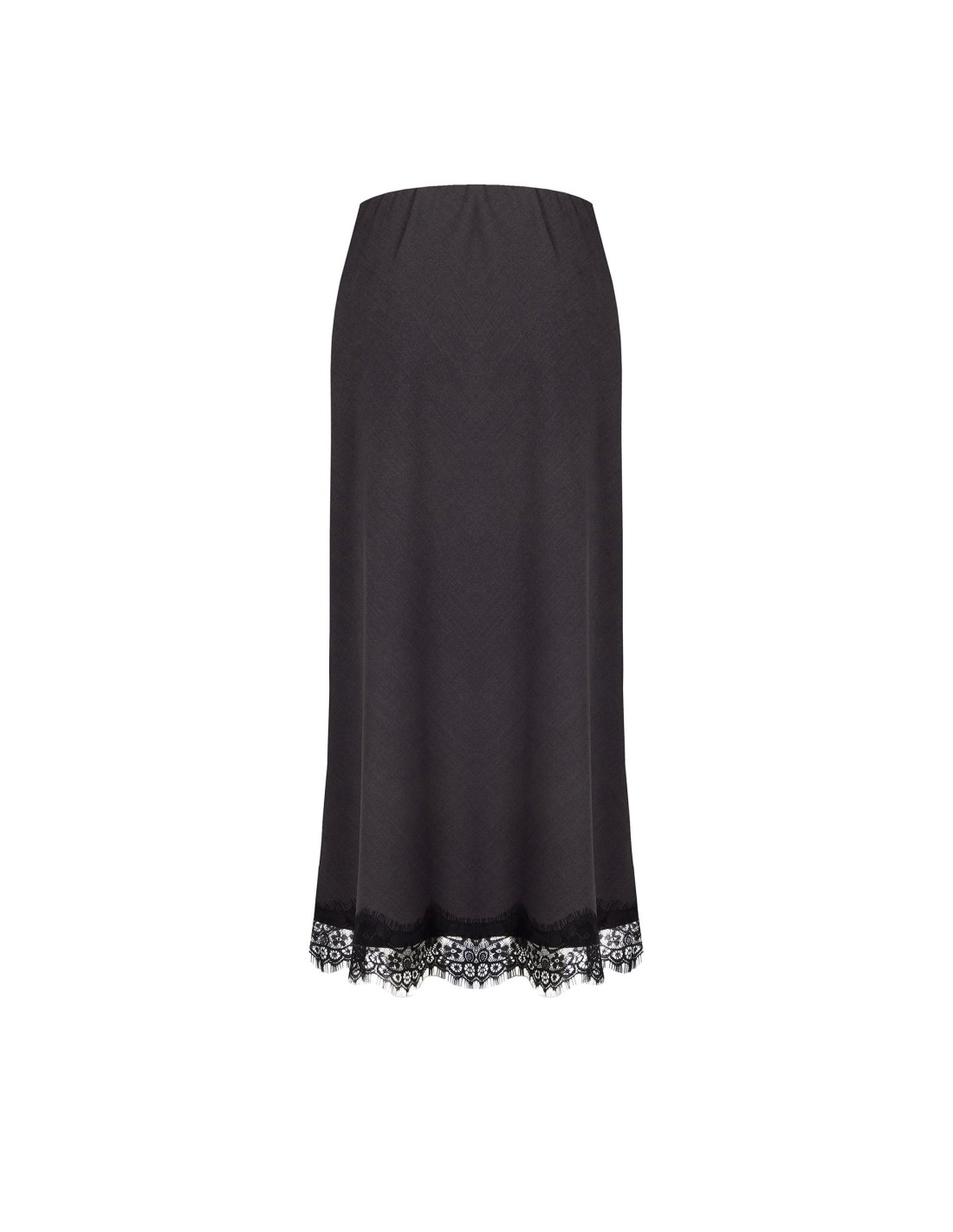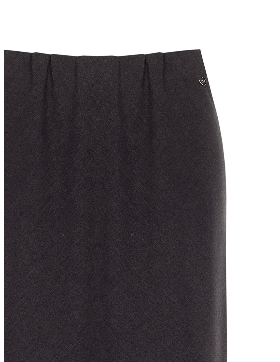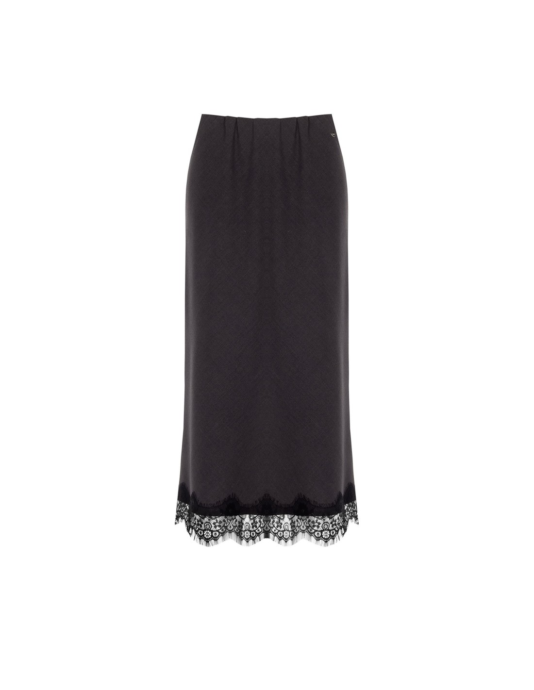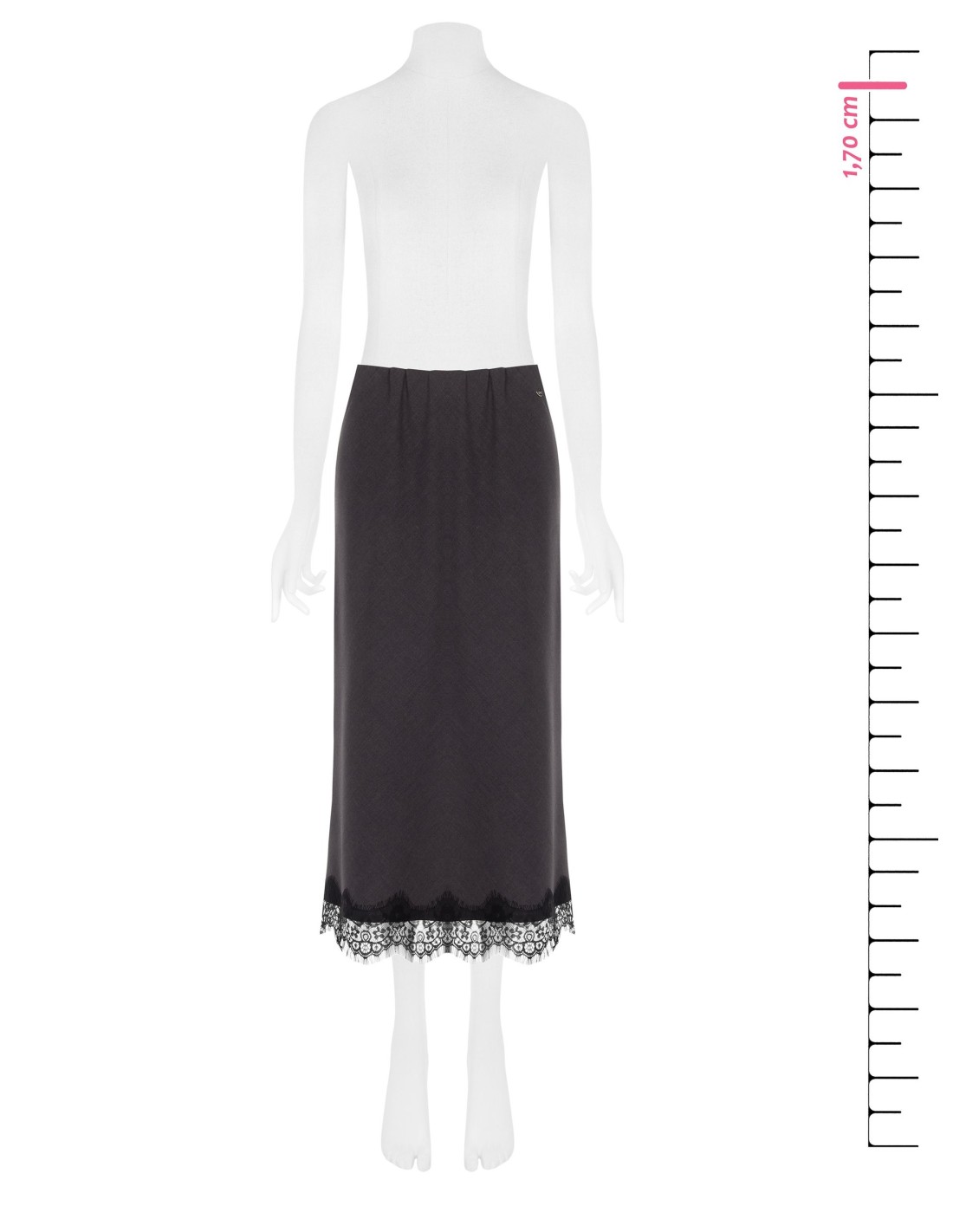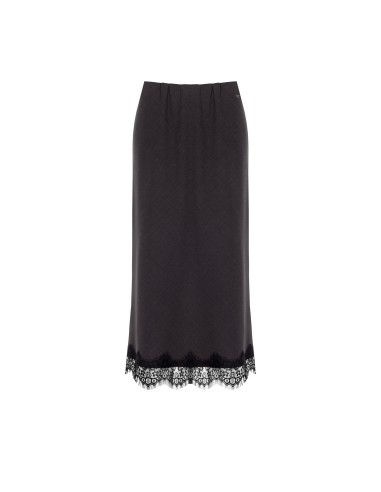 Rinascimento apresenta uma midi de corte direito e fluido que alonga a silhueta. Tecido macio e ligeiramente elástico, agradável na pele. Barra enriquecida com renda com motivo scallop e pequenas franjas; cintura confortável sem fecho de correr. Perfeita do escritório ao aperitivo, com saltos ou botas biker.