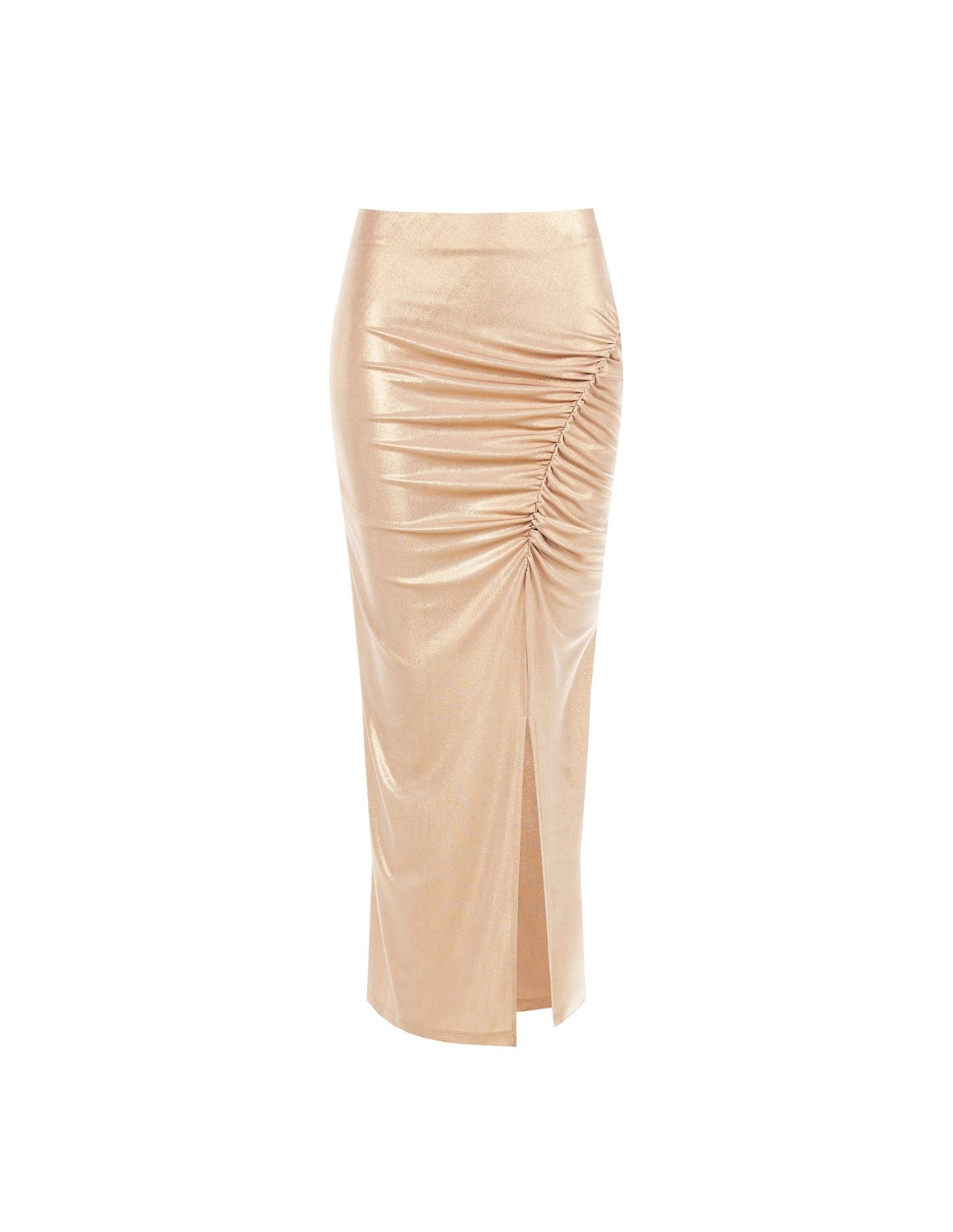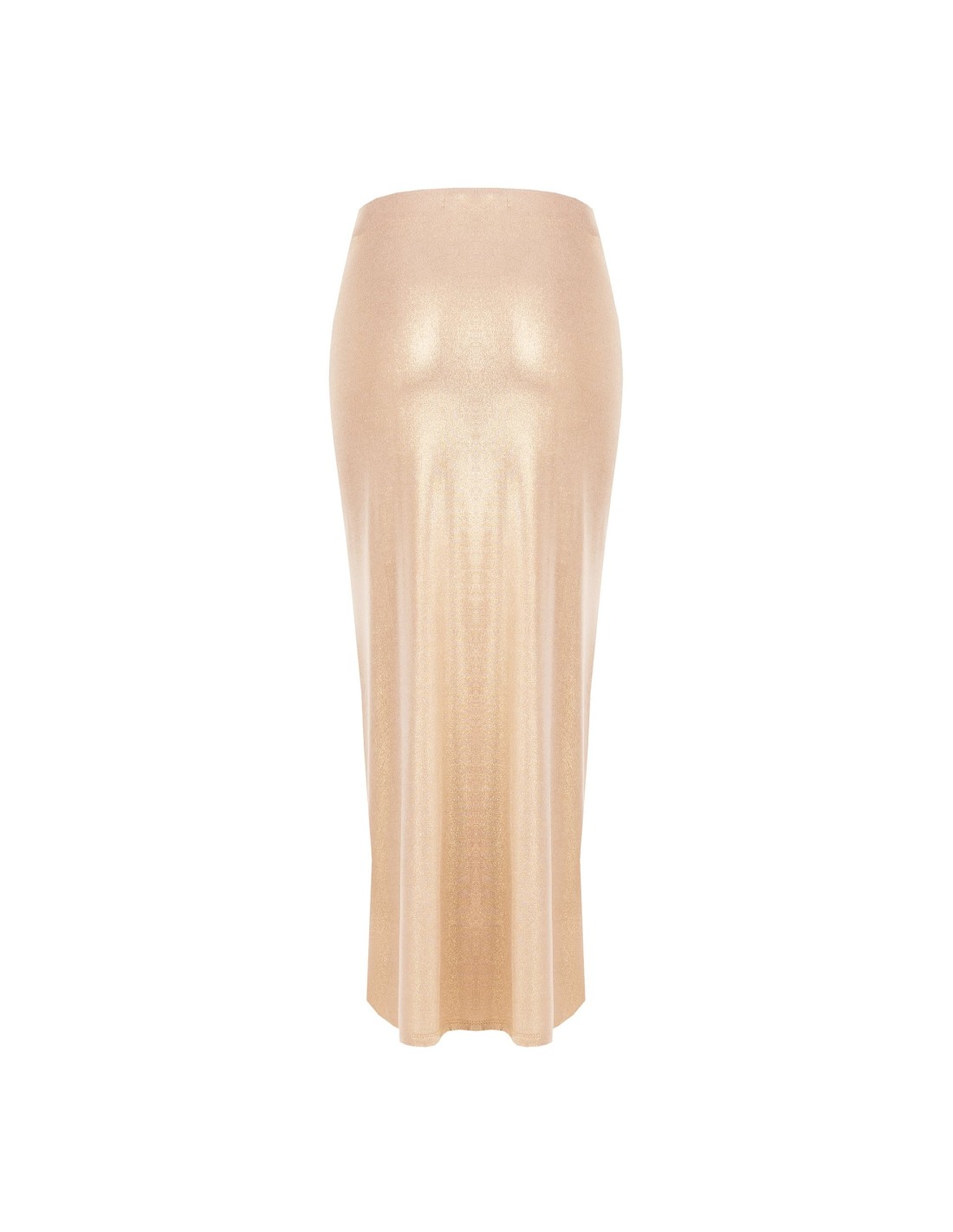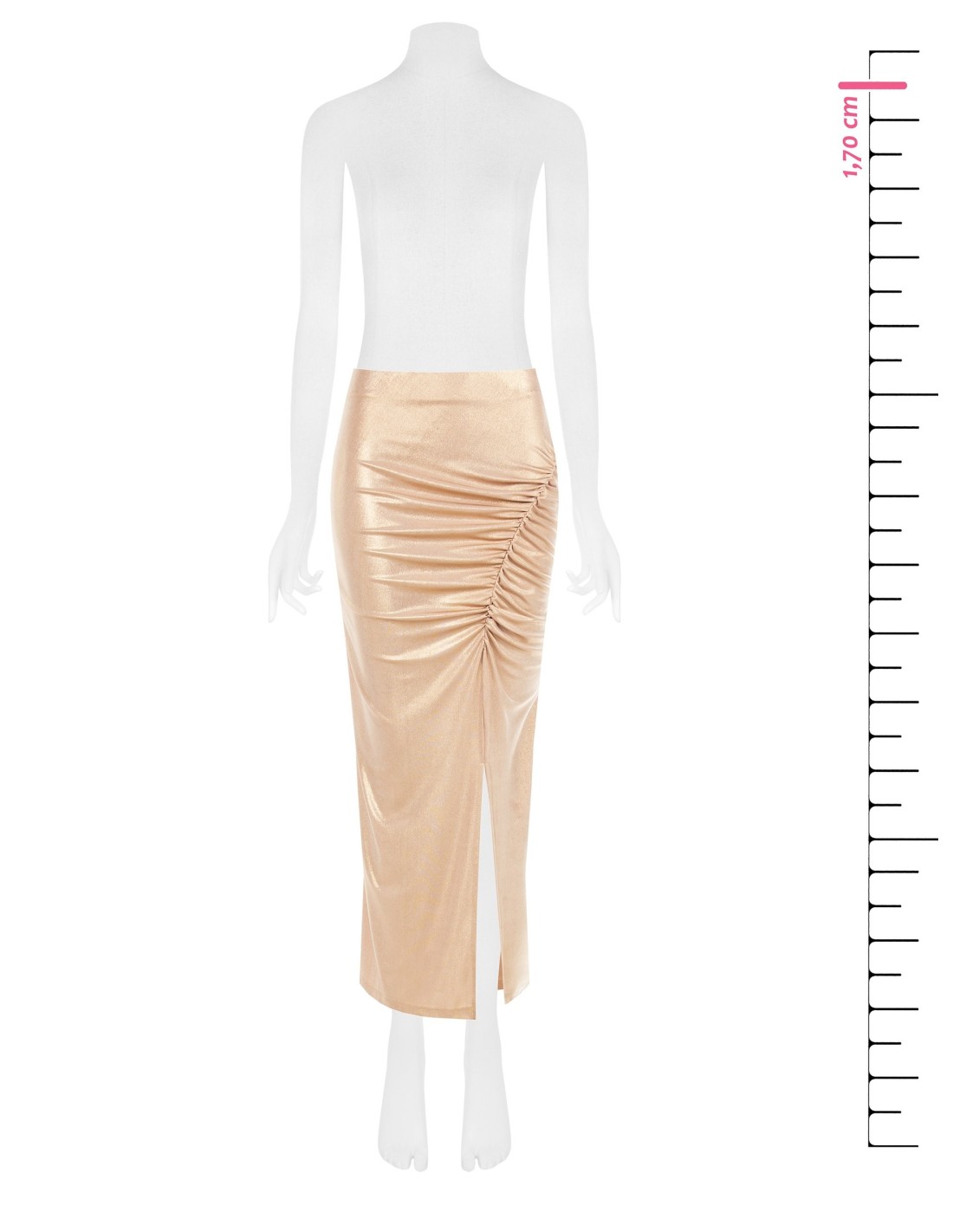 Assinada Rinascimento, esta longuete de corte justo esculpe a silhueta com drapeado lateral estratégico. Confeccionada em malha laminada elástica, garante conforto e brilho discreto. Fenda frontal para liberdade de movimento. Perfeita para festas e jantares, versátil também com blazer no escritório.
