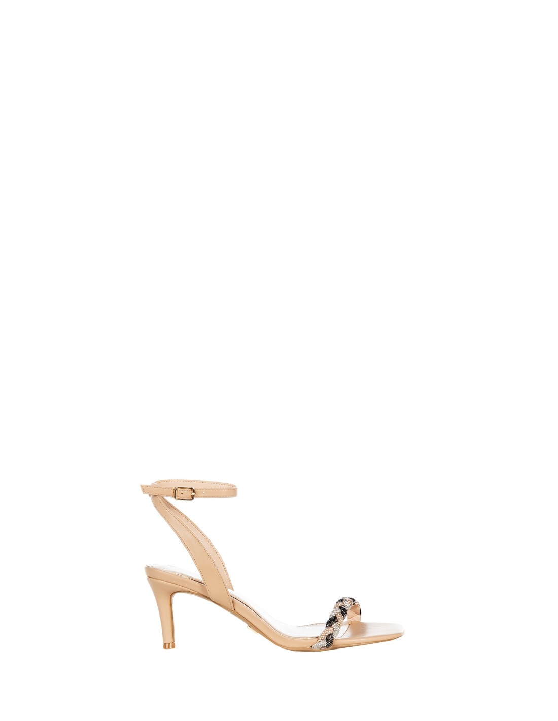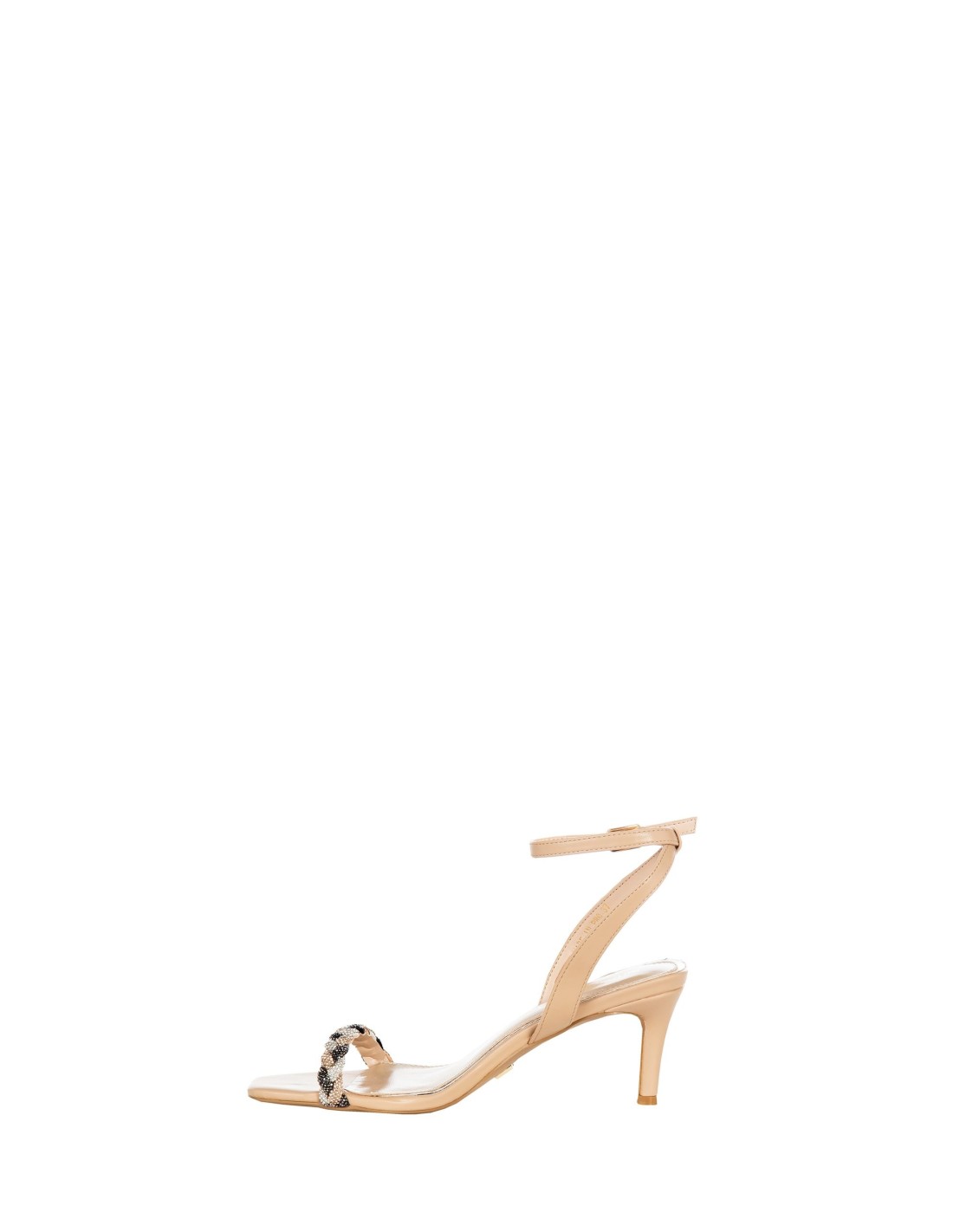 Sandálias com um corte elegante e feminino, com acabamento efeito pele lisa e tira trançada luminosa. O salto médio garante conforto e estabilidade, enquanto a tira no tornozelo com fivela valoriza a silhueta. Perfeitas para festas, cerimónias e eventos noturnos.