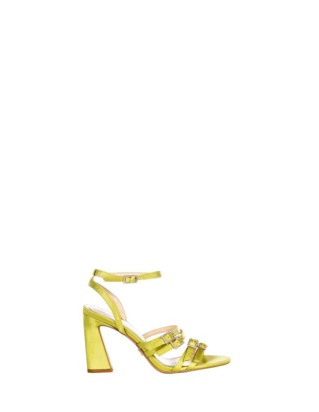 Sandália de corte esguio, confeccionada em cetim de textura luminosa que envolve o pé com leveza. As tiras finas e a tira no tornozelo garantem estabilidade, enquanto as fivelas tipo joia iluminam o look. Perfeita para festas, cerimónias e noites especiais.