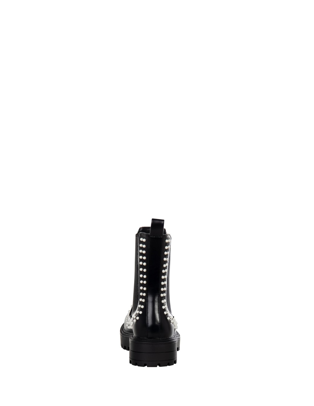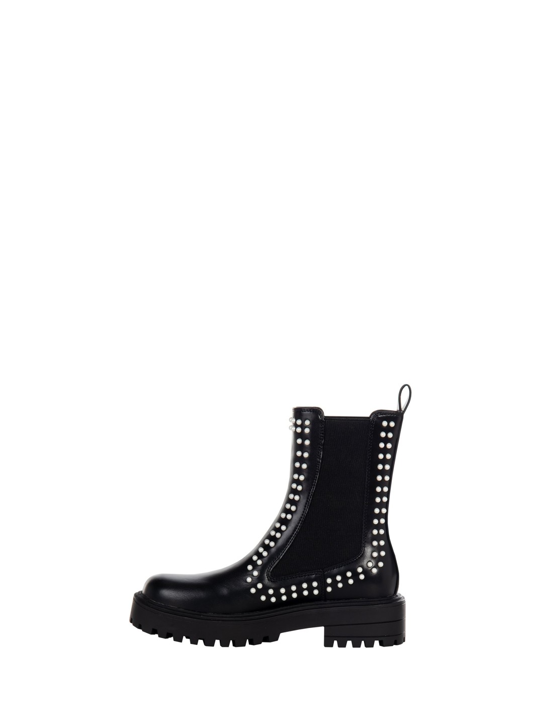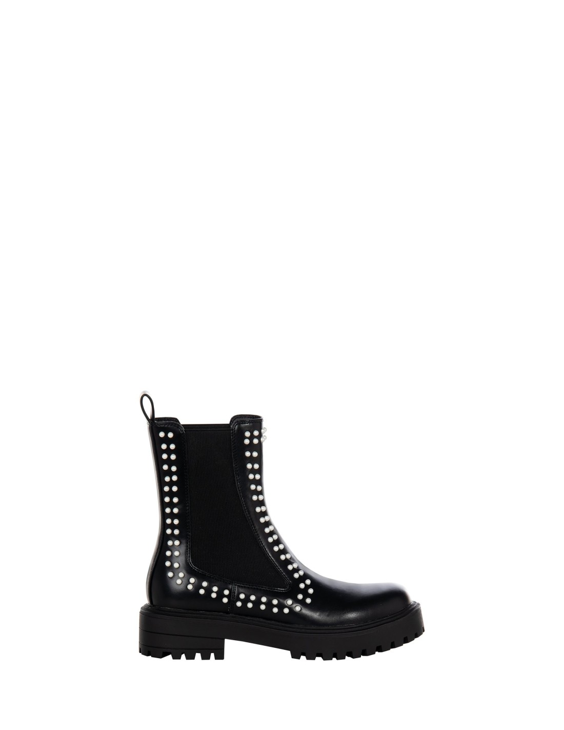 Botim de corte envolvente e marcante, em pele sintética lisa de textura macia. Os painéis laterais elásticos e as aplicações de pérolas iluminam o design, enquanto a sola carrarmato garante conforto e estabilidade ao caminhar. Perfeito para o quotidiano urbano, do escritório ao pós-jantar.
