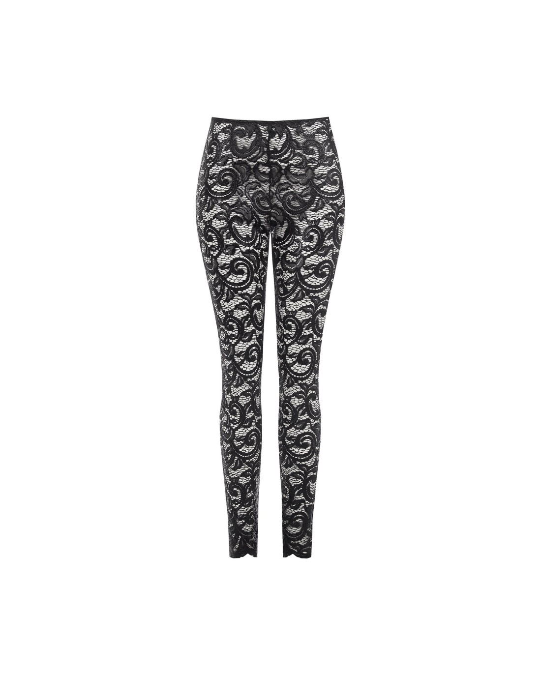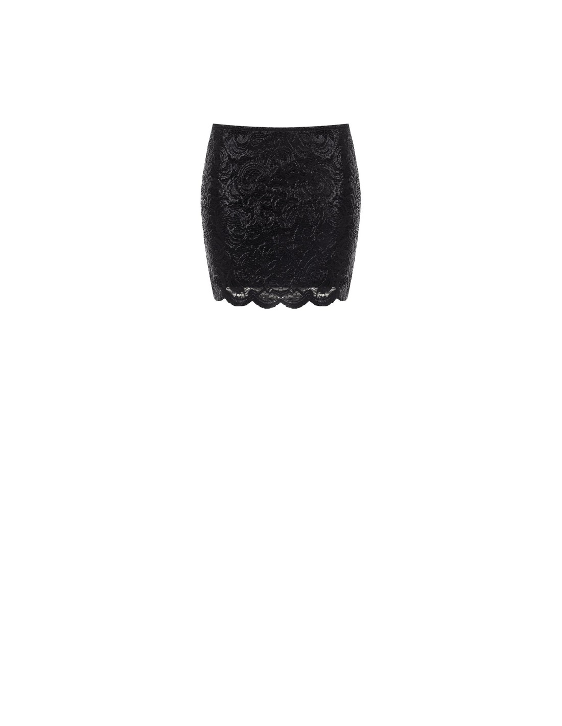 Rinascimento apresenta um conjunto de corte justo que esculpe a silhueta: minissaia e leggings em renda revestida com textura brilhante e elasticidade macia. Detalhes distintivos: acabamento festonado e pormenores transparentes que brincam com as proporções. Use-os juntos para a festa ou separadamente para looks do dia a dia versáteis.