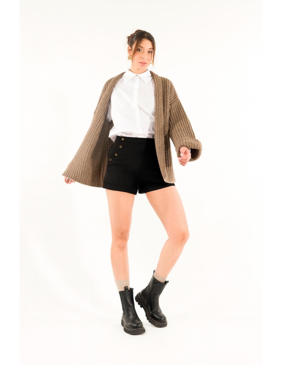 Kontatto assina um par de calções de cintura alta, corte suave que alonga a silhueta. Em imitação de camurça macia com toque aveludado, com botões metálicos laterais e dobra na bainha. Bolsos funcionais. Versáteis do dia para a noite: perfeitos com camisa no escritório ou com top e blazer para um aperitivo.