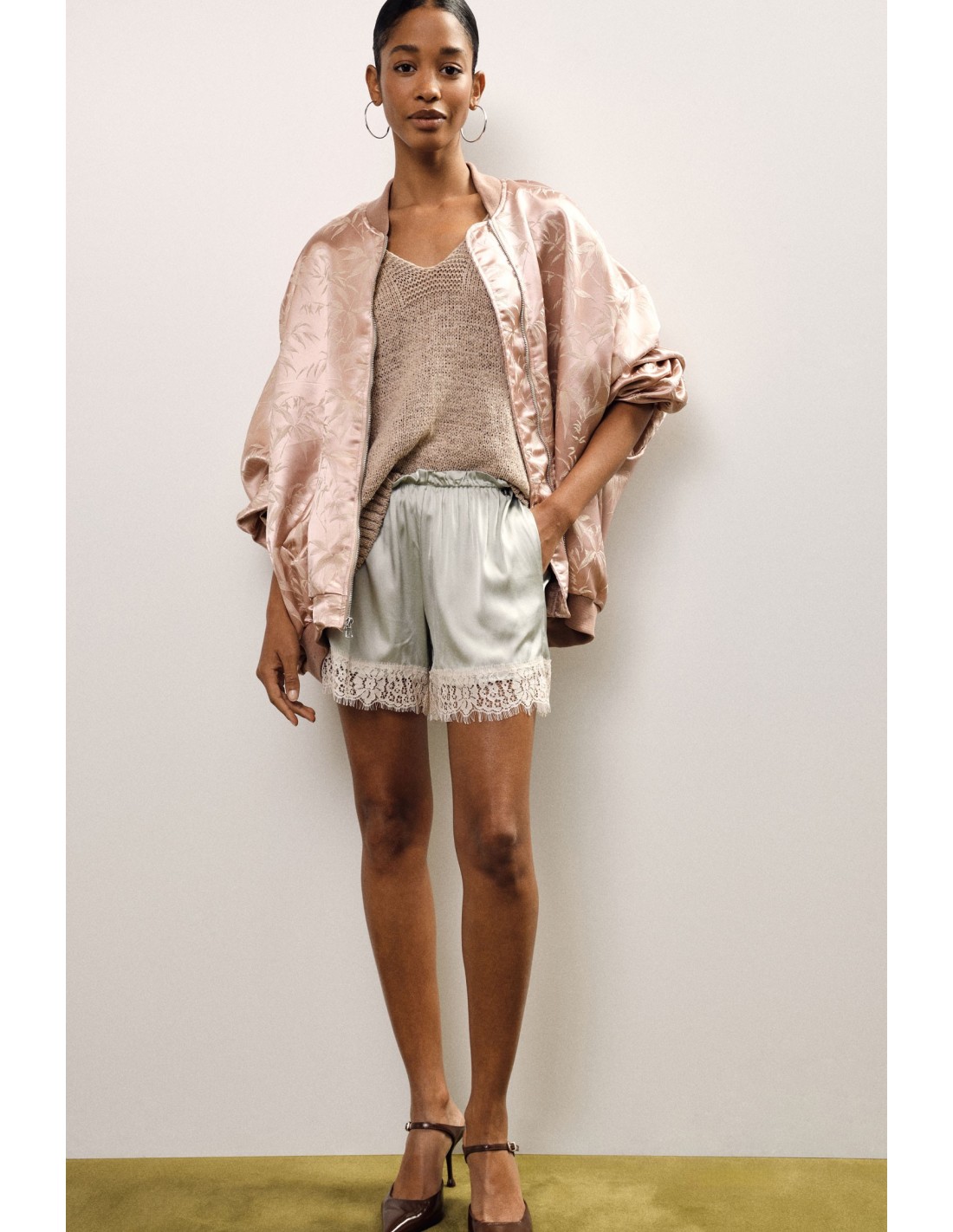 Desfrute de um look fresco e original com estes shorts regular fit que envolvem a silhueta graças ao elástico na cintura e ao corte fluido. A borda em renda floral acrescenta um detalhe requintado que ilumina o seu estilo quotidiano. Perfeitos tanto para sair como para relaxar, oferecem conforto e feminilidade a cada passo.