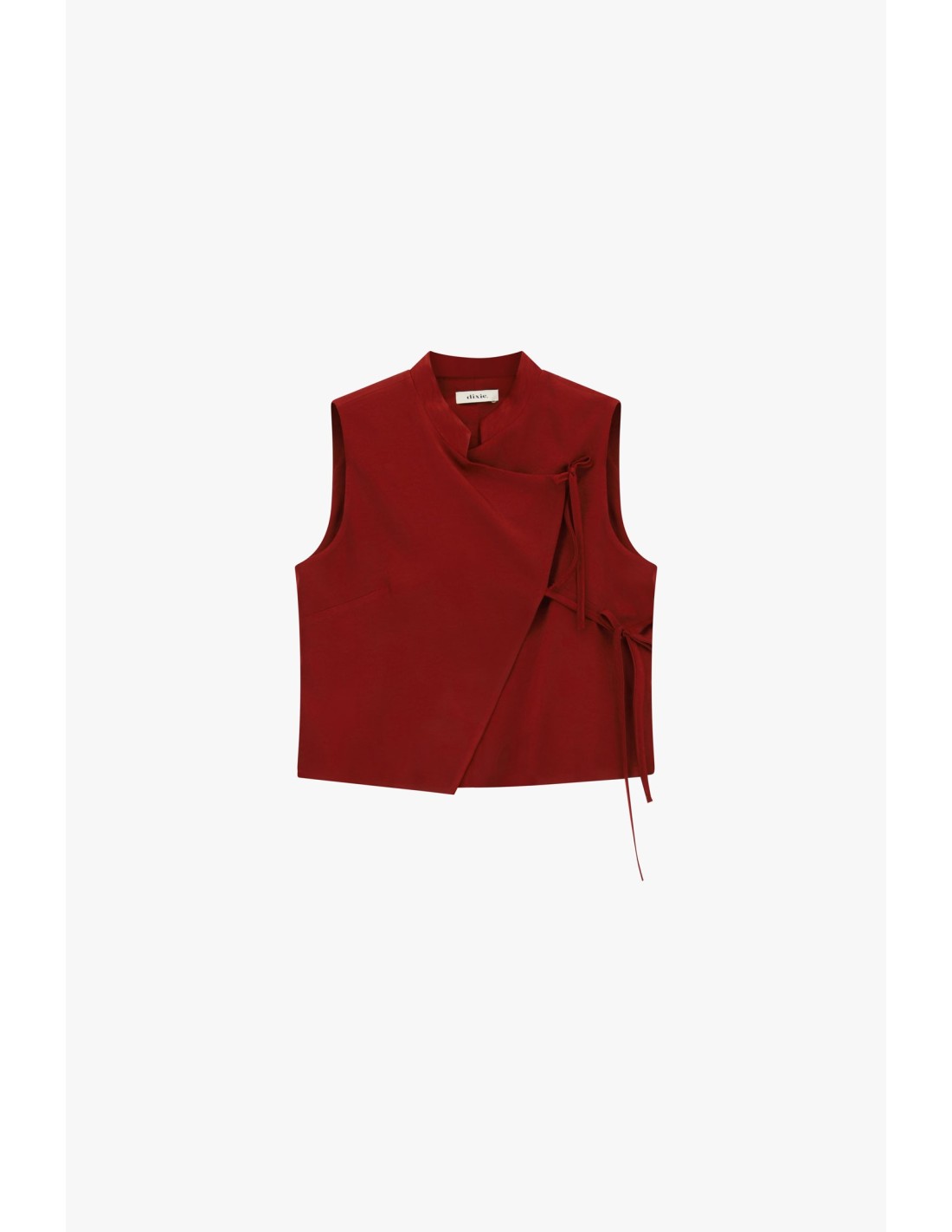 Imagine completar os teus looks com este casaco exterior sem mangas de corte reto e decote à coreana. O design cruzado fixa-se com dois laços laterais, criando uma linha feminina e original que se adapta facilmente tanto a calças como a saias para todas as ocasiões.