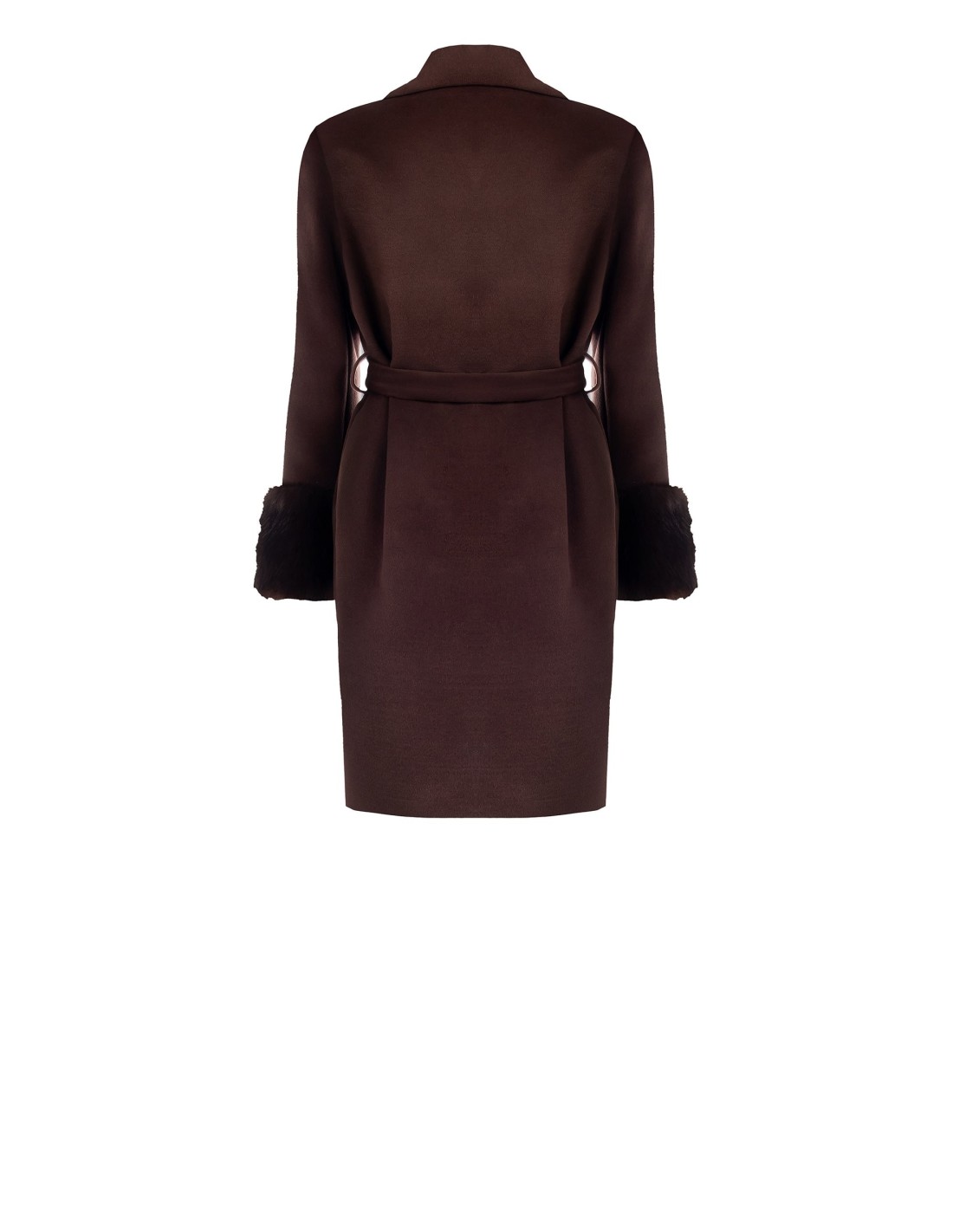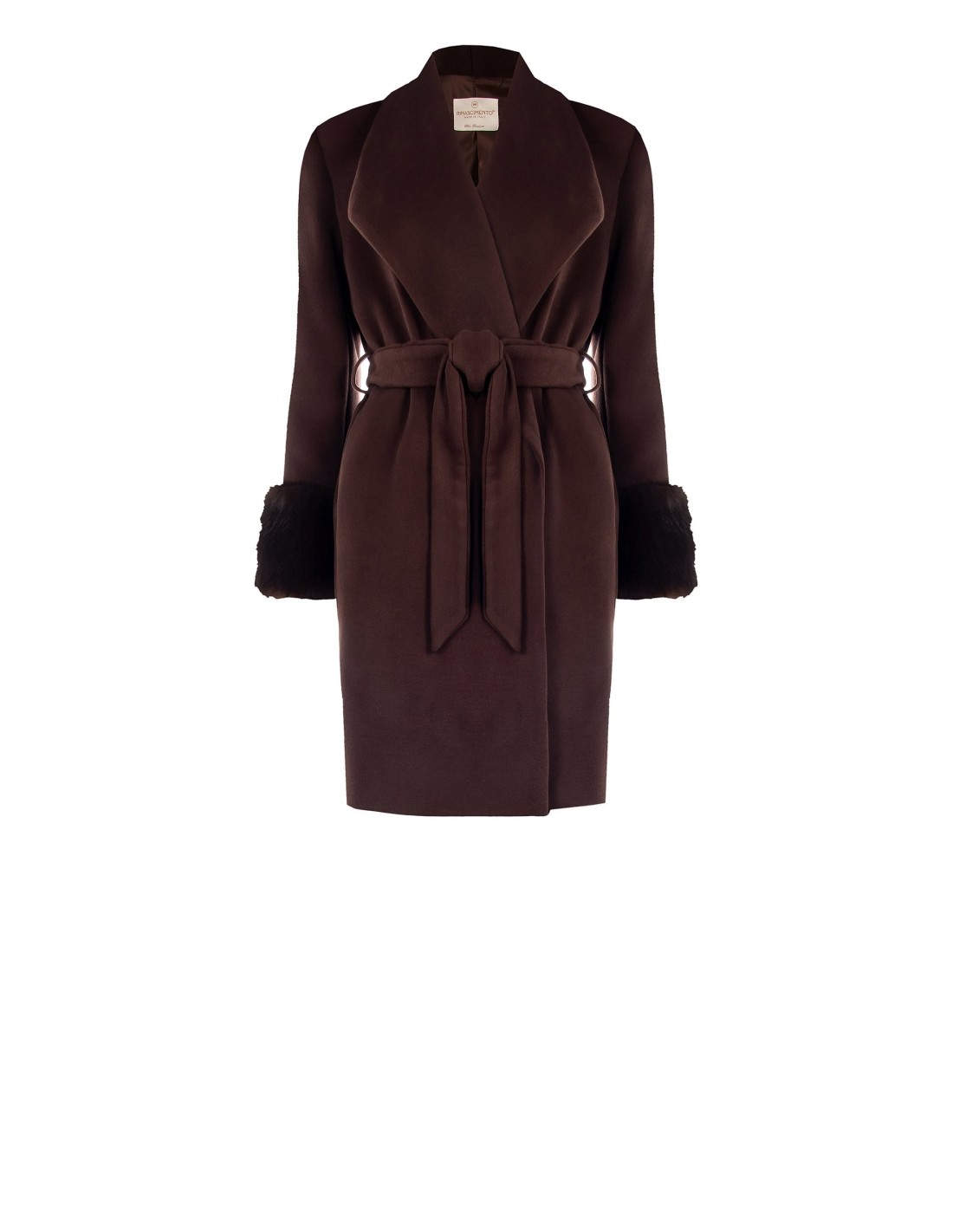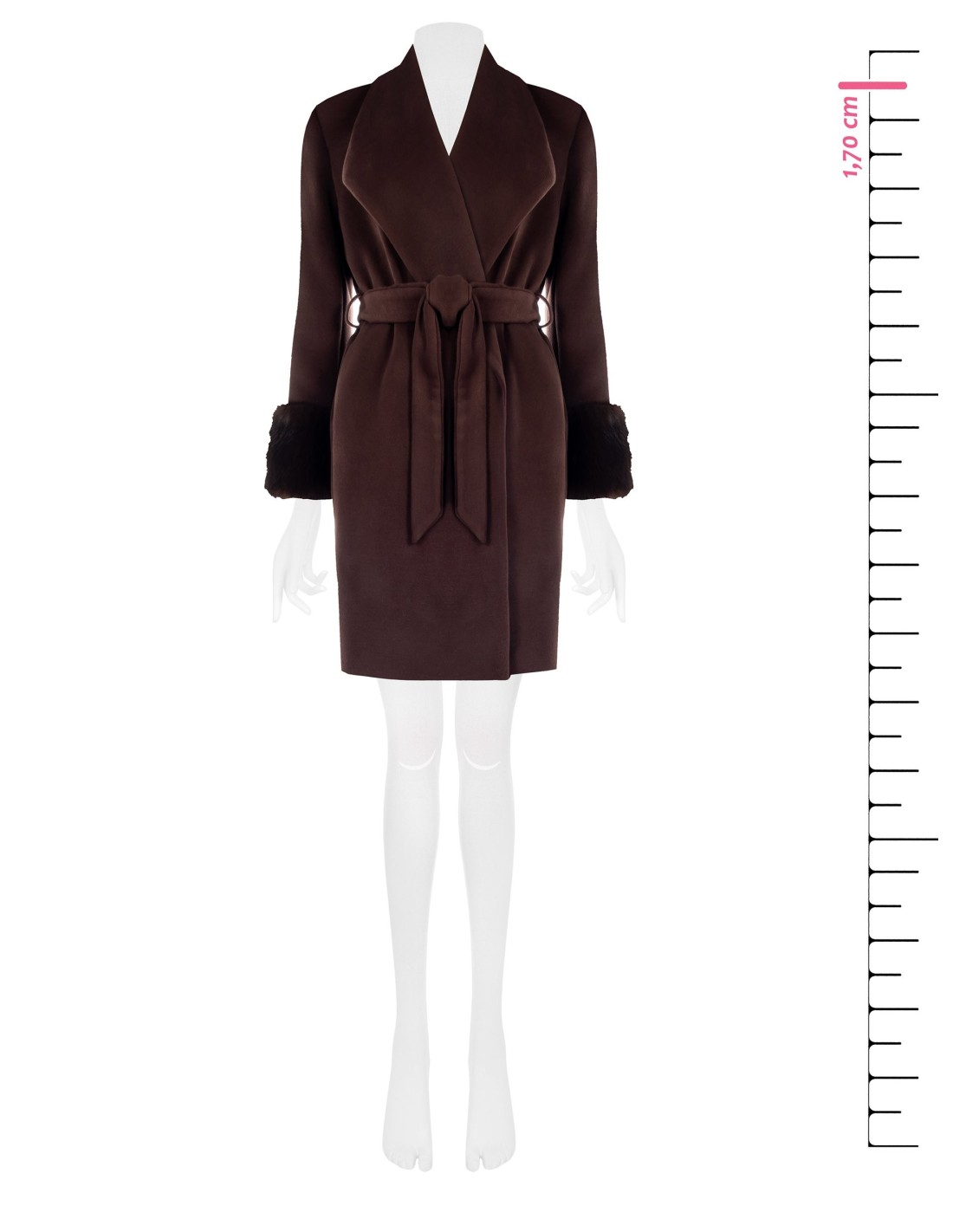Casaco envolvente com corte tipo robe, caimento regular que realça a cintura graças ao cinto com passantes. Tecido macio com efeito de lã e forro interior deslizante. Lapelas largas e punhos em pêlo ecológico, pormenor que aquece e enriquece. Perfeito do escritório ao aperitivo, também sobre vestidos ou denim.