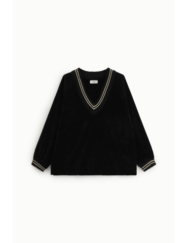 Uma sweatshirt com um corte suave que joga com detalhes femininos, como o decote em V profundo terminado em canelado com riscas em contraste. As mangas ligeiramente largas com punhos elásticos proporcionam praticidade e um toque desportivo, perfeito para dar estilo até aos momentos mais casuais do dia.