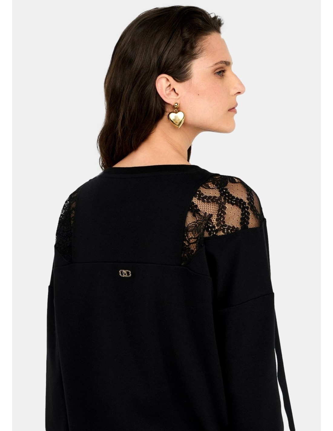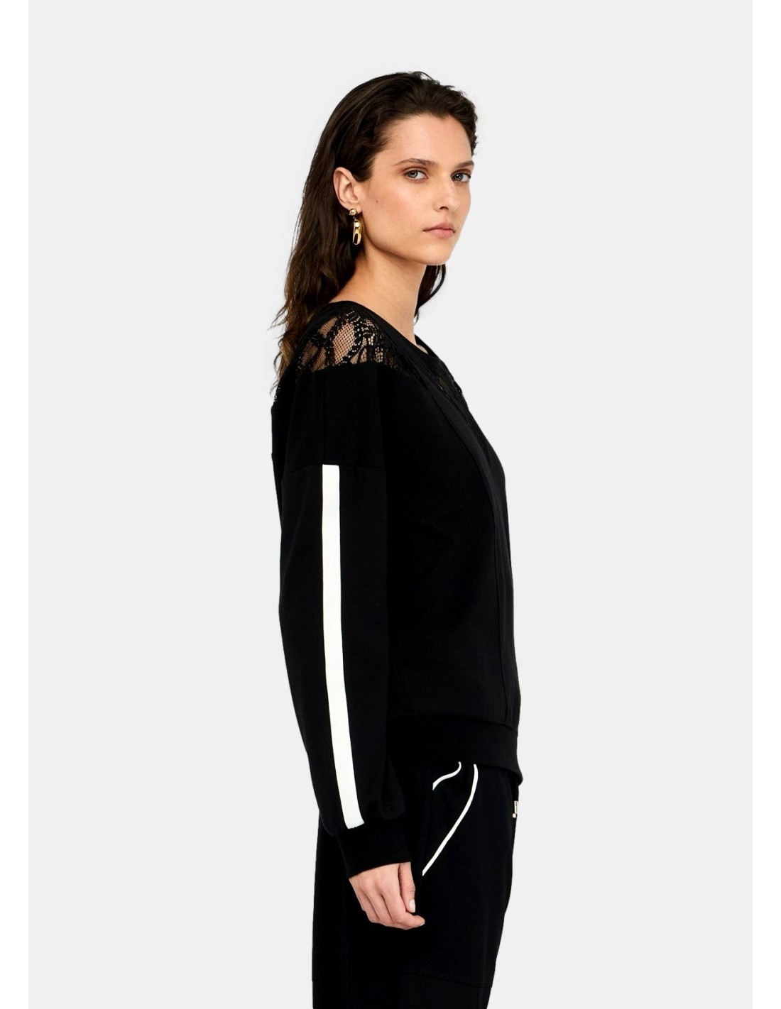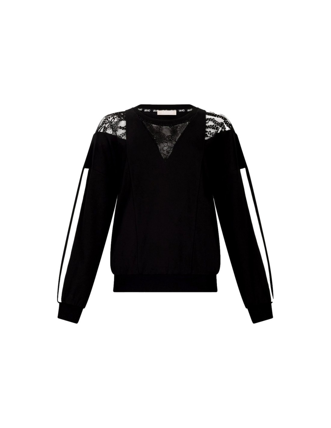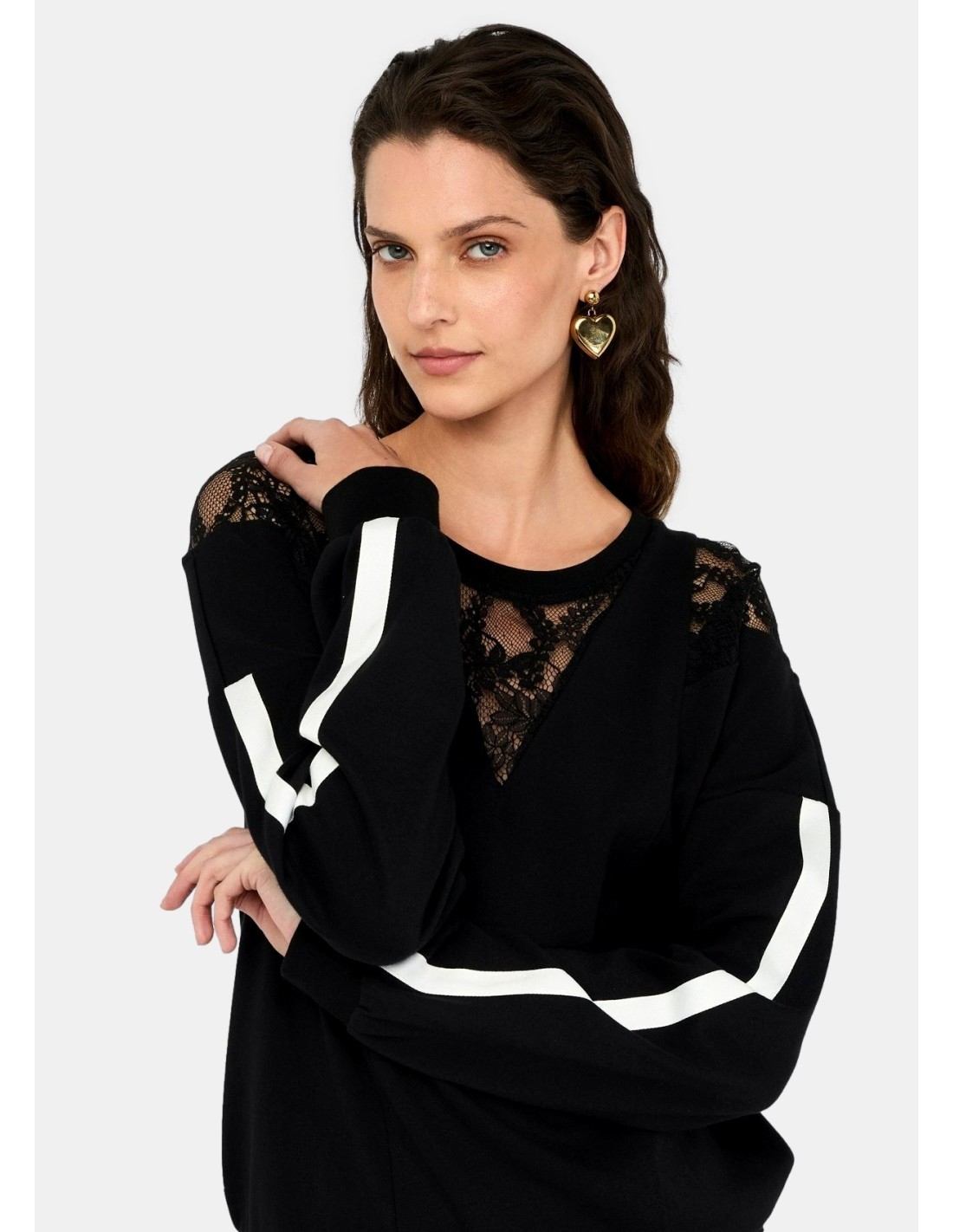 Camisola em malha interlock de algodão stretch, faixas laterais contrastantes, detalhes em renda, corte com gola redonda.