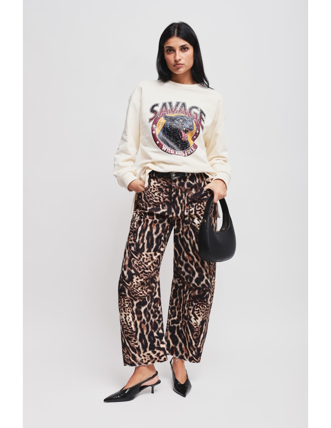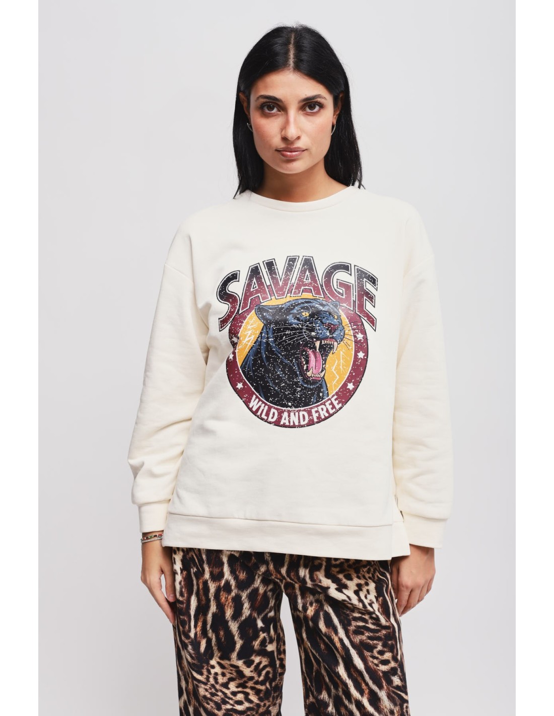 Maryley assina um top relaxed de corte suave que valoriza sem apertar. Algodão felpado no interior para calor e conforto, acabamento liso no exterior. Gola redonda limpa e maxi gráfica com efeito vintage que chama a atenção. Perfeito para o dia a dia arrojado, do denim ao look casual de escritório.