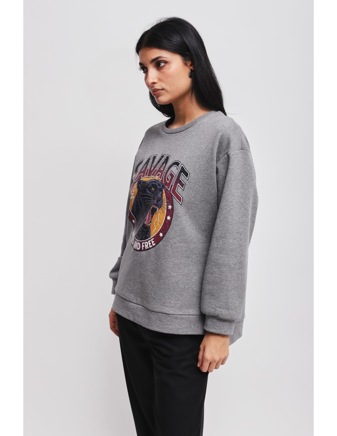 Maryley assina um top relaxed de corte suave que valoriza sem apertar. Algodão felpado no interior para calor e conforto, acabamento liso no exterior. Gola redonda limpa e maxi gráfica com efeito vintage que chama a atenção. Perfeito para o dia a dia arrojado, do denim ao look casual de escritório.
