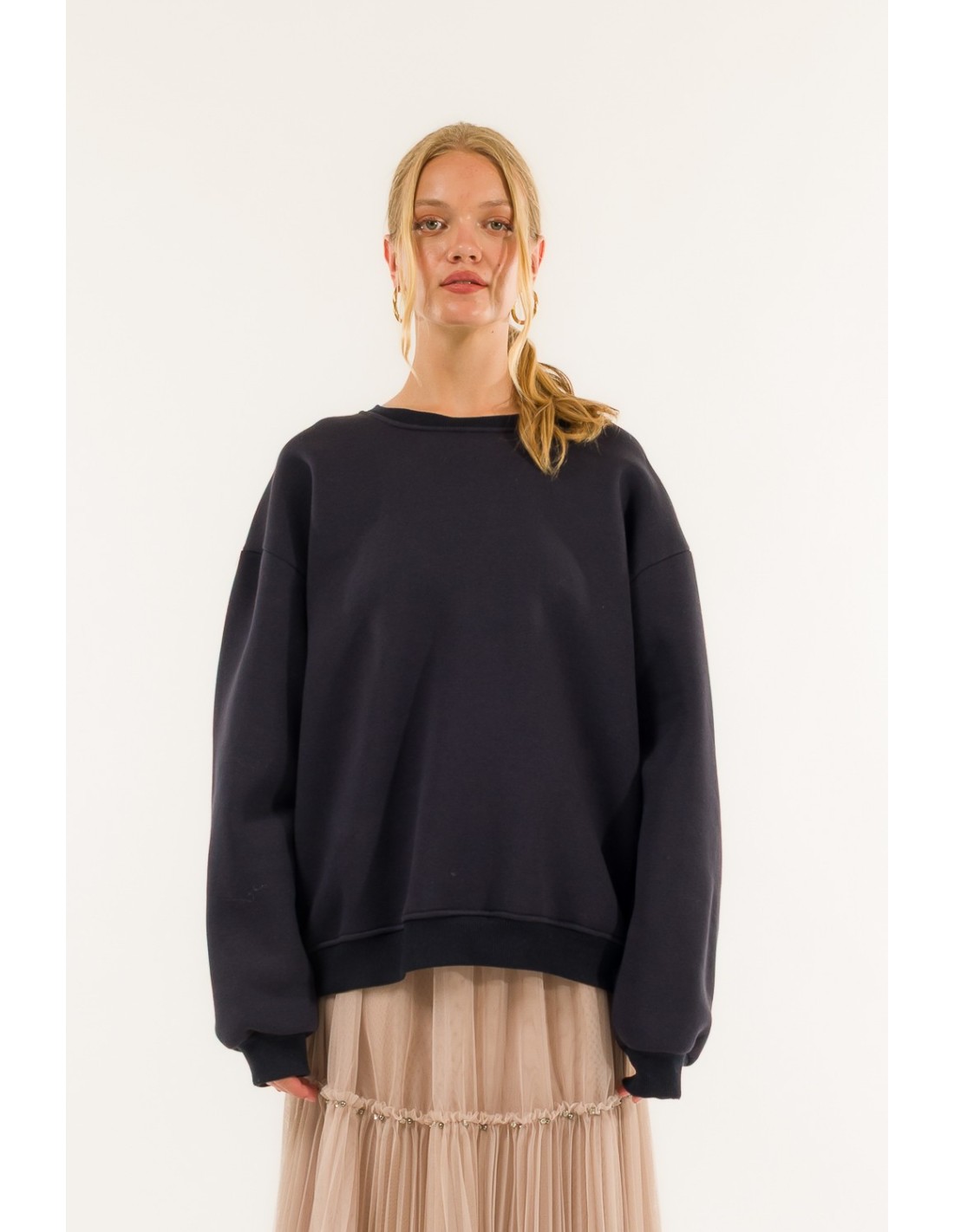 Aconchegante e moderna, esta camisola de grandes dimensões dá um toque urbano e chique a todos os looks. Perfeito para combinar com saias românticas e calças de ganga, é o epítome de um estilo sem esforço para usar todos os dias com personalidade.