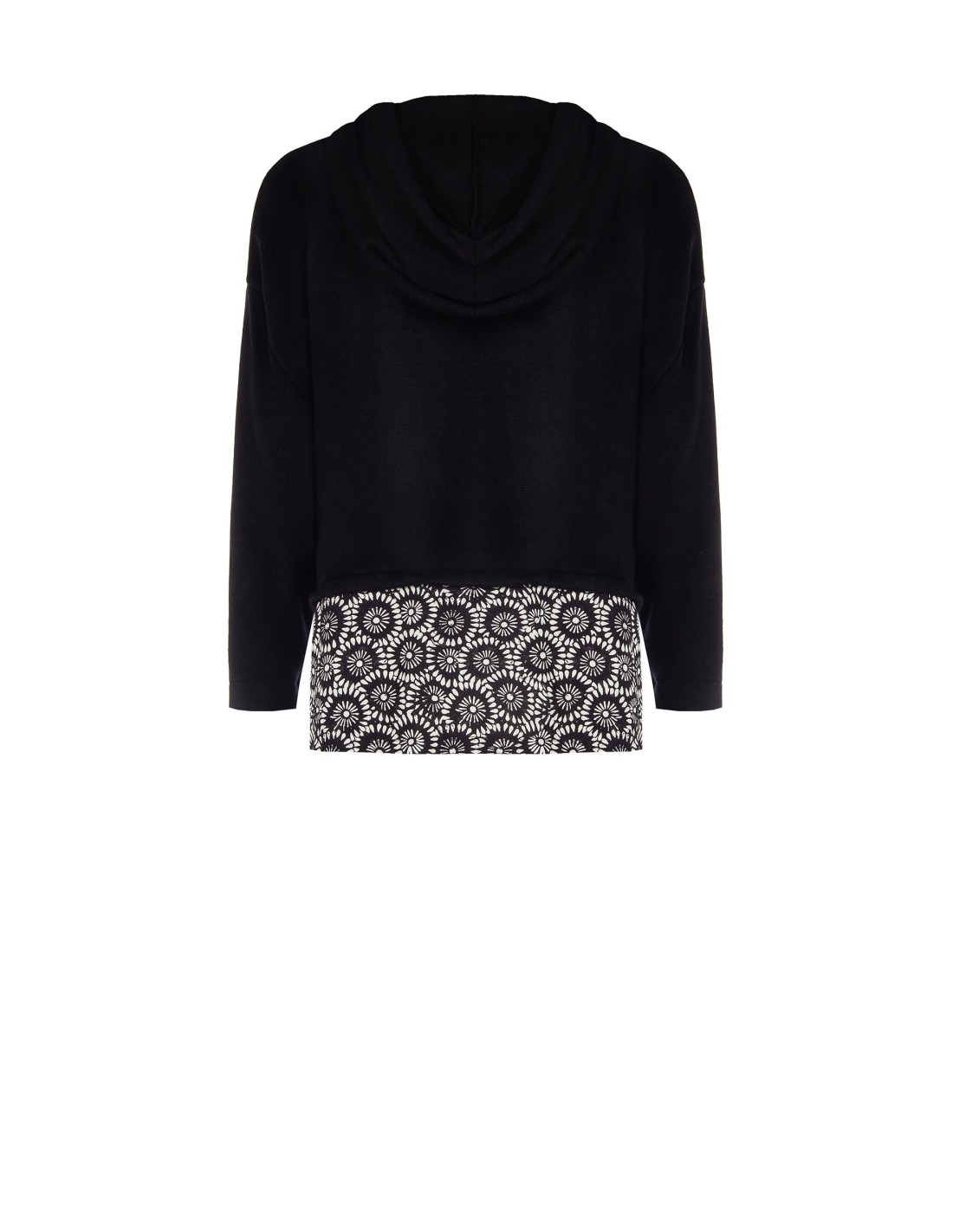 Sweat leve de corte macio e direito, em malha agradável na pele com barra em renda perfurada com motivo floral. Capuz com cordão estampado e barra dupla que alonga a silhueta. Perfeita para o dia a dia ou para o casual Friday: conforto refinado, fácil de combinar com denim ou calças de alfaiataria.