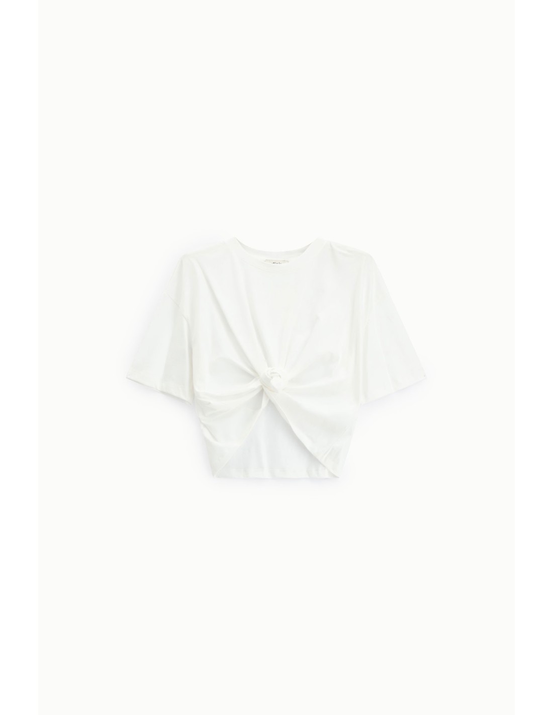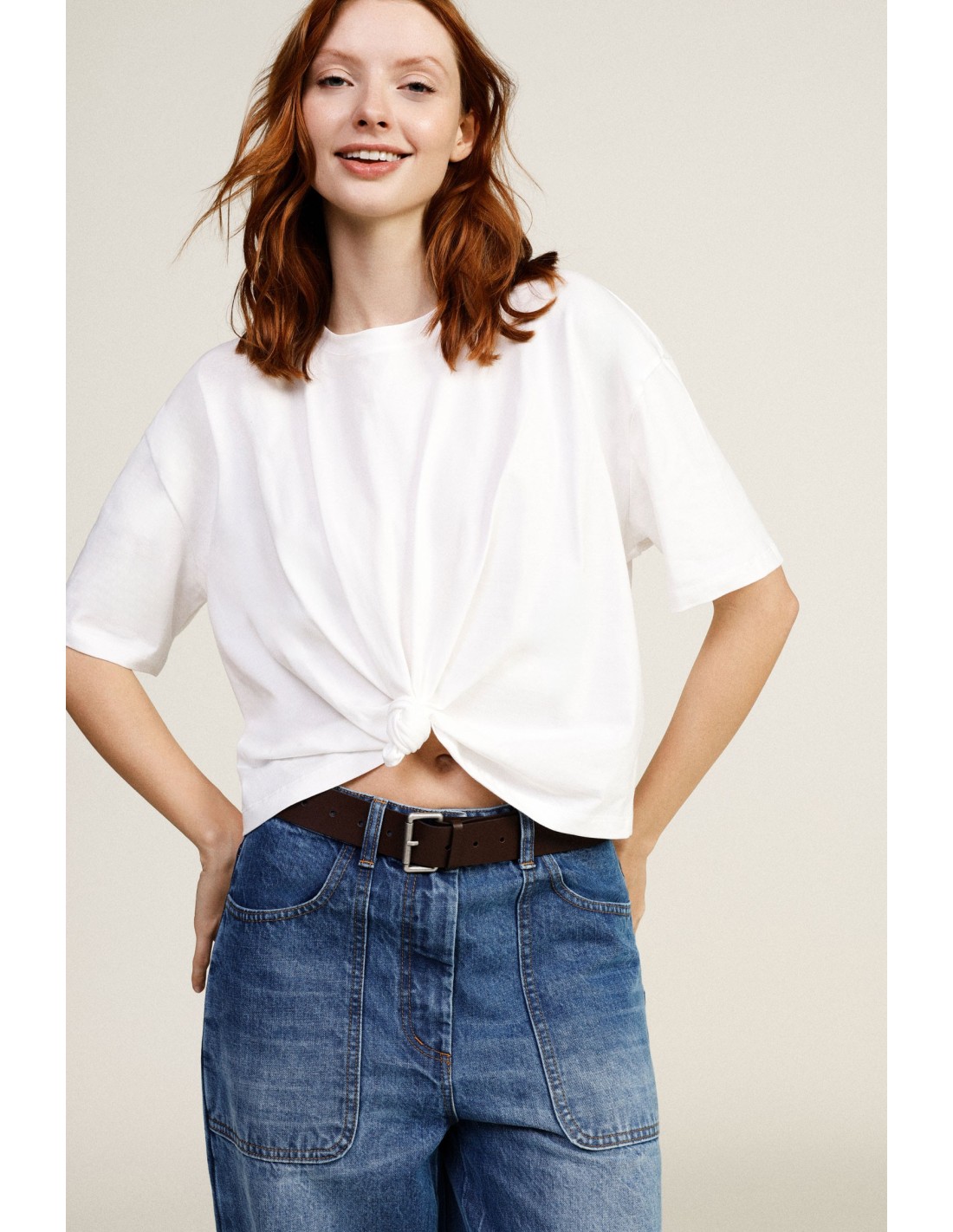 Um toque que dá carácter: a t-shirt de manga curta com um nó central valoriza a silhueta sem renunciar à praticidade. Corte suave, de queda leve, perfeita para dias informais ou para combinações originais com jeans e saias. Um detalhe simples que faz a diferença no dia a dia.