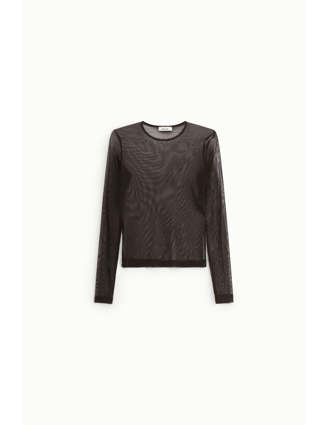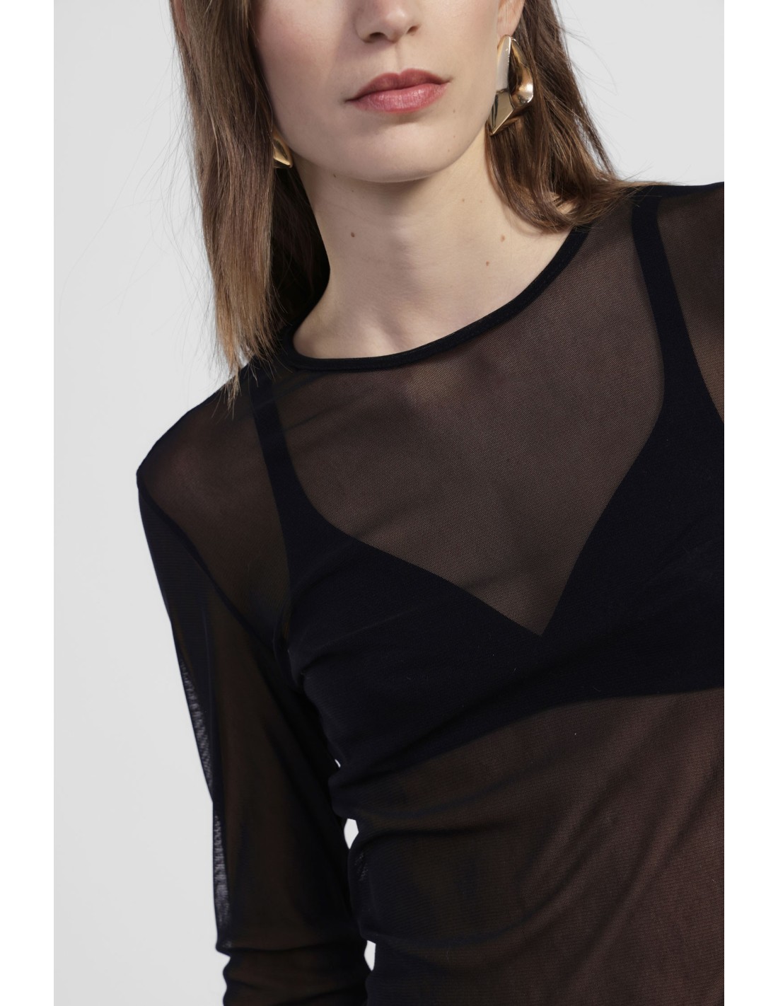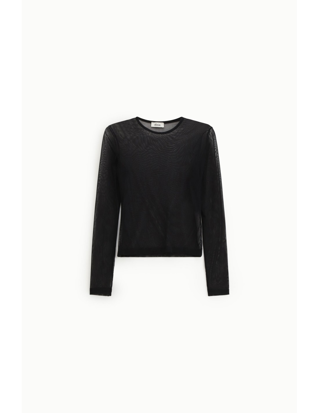 Esta t-shirt de mangas compridas com corte direito apresenta um efeito transparente que confere leveza e movimento a cada outfit. O decote redondo clássico torna-a adequada tanto para usar sozinha como base para looks em camadas. Perfeita para quem gosta de adicionar um toque original e versátil ao seu guarda-roupa.