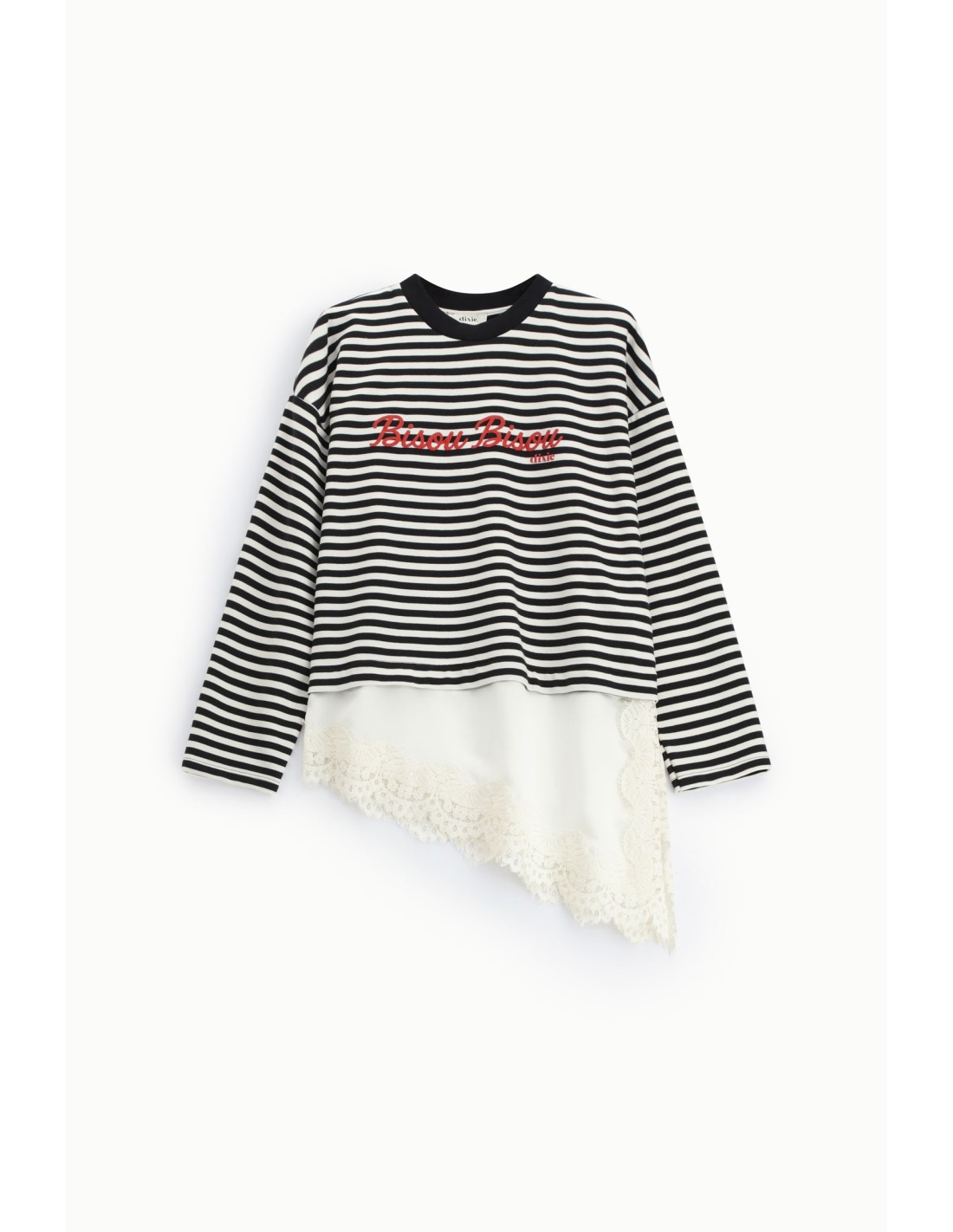 Deixa-te surpreender por esta t-shirt de mangas compridas com padrão às riscas e bainha inferior assimétrica enriquecida com renda. O lettering bordado na frente confere um toque original e feminino, perfeita para dar vida aos teus looks do dia a dia e sentires-te sempre única e cuidada nos detalhes.