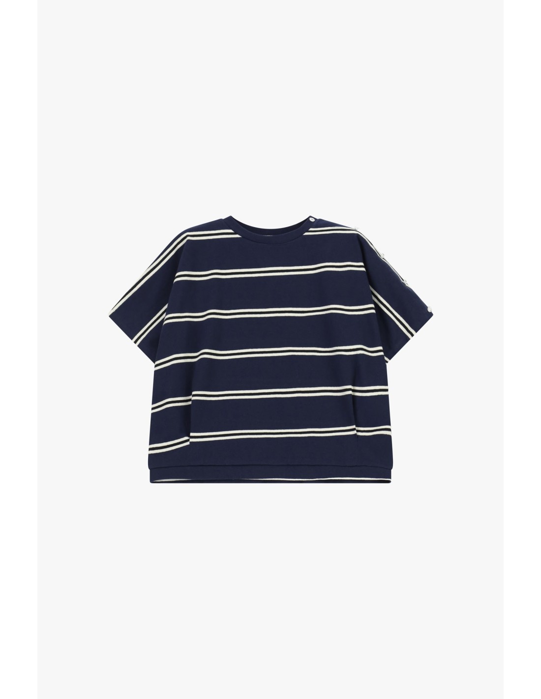 Perfeita para dias descontraídos, esta t-shirt de manga curta apresenta uma silhueta ampla e um clássico decote redondo. As riscas horizontais conferem um toque original e intemporal, ideal para criar looks casuais mas cuidados. Imagina combiná-la com os teus jeans preferidos para um passeio pela cidade.