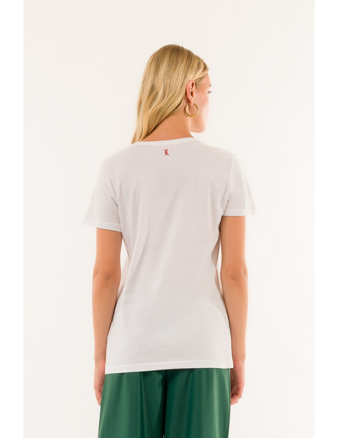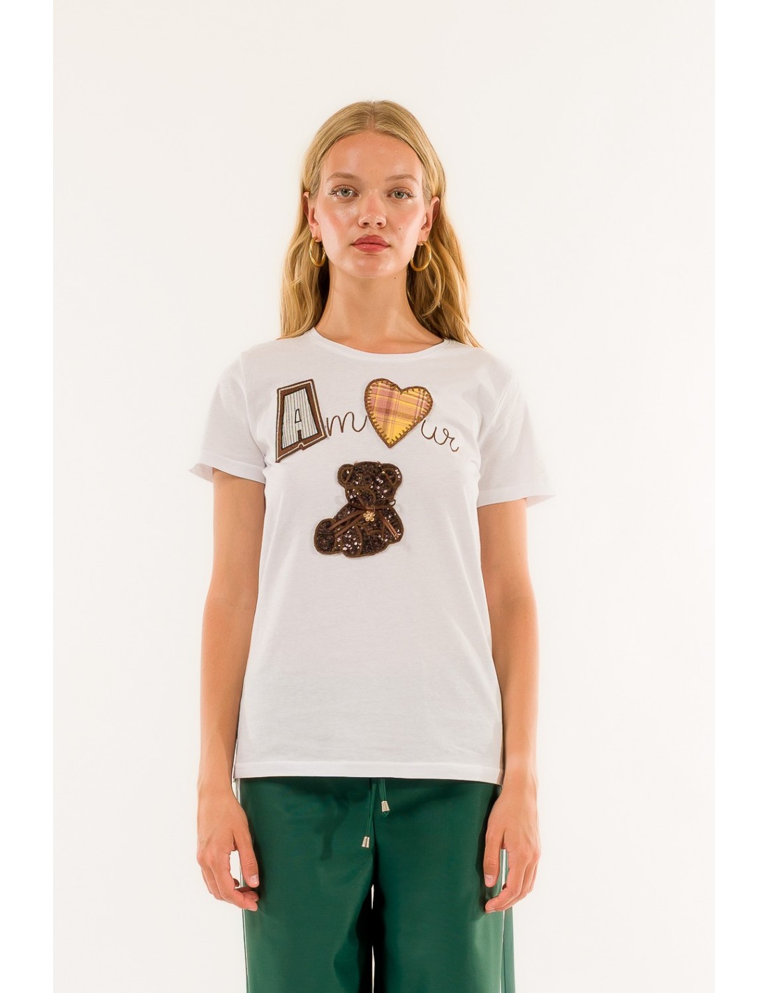 Deixe-se conquistar pelo charme único desta T-shirt: detalhes sofisticados e apliques originais dão-lhe um toque romântico e irresistível. Perfeita para quem quer destacar-se com um estilo doce, moderno e intemporal.
