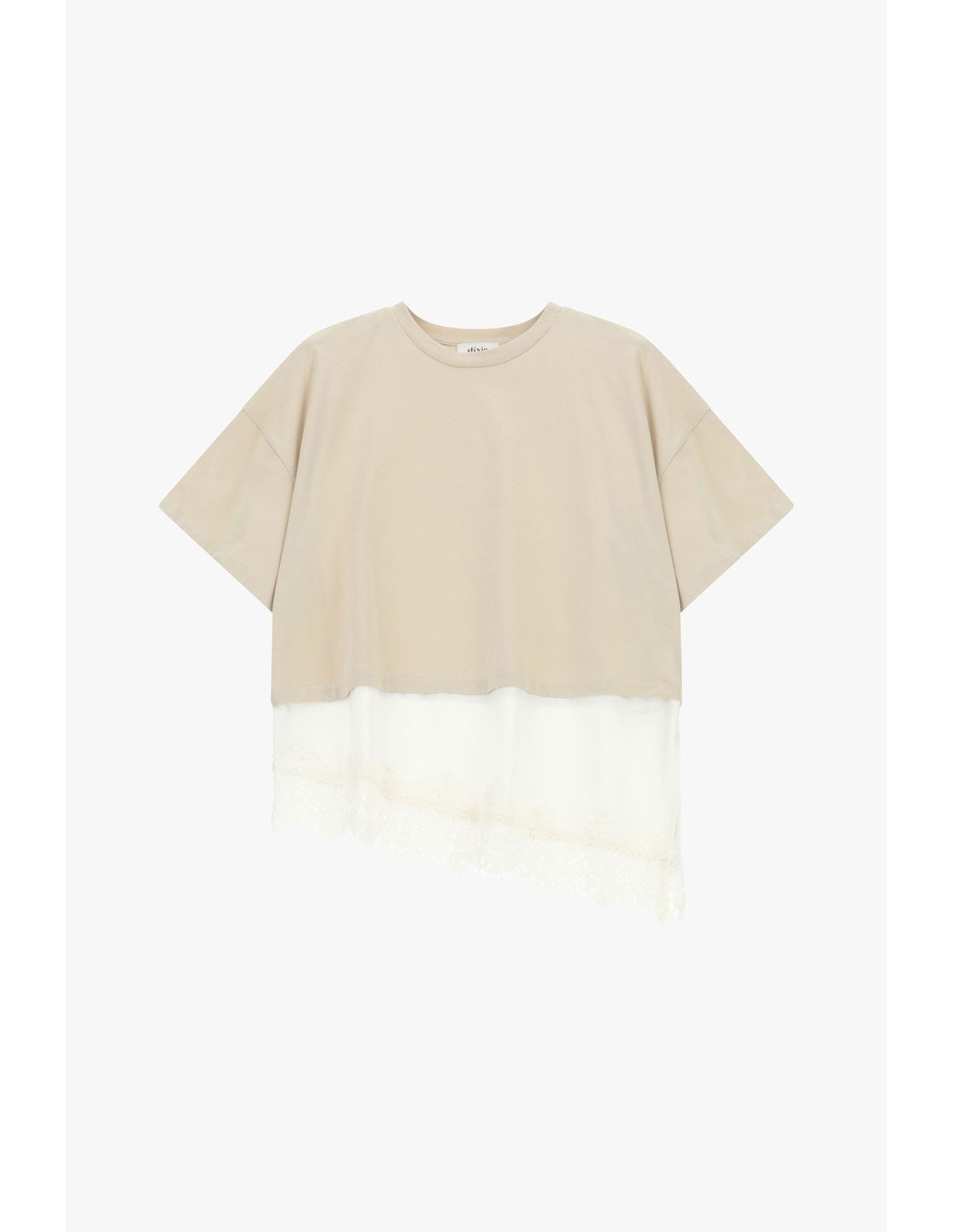 T-shirt com bainha assimétrica e detalhe em renda Dixie
