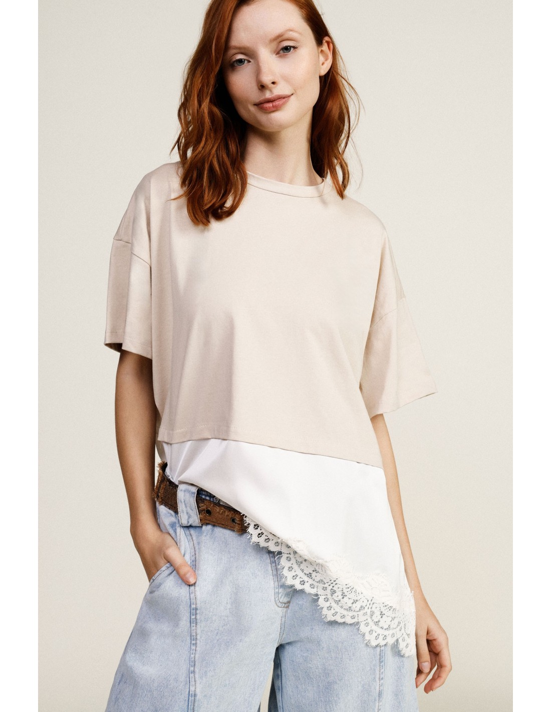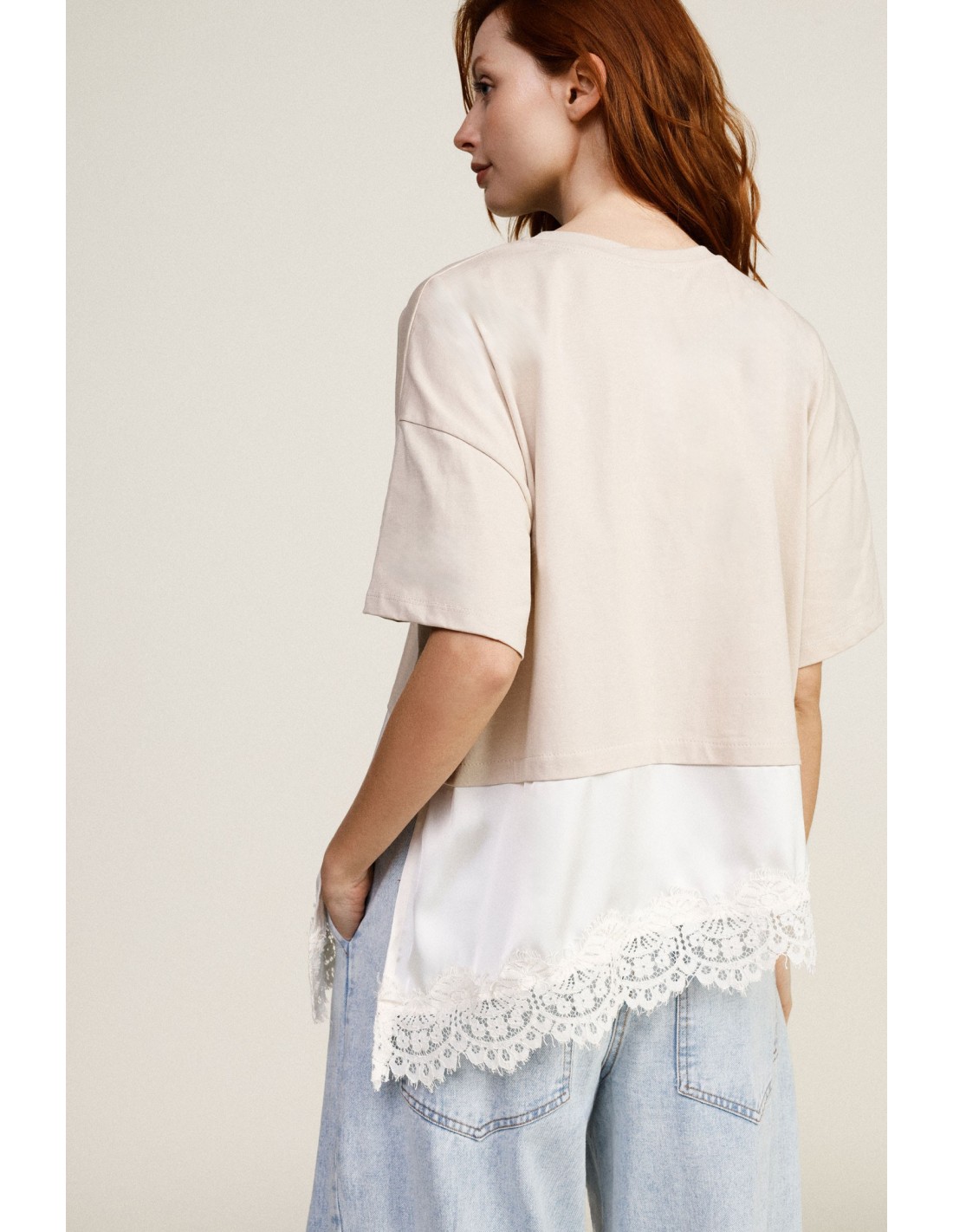 T-shirt com bainha assimétrica e detalhe em renda