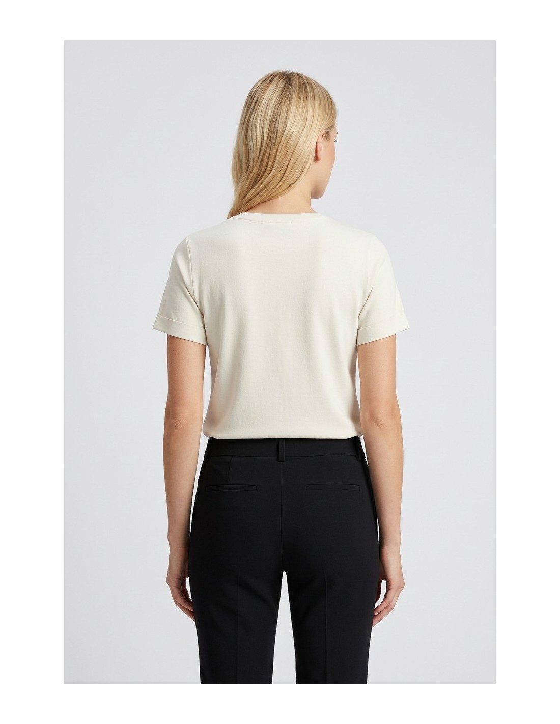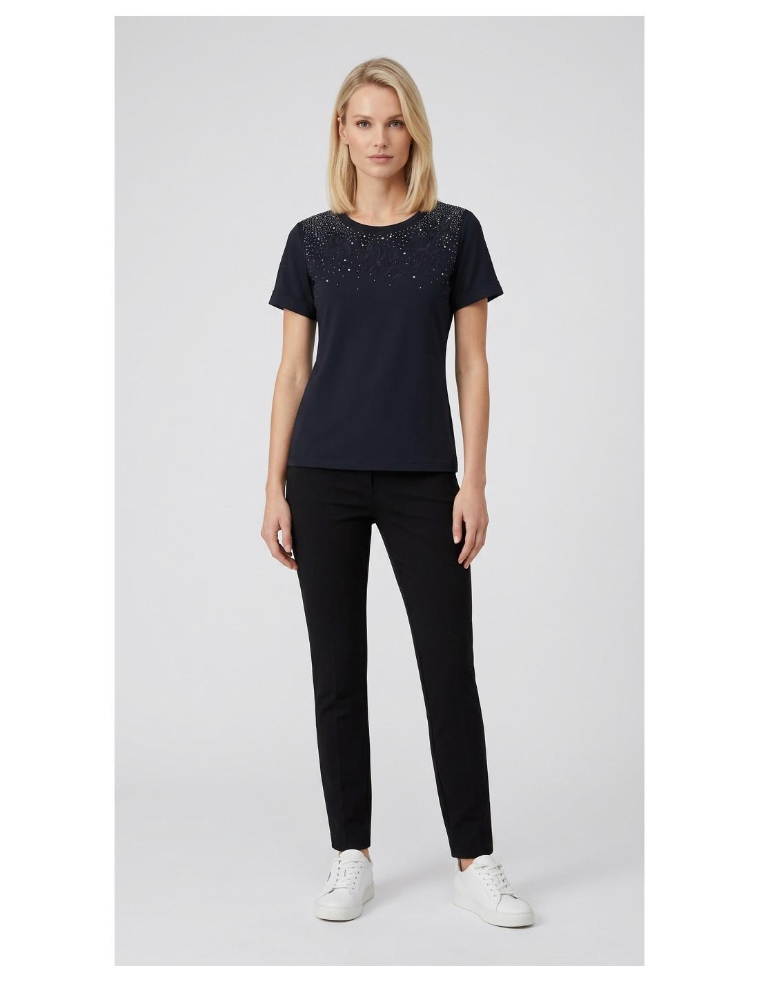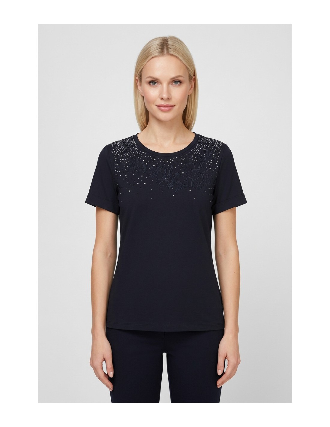 T-shirt com strass e bordado floral, decote redondo, mangas curtas, lisa.