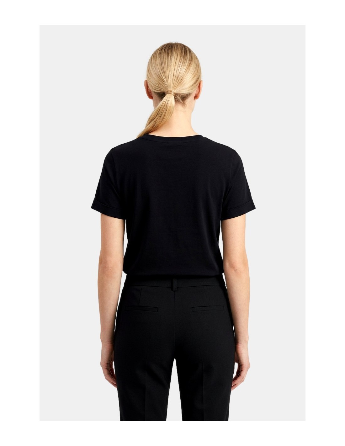 T-shirt com strass, gola redonda, mangas curtas.