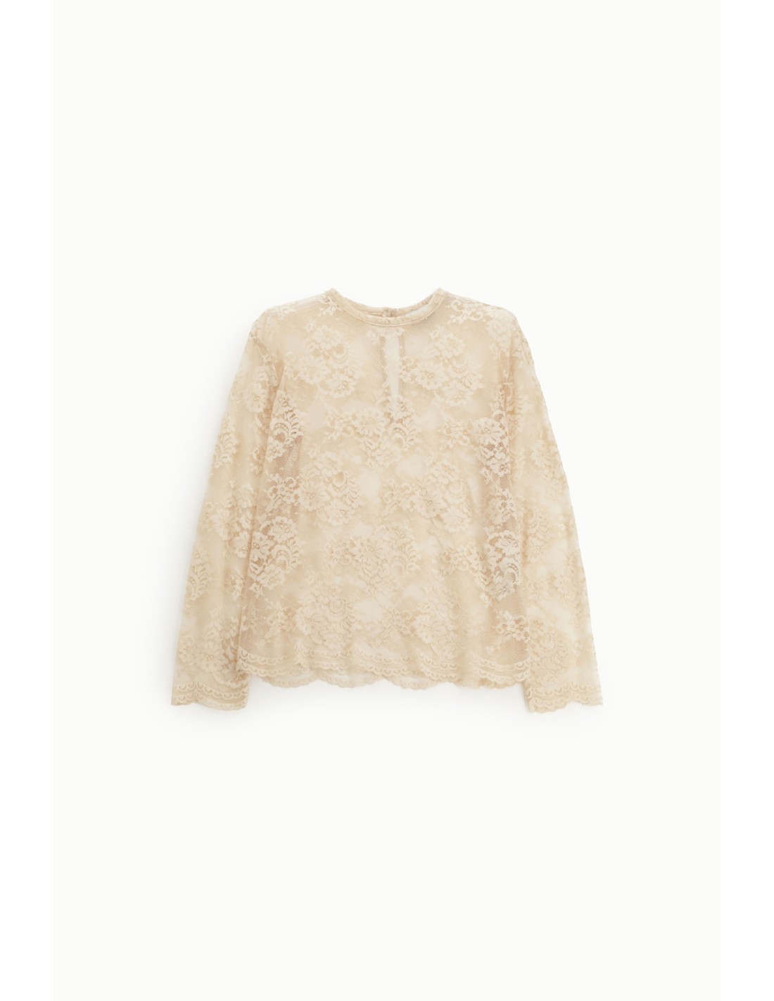 T-shirt de mangas compridas em renda com bainha festonada