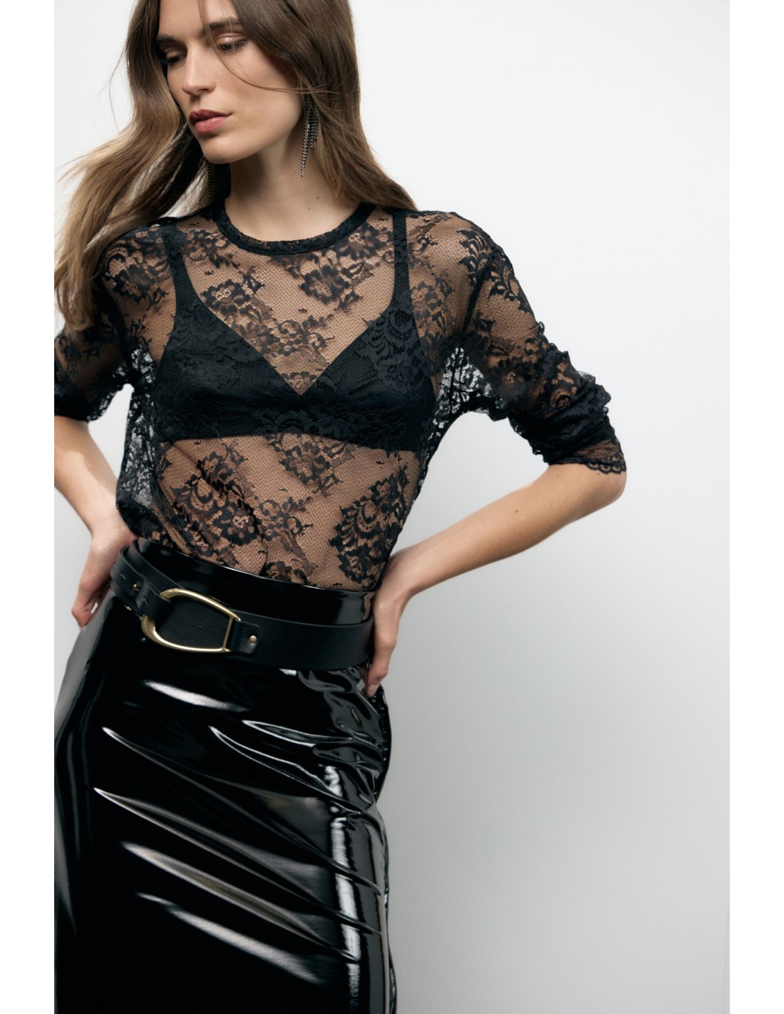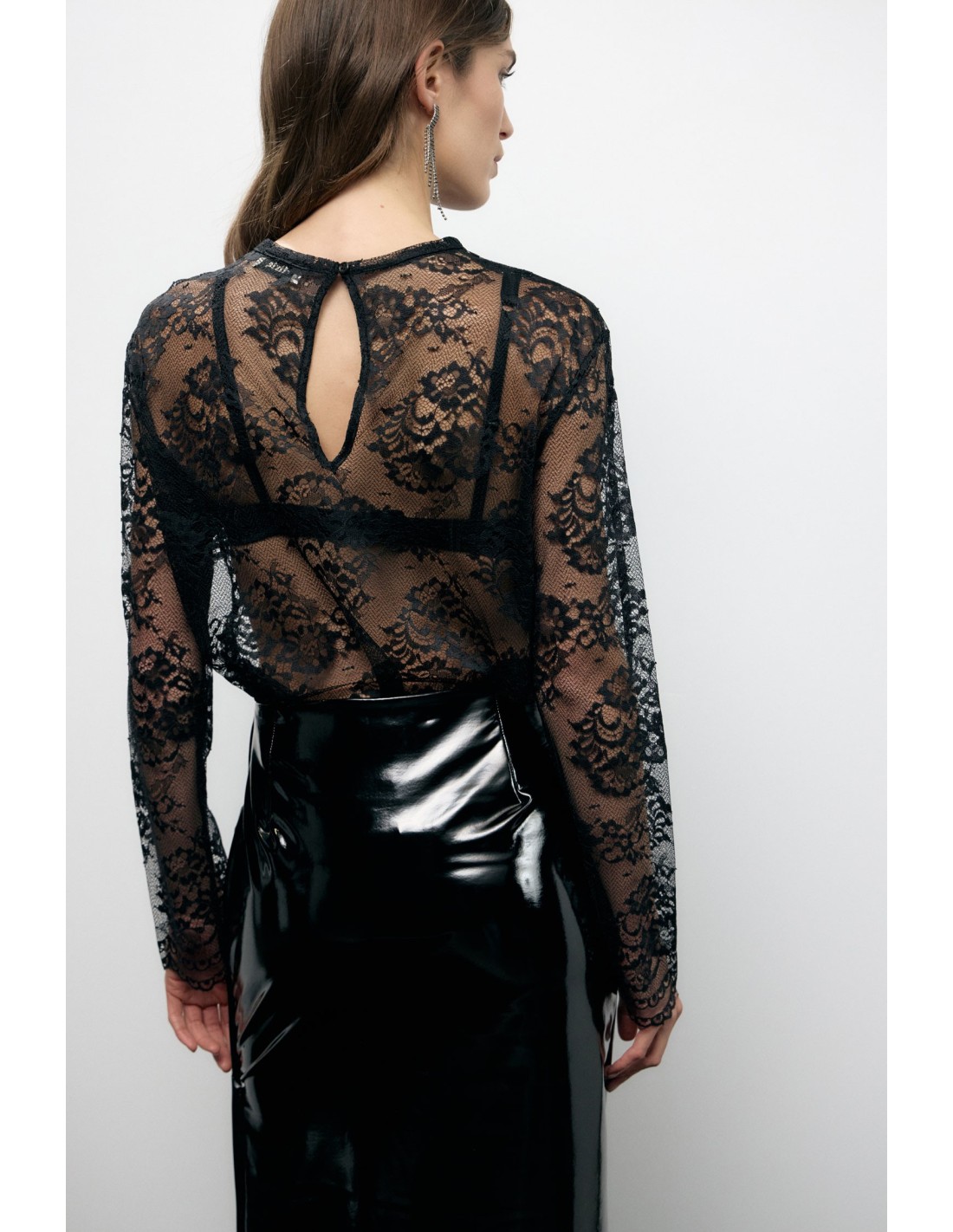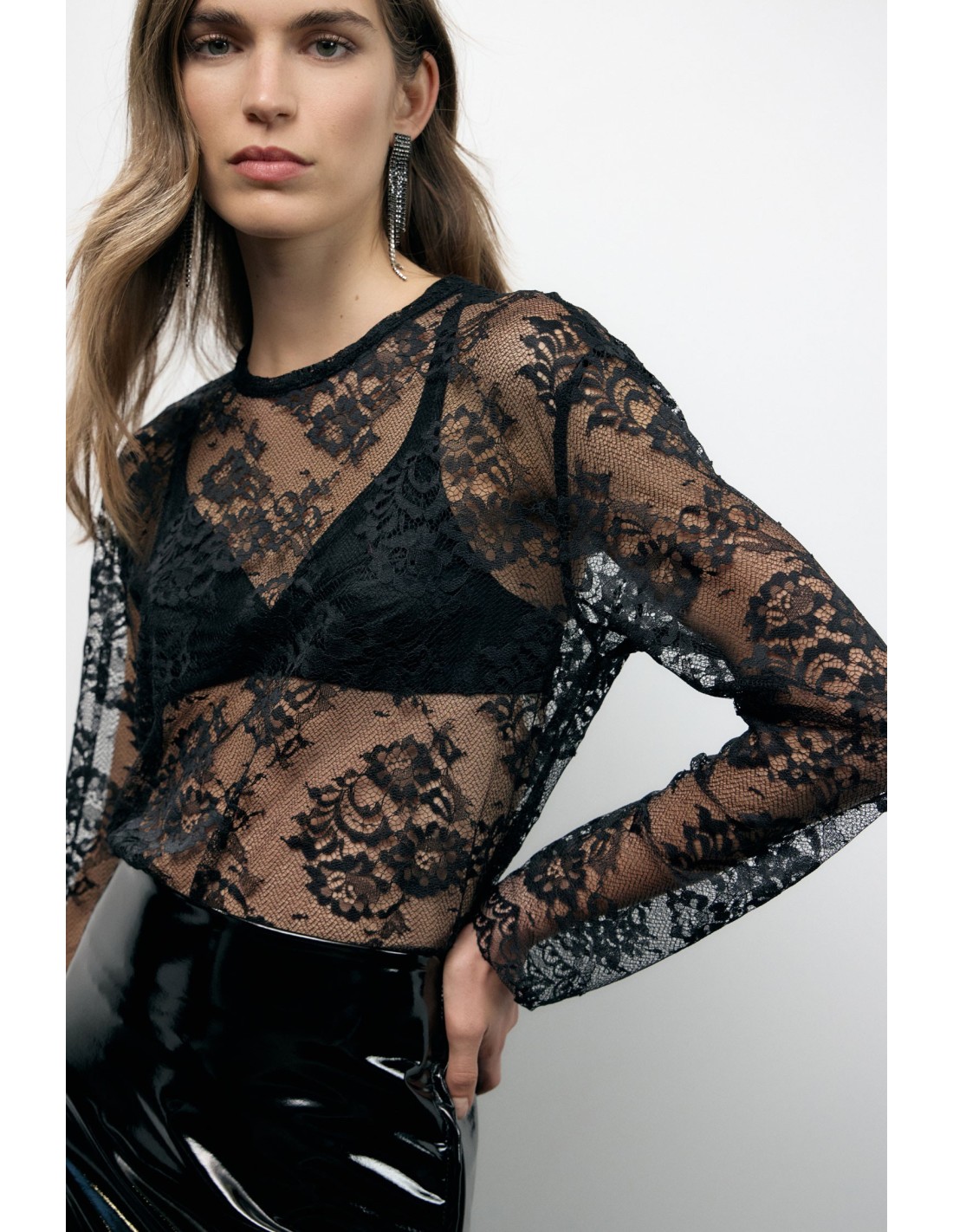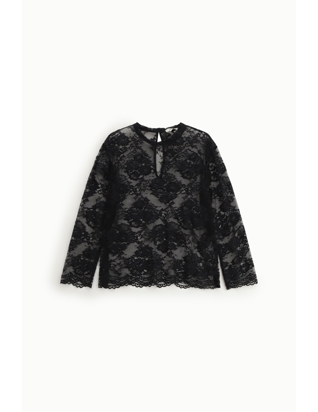 Esta t-shirt de mangas compridas apresenta um refinado padrão em renda que joga com transparências leves, valorizando cada detalhe com um acabamento delicado. A bainha festonada acrescenta um toque feminino e original, perfeita para se destacar tanto em ocasiões especiais como no dia a dia.