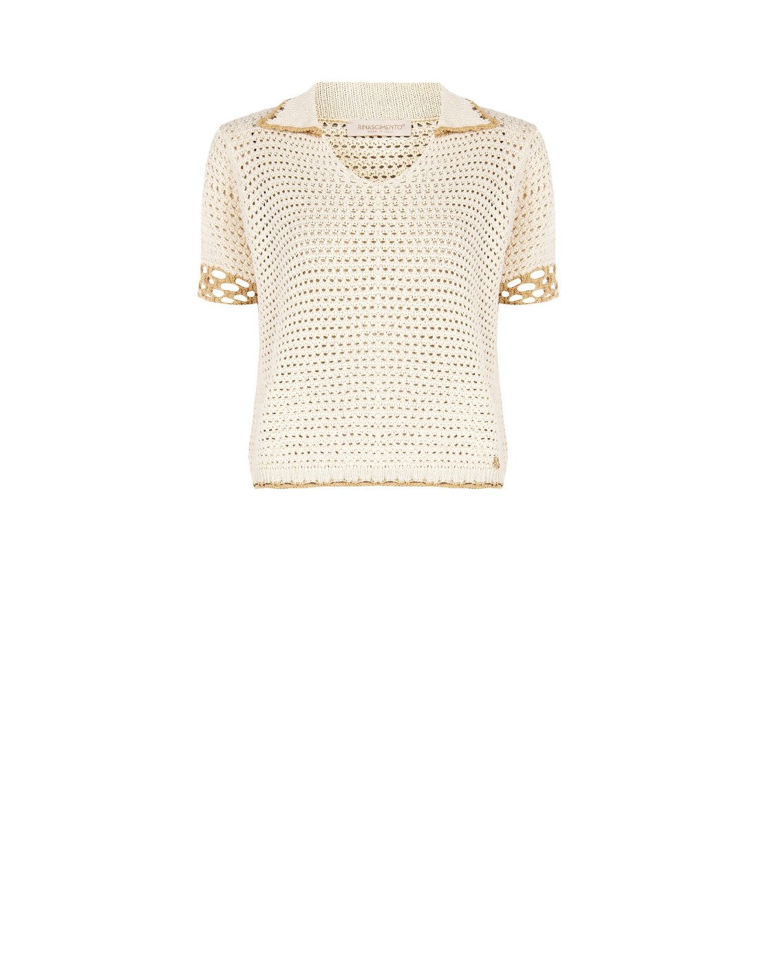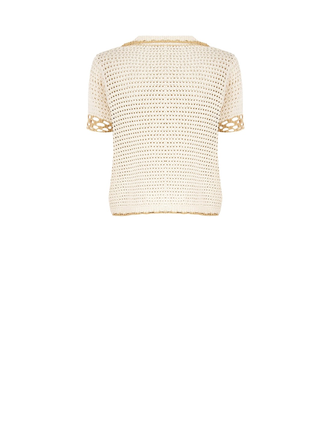 Camisola em algodão trabalhado em crochet com corte suave, ideal para acompanhar a silhueta com leveza e conforto. O decote em V com gola e as mangas com barra vazada acrescentam um toque requintado. Perfeita para o escritório, para o tempo livre e para looks do dia a dia cuidados.