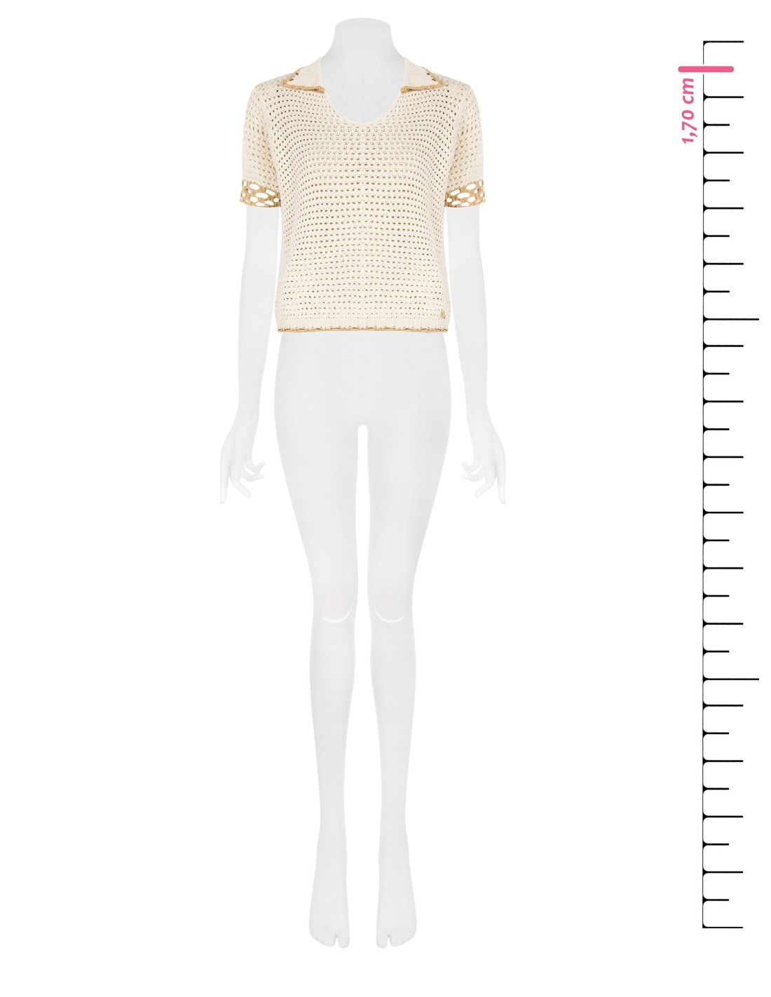 T-Shirt Em Croché De Algodão Com Decote Em V E Colarinho Rinascimento