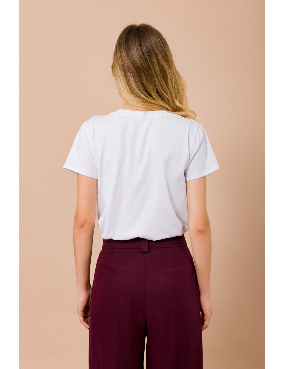 Maryley assina uma t-shirt de corte suave e feminino, em jersey de algodão liso para conforto diário. Textura enriquecida com bordados de missangas e micro-paillettes na frente, com decote redondo limpo. Perfeita para valorizar denim e alfaiataria: do escritório ao aperitivo, confere luminosidade e define a silhueta sem prescindir da praticidade.