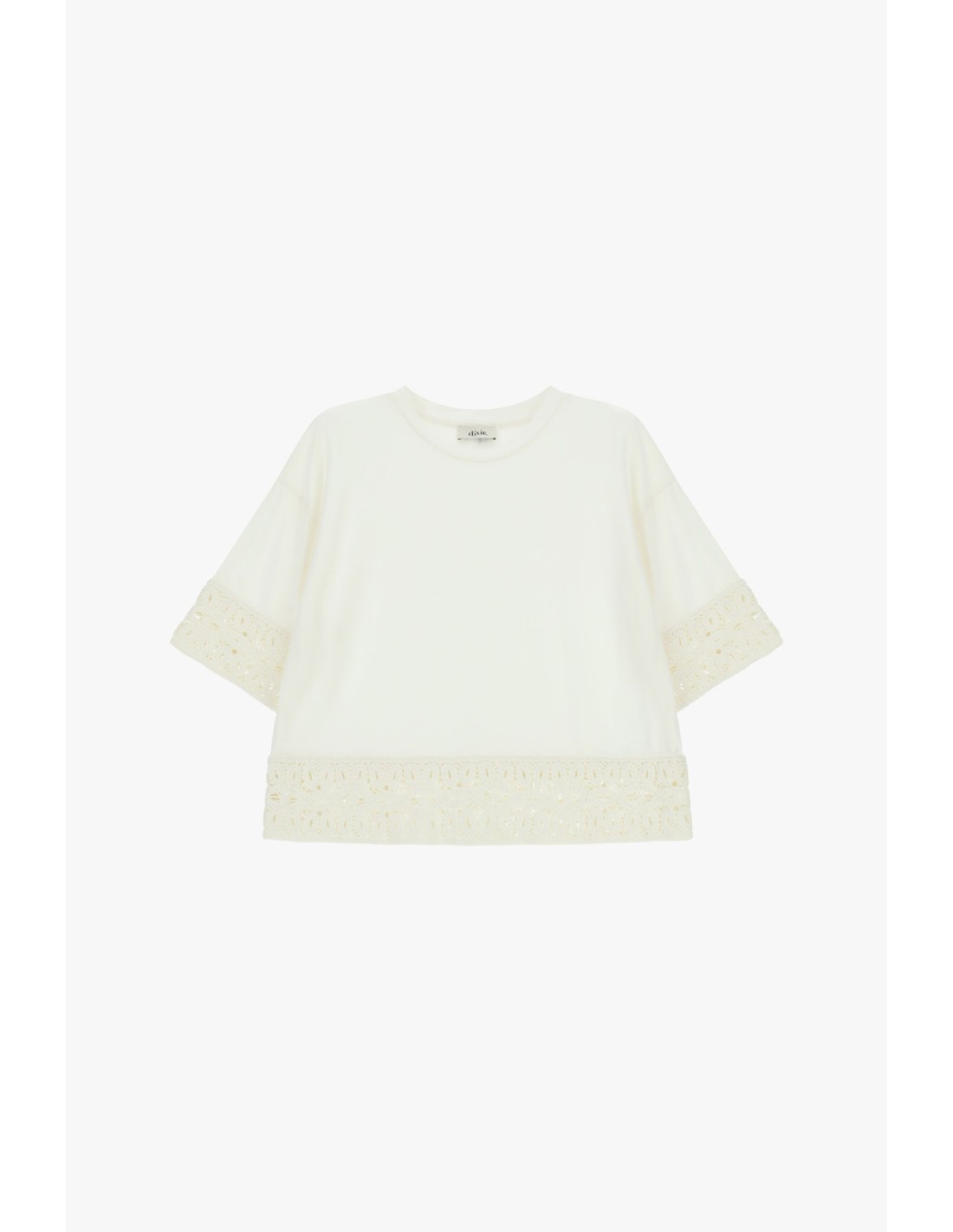 A t-shirt apresenta uma linha suave e uma gola redonda, embelezada por elegantes aplicações vazadas tanto nas mangas como na faixa inferior. Uma peça pensada para acrescentar um toque refinado e original aos teus looks quotidianos, perfeita para usar com jeans ou saias para te sentires sempre confortável e distinta.