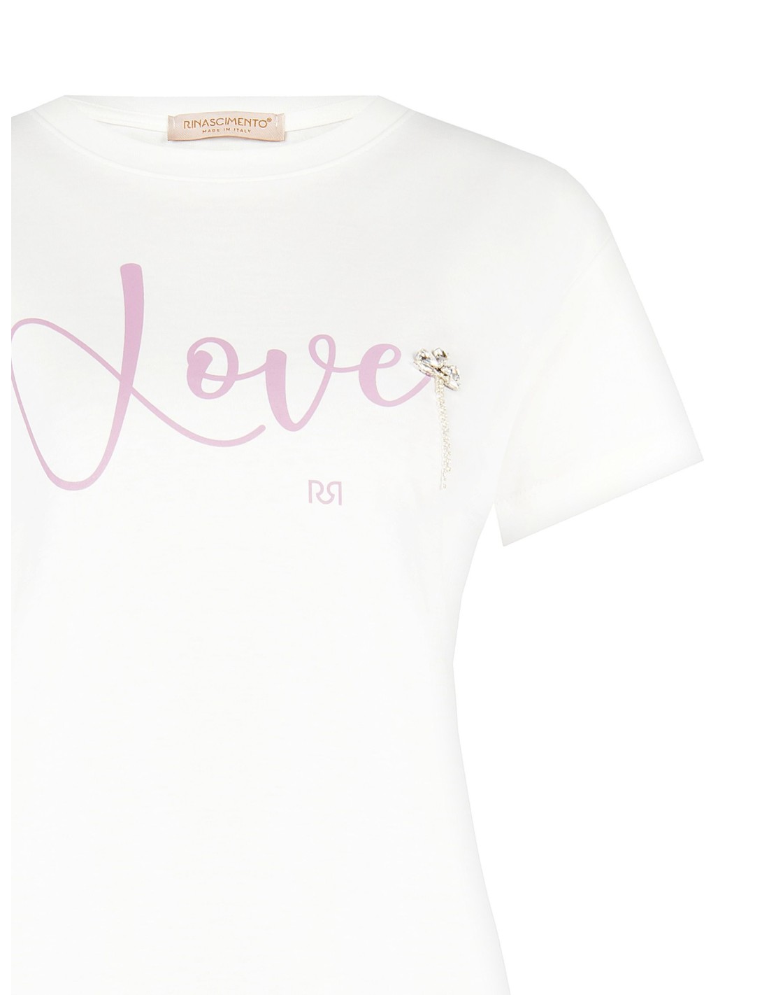 Rinascimento assina uma t-shirt de corte regular que valoriza a silhueta sem a apertar. Em suave algodão leve, garante conforto diário. A estampa com slogan romântico e a aplicação de cristais cabochon iluminam o peito. Perfeita com denim para o dia a dia ou por baixo de blazer no escritório.
