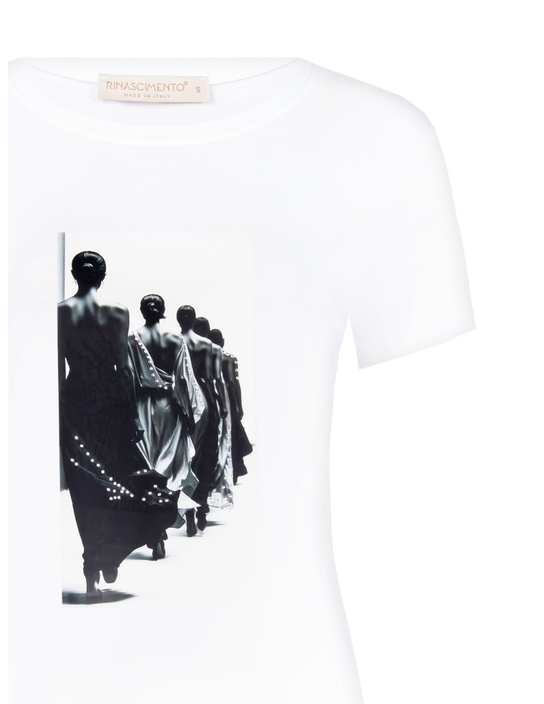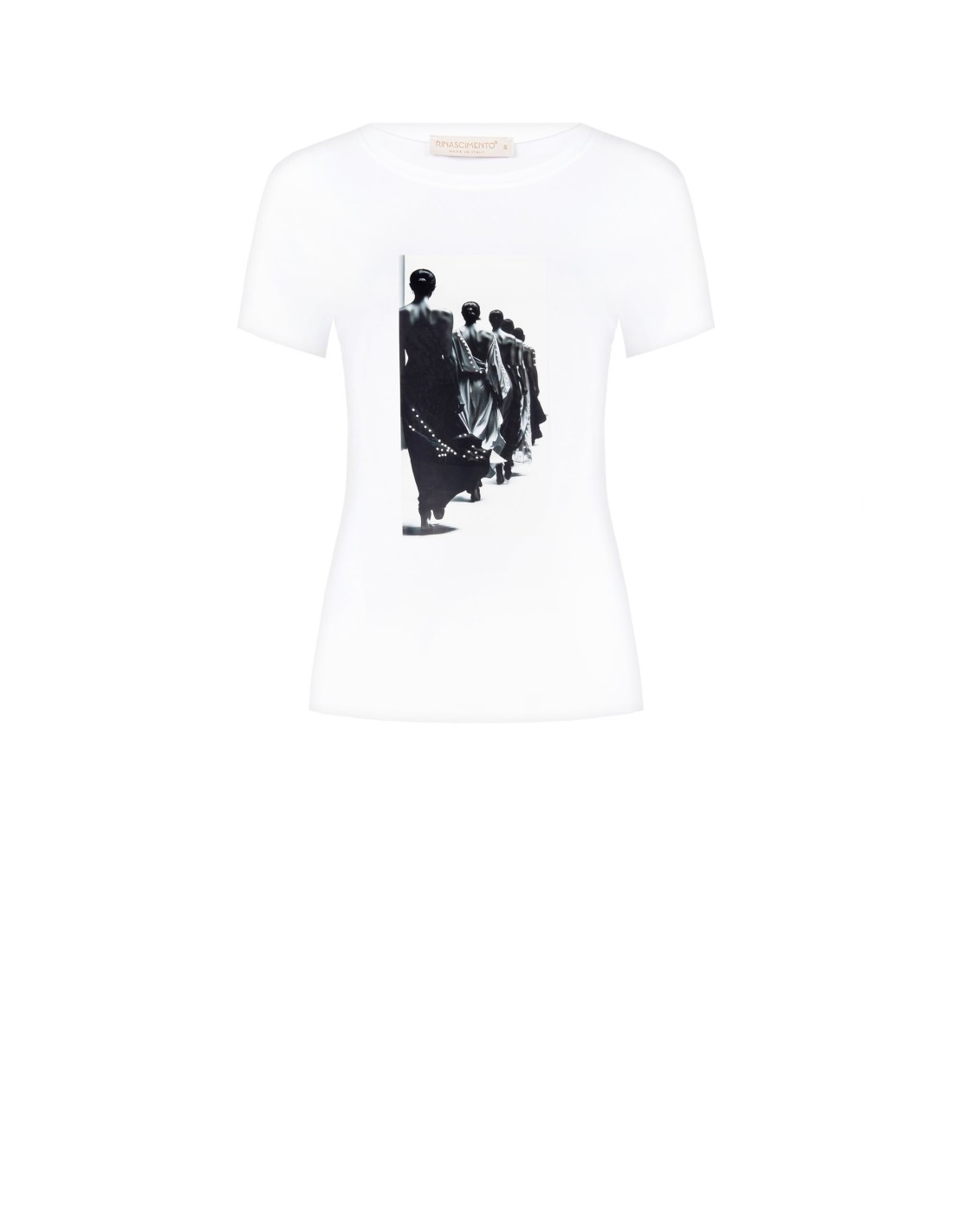 Top de manga curta com corte regular que valoriza a silhueta sem apertar. Jersey macio em mistura de algodão, agradável na pele. Estampa fotográfica frontal com micro-cristais e decote redondo limpo. Fácil de combinar para o uso diário, perfeita com ganga ou blazer para o escritório casual. Rinascimento.