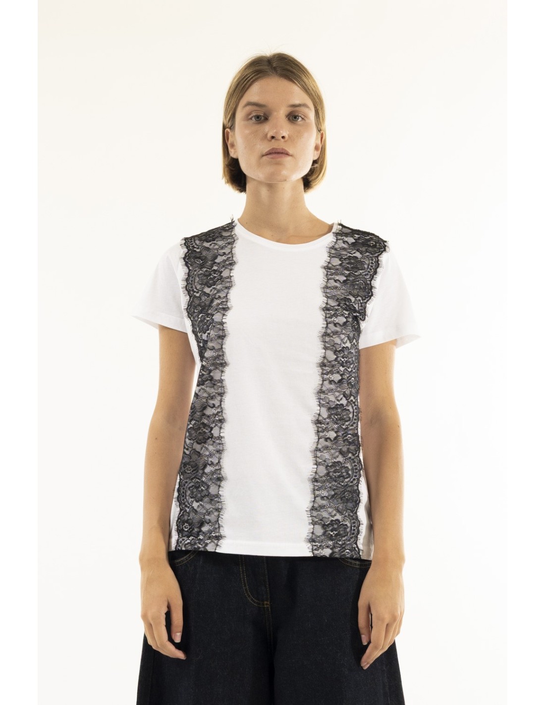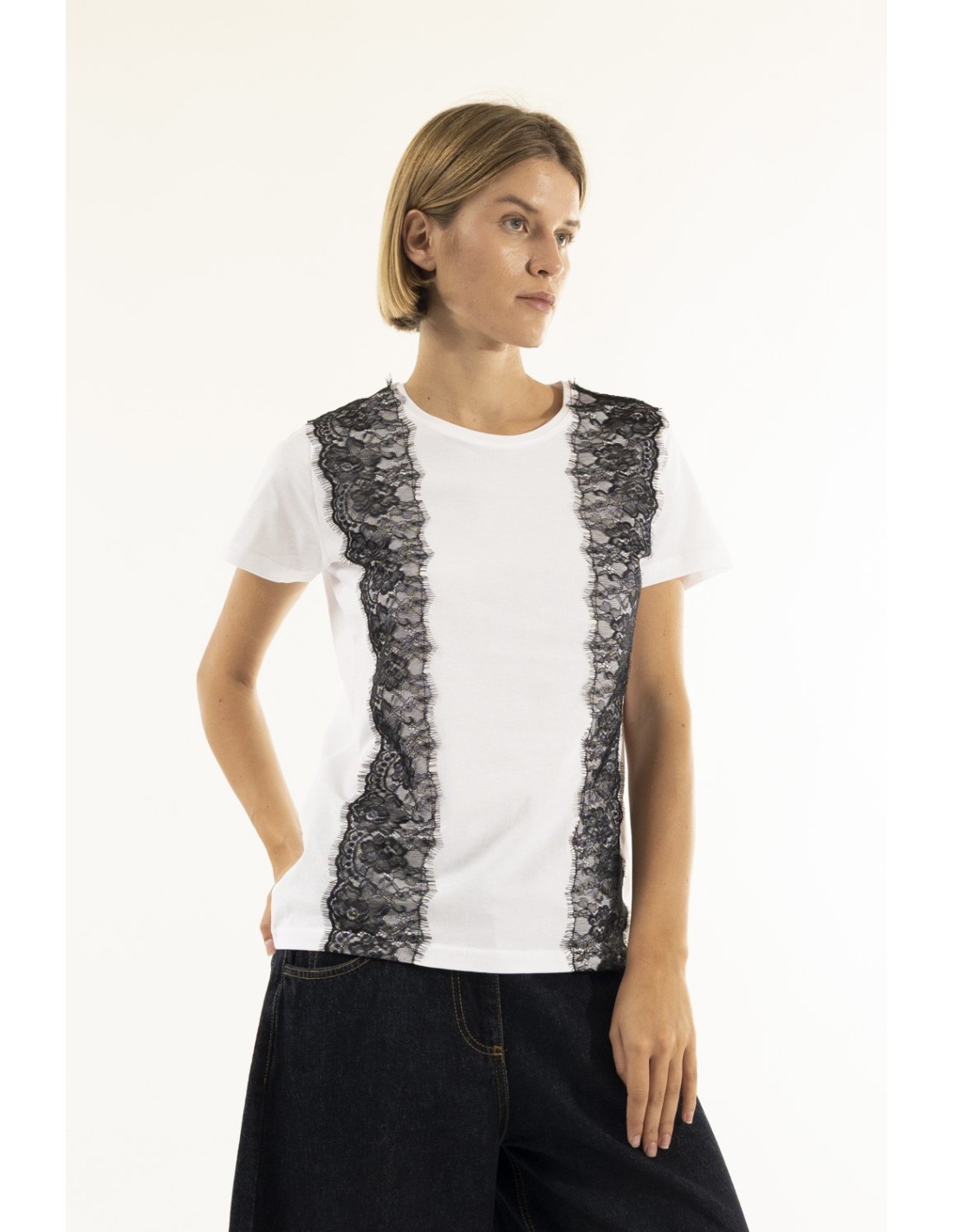 T-shirt Kontatto com corte reto e confortável. Algodão macio com painéis em renda de efeito slimming que valorizam a silhueta. Decote redondo simples e bordos em renda ligeiramente desfiados para um toque romântico. Versátil: perfeita com denim para o dia a dia ou por baixo de blazer para o escritório e o aperitivo.