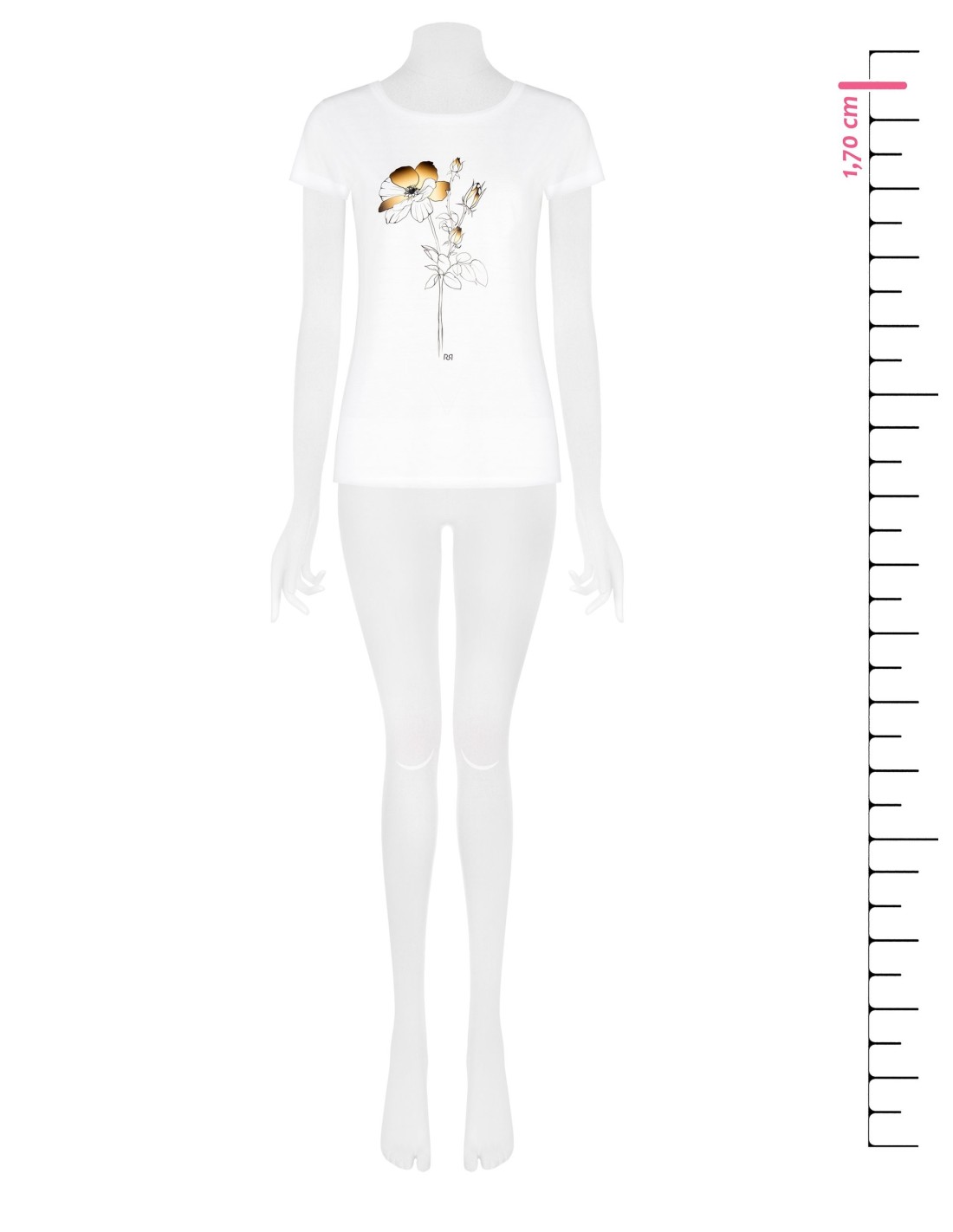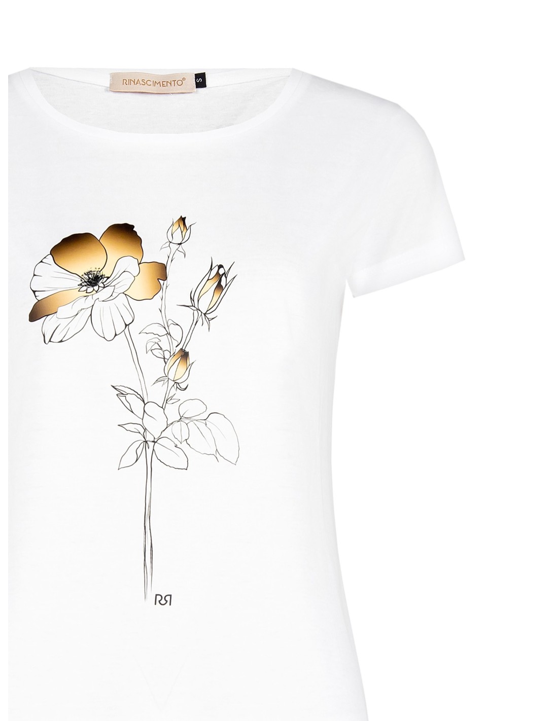 T-shirt Rinascimento de corte recto que realça a silhueta sem apertar. Macio jersey de algodão, agradável na pele. Estampa floral gráfica com toques brilhantes e decote redondo simples: detalhes que elevam os looks. Perfeita para o dia a dia, do denim ao escritório com blazer leve.