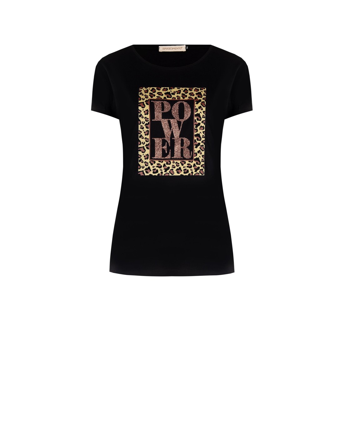 Camisola com um corte slim que realça a silhueta sem apertar. Em jersey elástico macio, confortável durante todo o dia. Gráfico frontal com moldura em animal print e lettering brilhante, decote redondo clean. Perfeito com blazer para o escritório ou com ganga para o dia a dia com um toque forte. Marca Rinascimento.