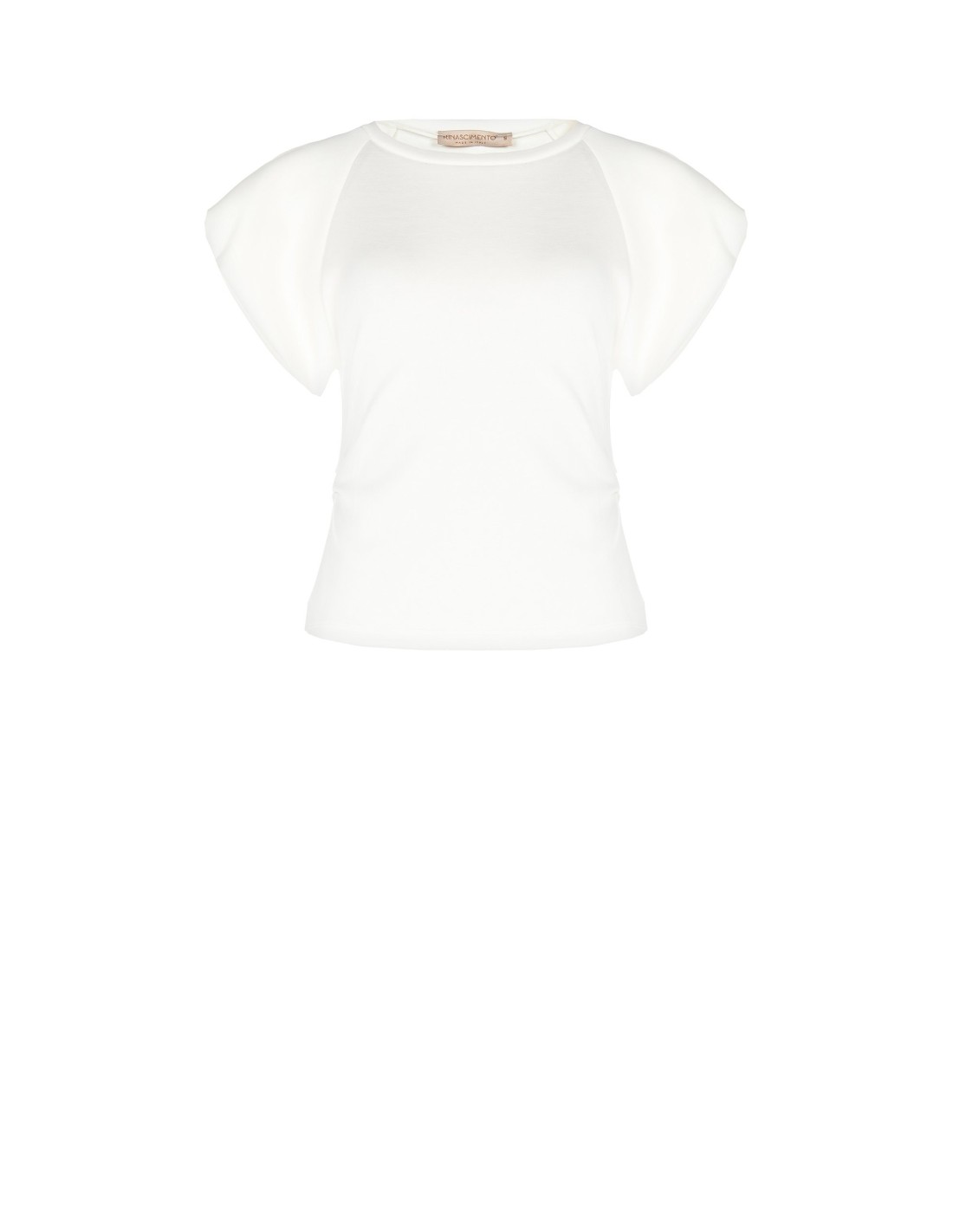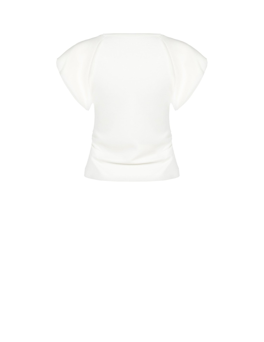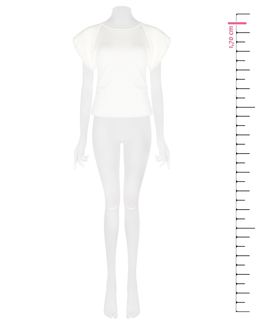 Linhas limpas e caimento suave que segue a silhueta, em jersey stretch macio com inserções mais estruturadas nas mangas. O decote redondo essencial e as mangas com volume acrescentam caráter sem renunciar ao conforto. Perfeito do escritório ao tempo livre com calças ou saias de cintura alta.