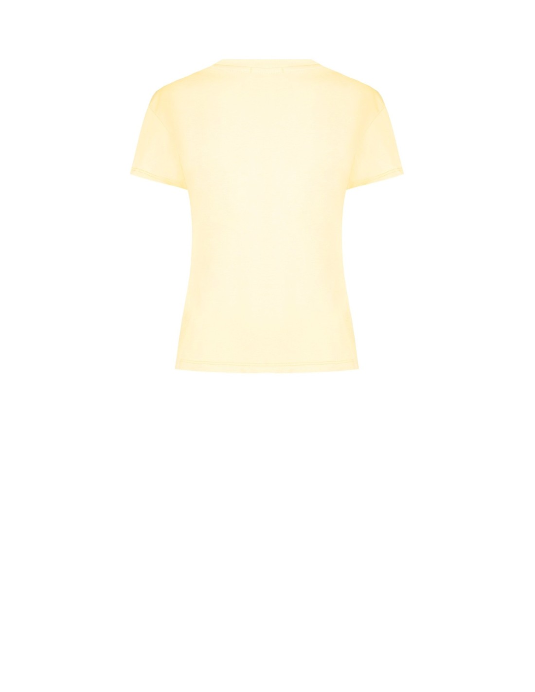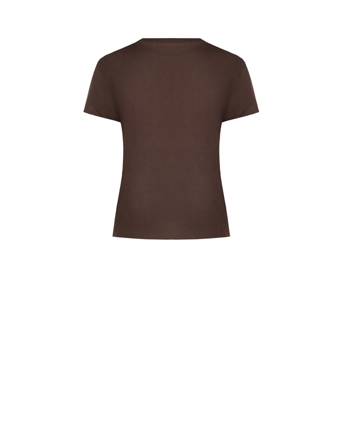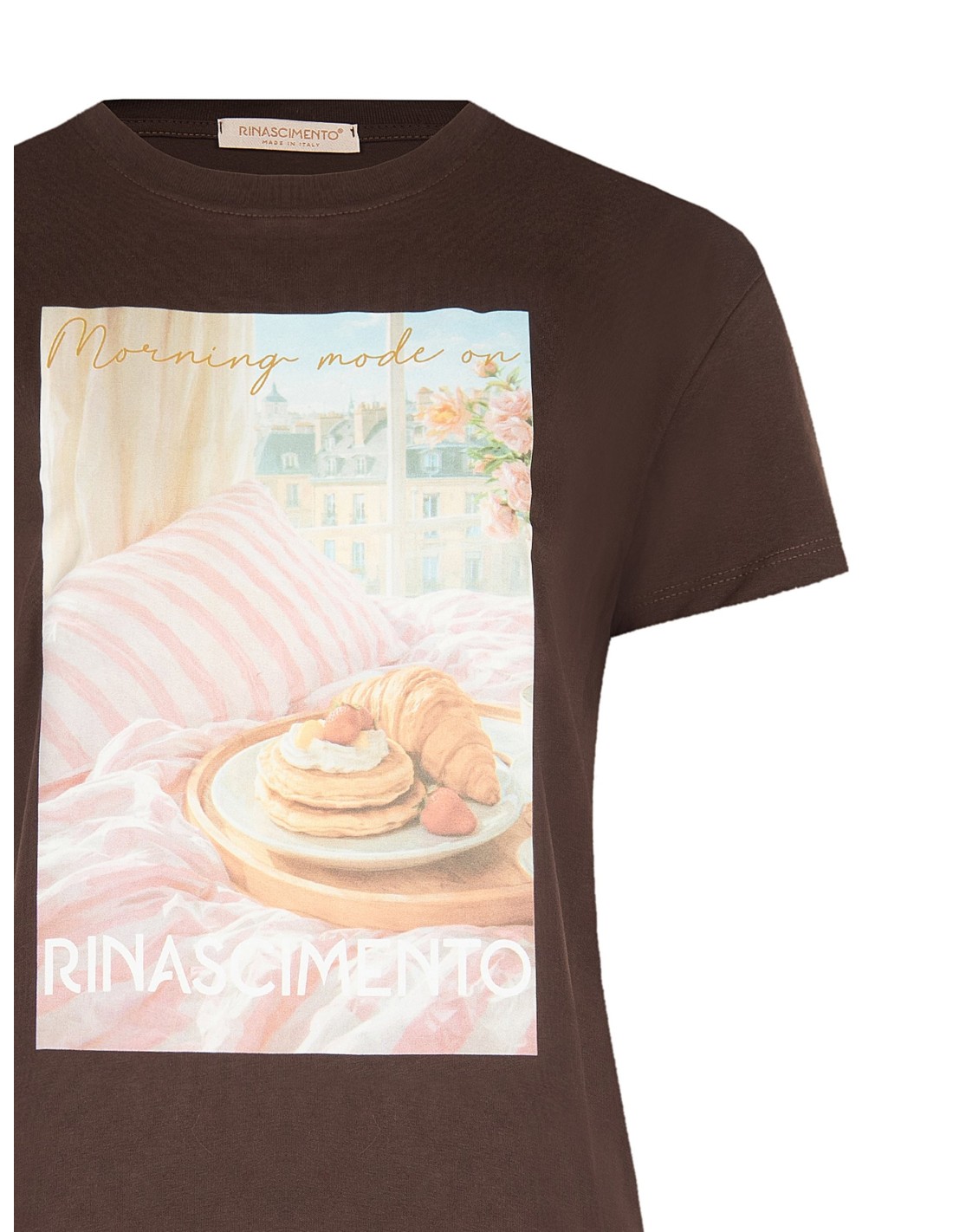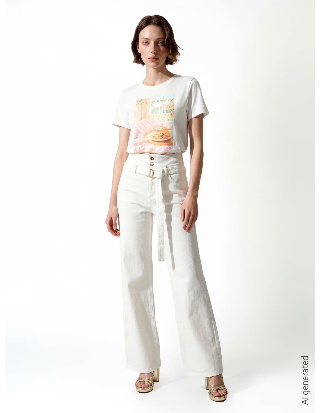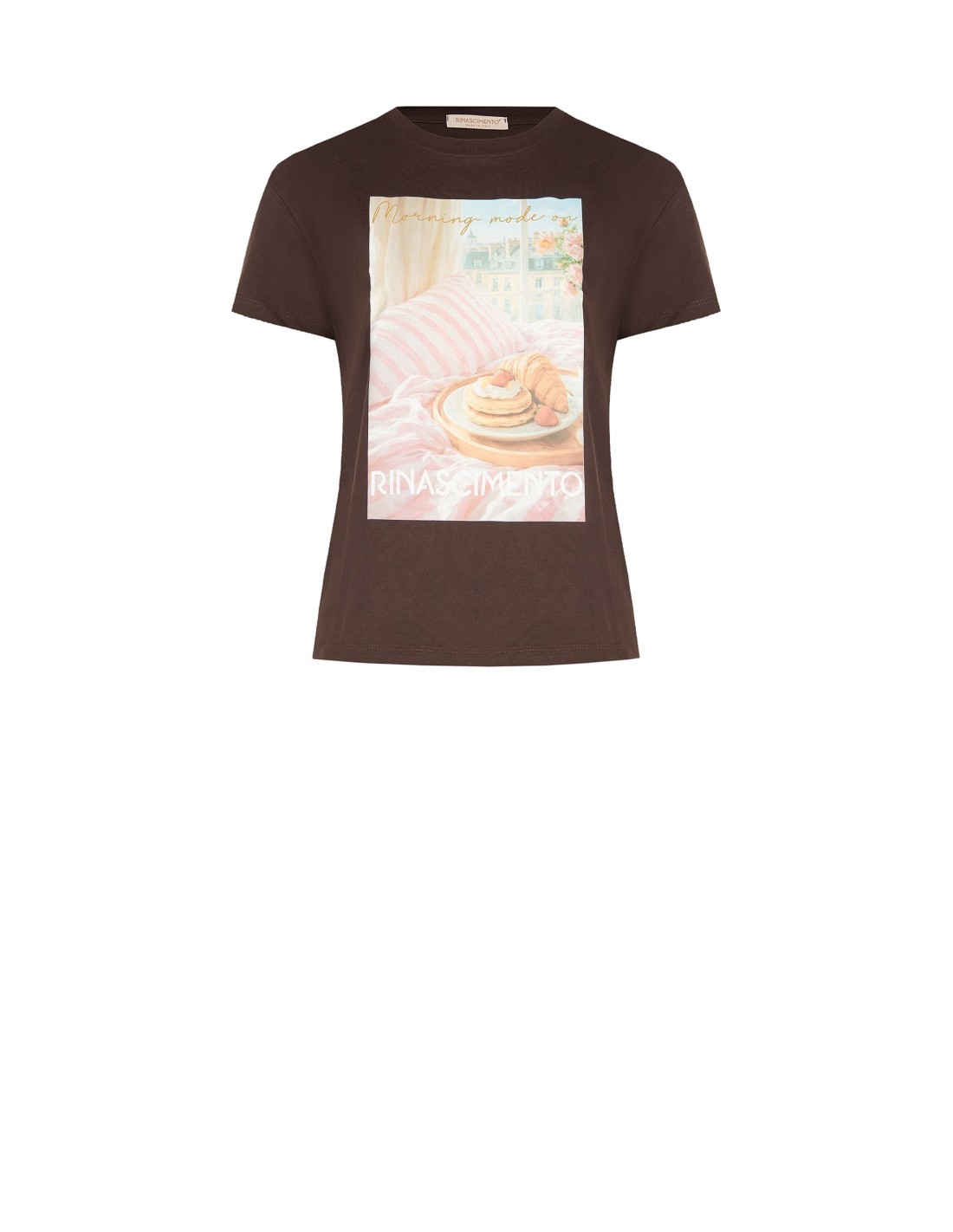 Top em jersey macio com corte reto que acaricia a silhueta sem marcar. A estampa frontal com um mood morning chic e o decote redondo limpo tornam‑no perfeito para looks do dia a dia: do jeans ao fato suave, traz um toque de doçura à cidade.