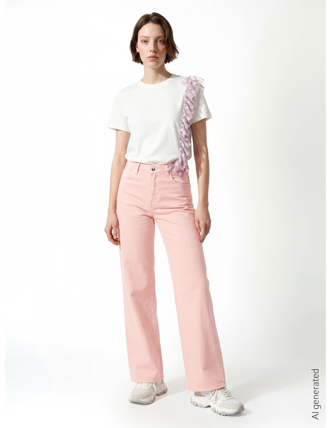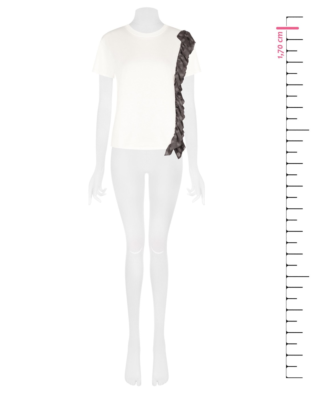 Linha reta e corte solto em jersey de algodão, enriquecido por um romântico folho lateral em tule plumetis. O detalhe às bolinhas alonga a silhueta e acrescenta personalidade aos seus looks do dia a dia, perfeito com denim ou blazer para o escritório informal.