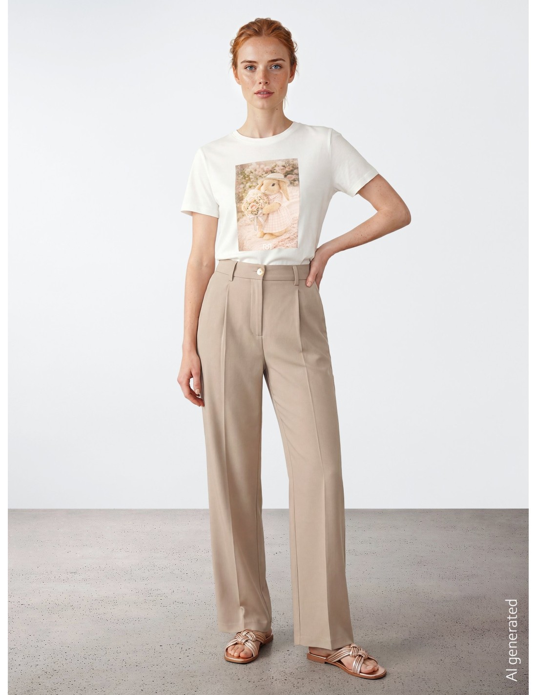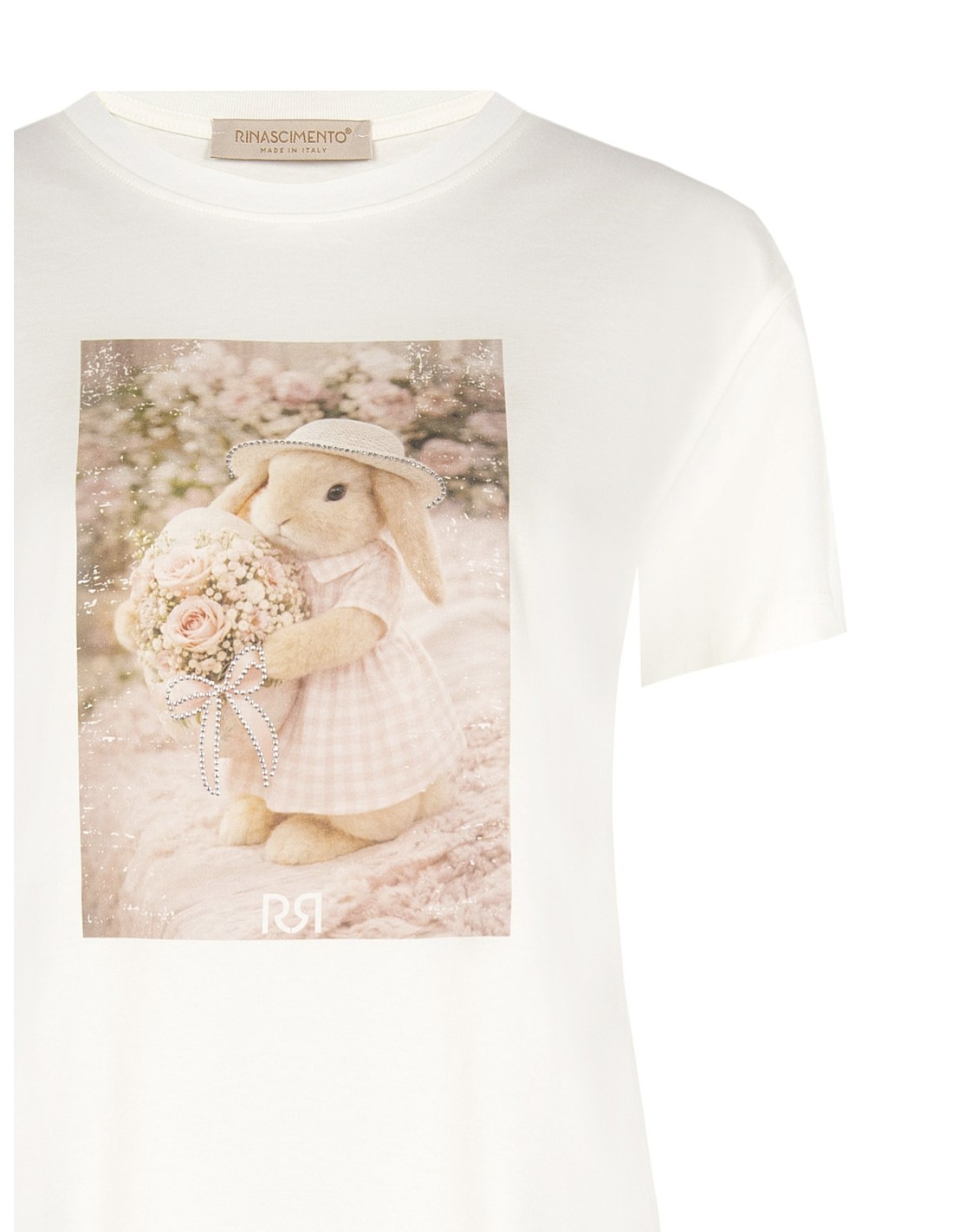 T-shirt em suave jersey com corte regular, concebida para acompanhar a silhueta com conforto e leveza. A gola redonda essencial e a estampagem frontal romântica com detalhes luminosos acrescentam um toque feminino. Perfeita para o tempo livre, o fim de semana e os looks do dia a dia mais cuidados.