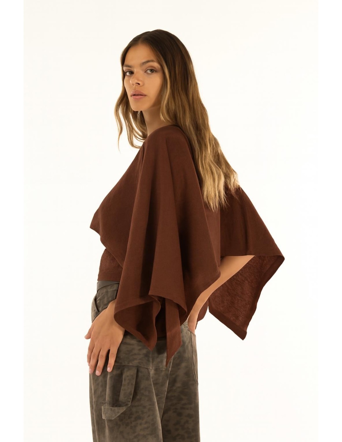 Top Kontatto com efeito bolero, de corte suave que contorna a cintura e valoriza a silhueta. Malha leve com um toque suave, agradável à pele. Mangas largas em forma de capa e decote em barco para um encanto fluido. Versátil sobre ganga ou saias: perfeito para todos os dias e aperitivos, com garantia de conforto e movimento.
