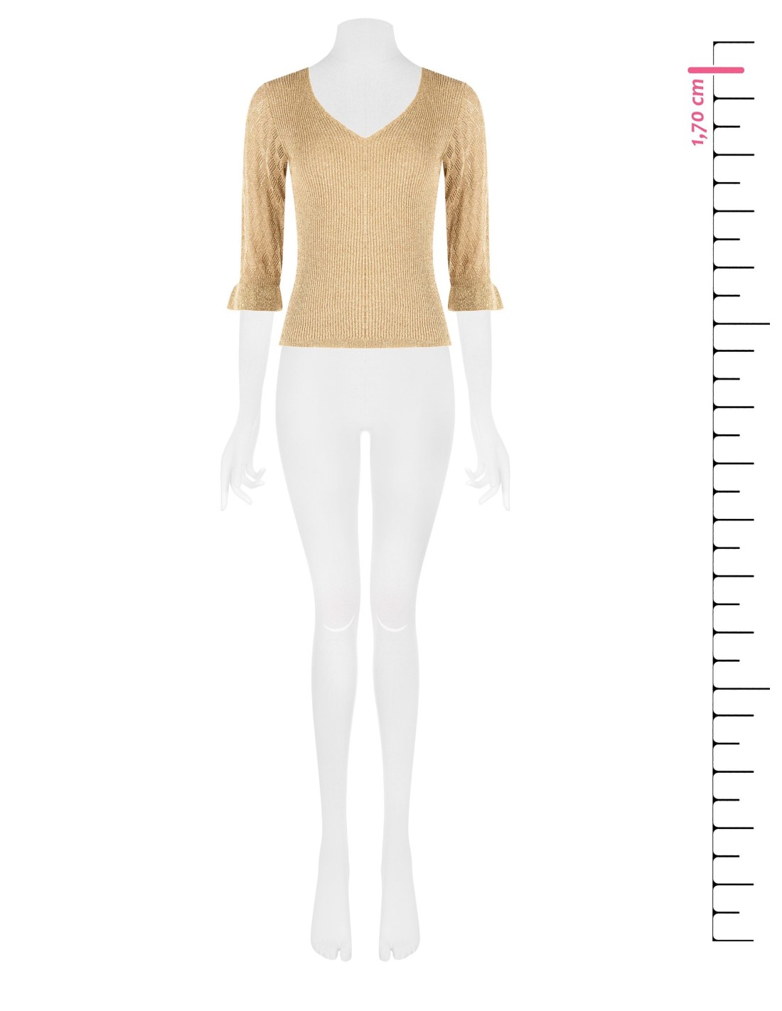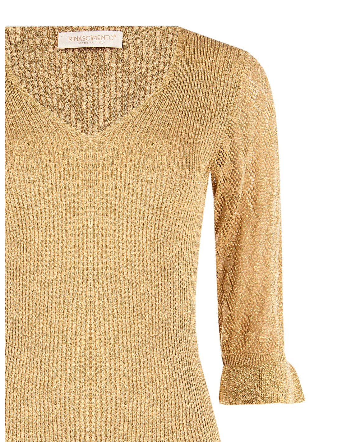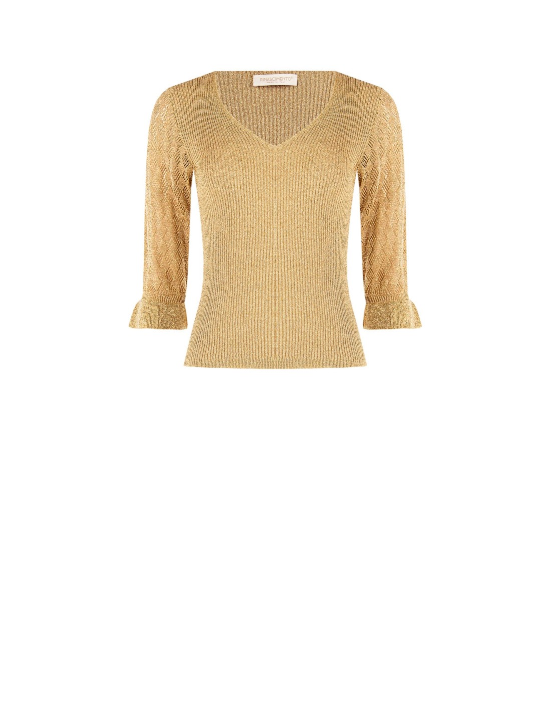 Camisola justa em malha canelada com fio laminado que valoriza a silhueta. Decote em V feminino, mangas três quartos ajuradas e punhos com folhos para um toque refinado. Perfeita com tailleur no escritório ou com denim e saltos para o aperitivo e a noite.