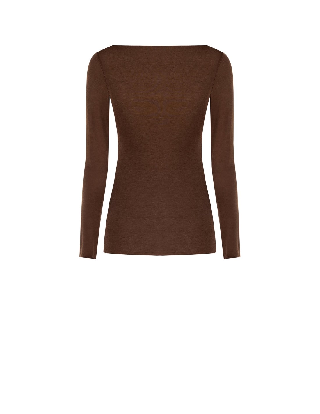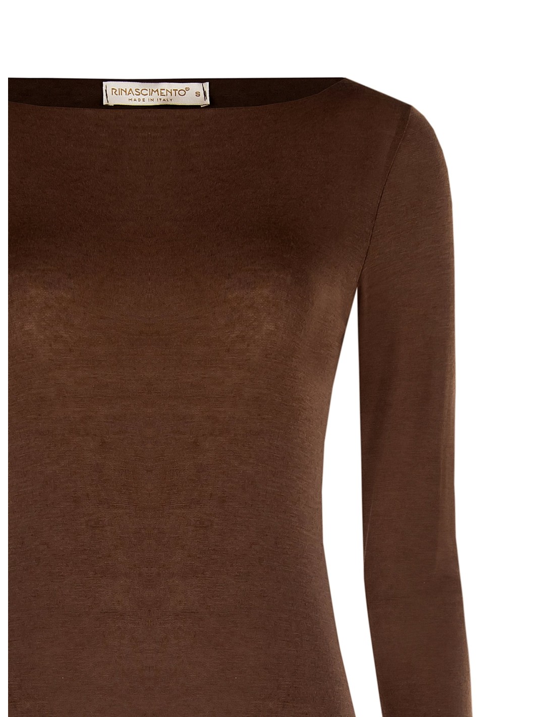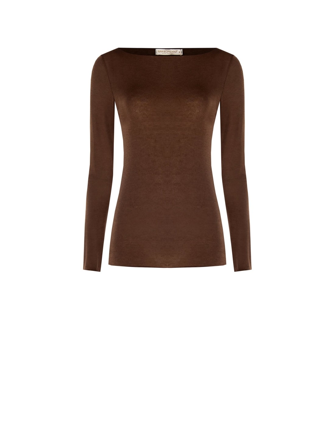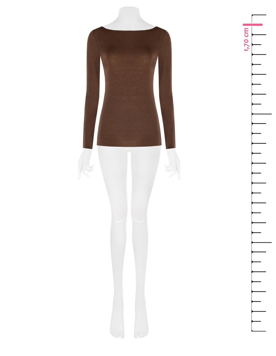 Corte justo que valoriza a silhueta, em suave jersey de viscose com elastano, agradável na pele durante todo o dia. O decote barco e as mangas compridas criam um perfil essencial e feminino, perfeito sozinho ou por baixo de um blazer para o escritório, para o lazer e para saídas noturnas.